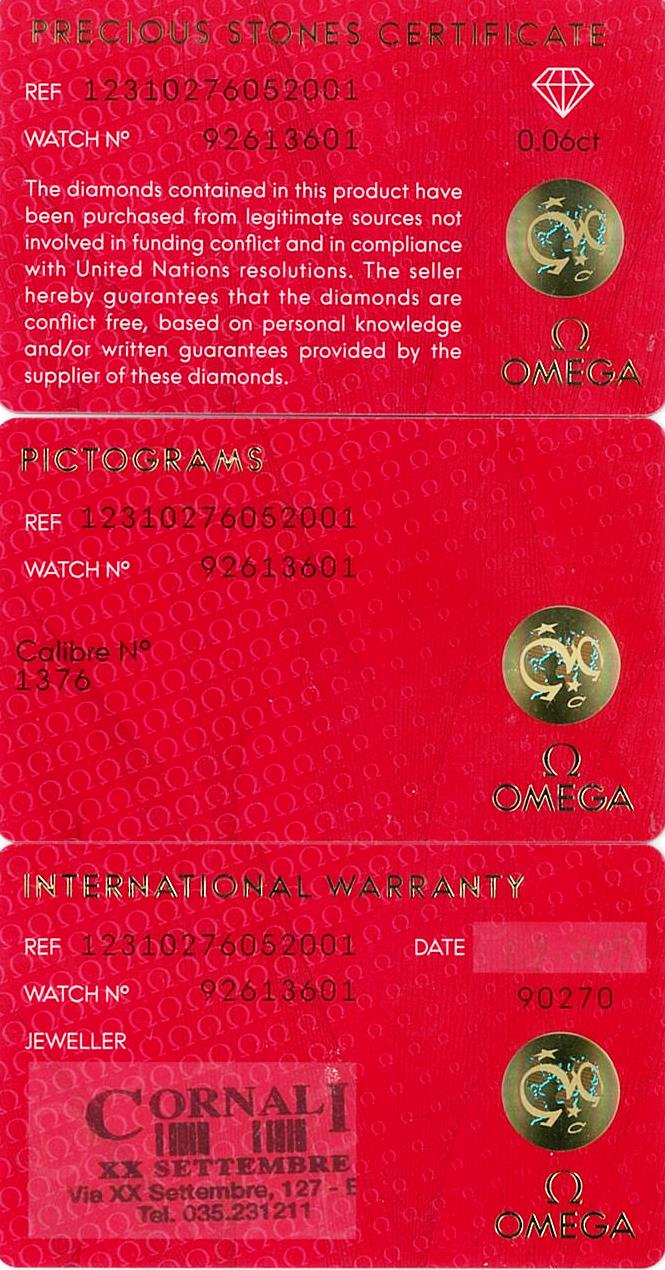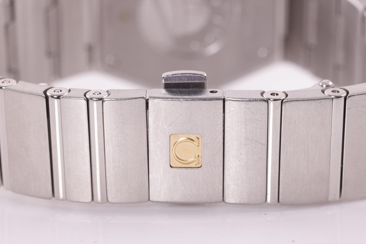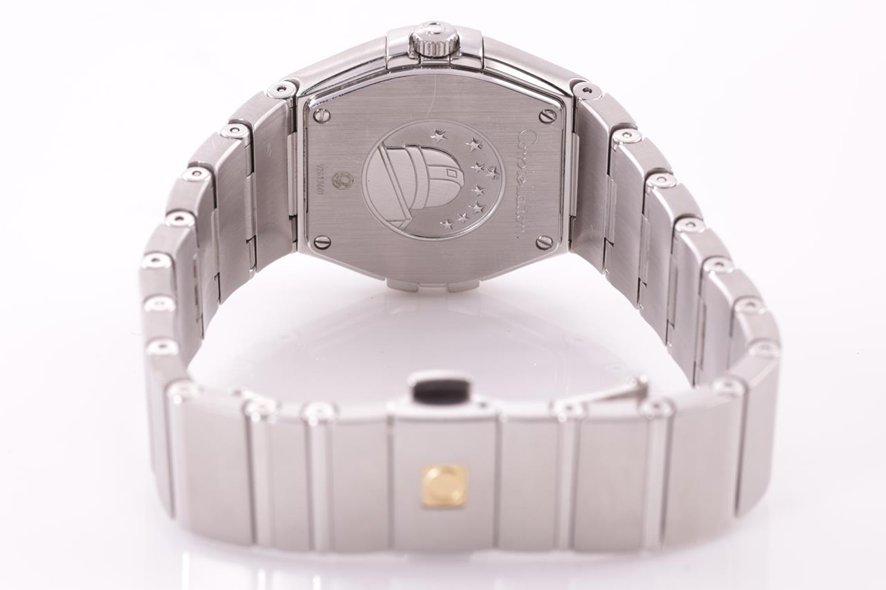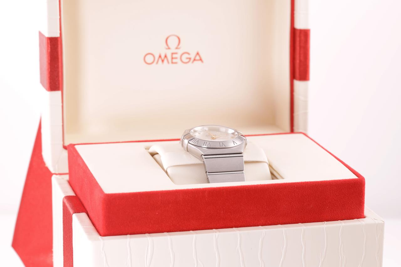 Omega Constellation stainless steel quartz ladies watch. Silk-like pattern dial, Diamond indicators, case diameter: 27mm, wrist size: 16cm, Swiss made. Ref# 123.10.27.60.52.001. With Omega stainless steel bracelet and clasp. With certificate of authenticity, Omega International warranty card dated 9/1/2017, precious stone certificate card and Omega box. 3 month FSA warranty. (Pre-owned)