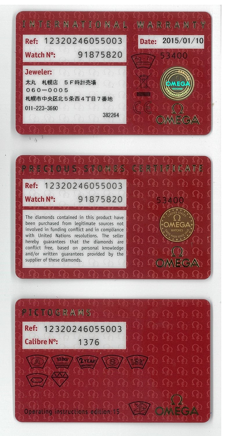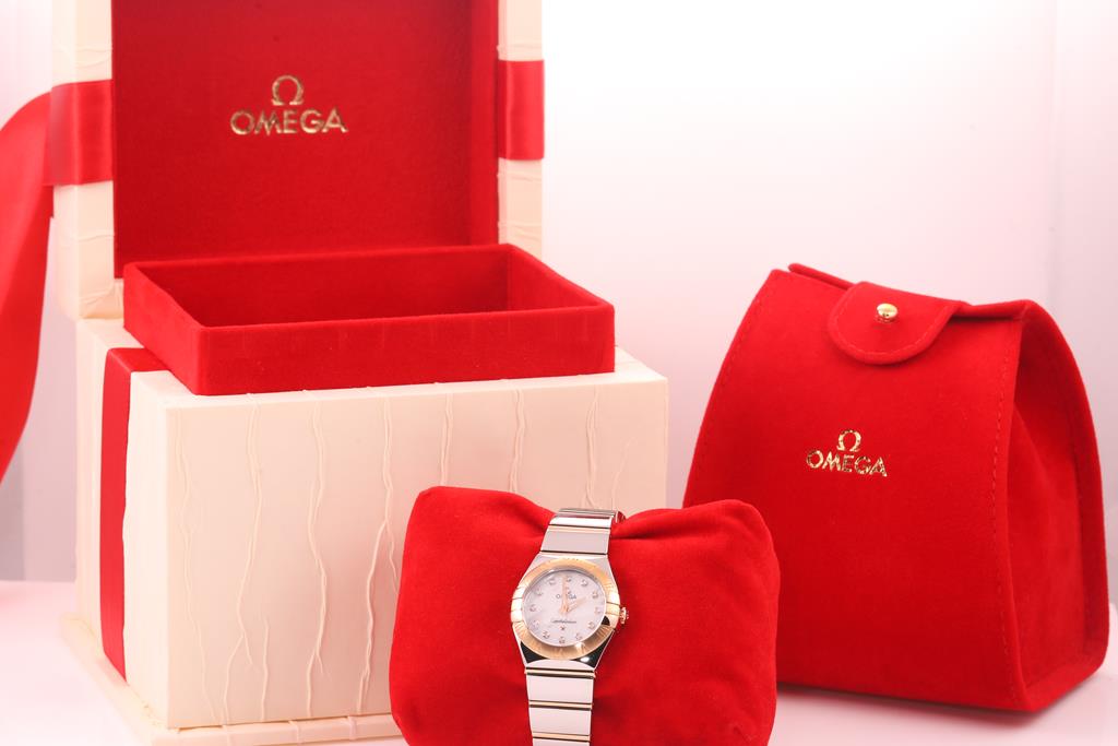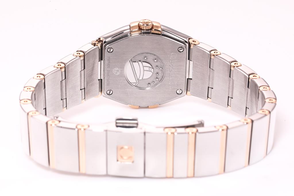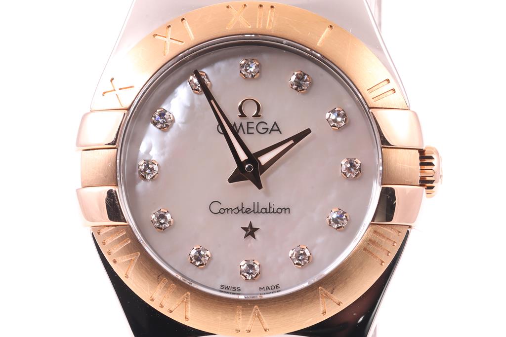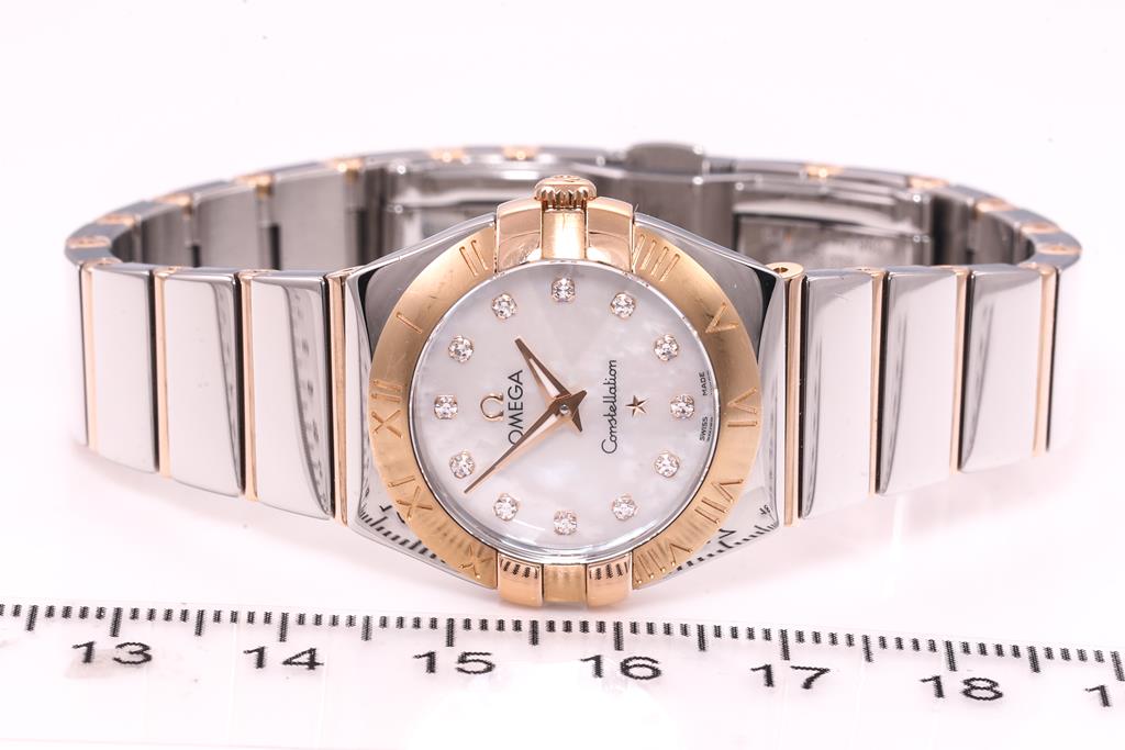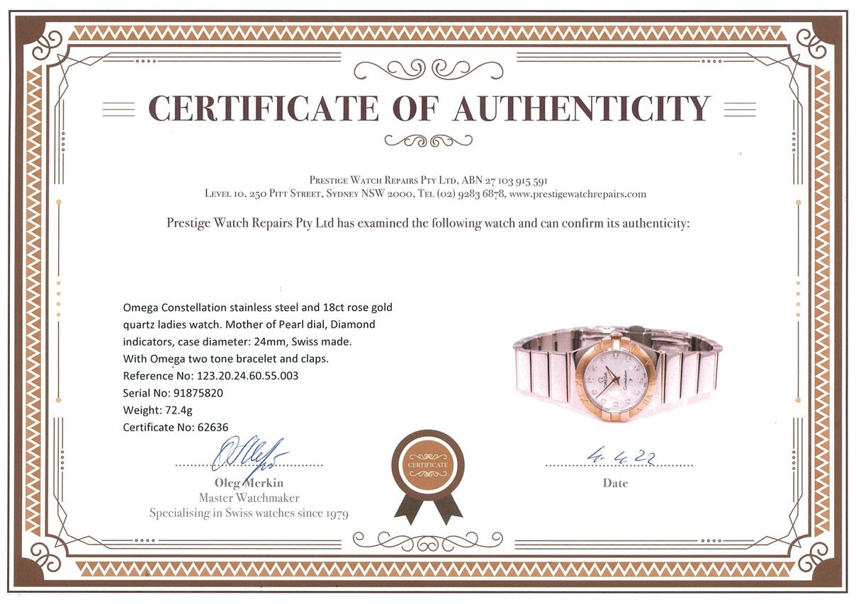 Omega Constellation stainless steel and 18ct rose gold quartz ladies watch. Mother of Pearl dial, Diamond indicators, case diameter: 24mm, wrist size: 16cm, Swiss made. Ref# 123.20.24.60.55.003, Circa: 2010. With Omega two tone bracelet and claps. With Certificate of Authenticity, Omega International Warranty Card dated 10/01/2015, Pictograms Card, Precious Stone Certificate Card and Omega box. 3 month FSA warranty. (Pre-owned)