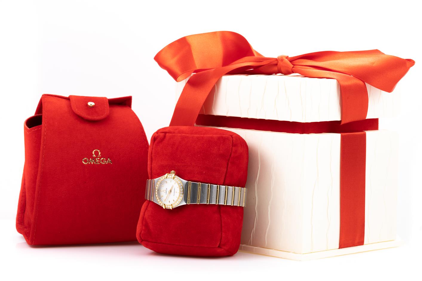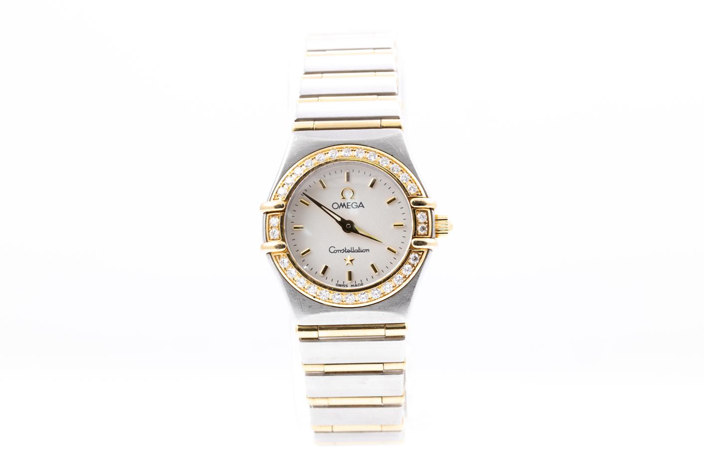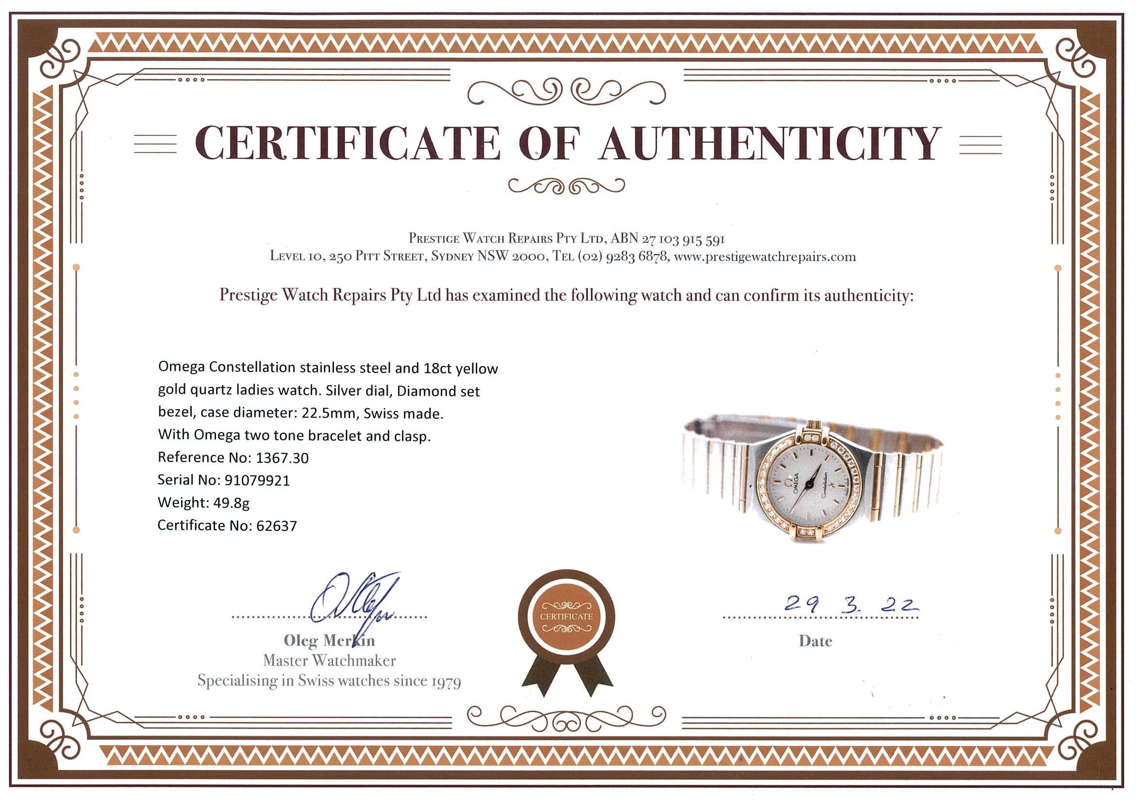 Omega Constellation stainless steel and 18ct yellow gold quartz ladies watch. Silver dial, Diamond set bezel, case diameter: 22.5mm, wrist size: 17cm, Swiss made, Ref# 1367.30. Circa: 2010. With Omega two tone bracelet and clasp. With Certificate of Authenticity and Omega box. 3 month FSA warranty. (Pre-owned)