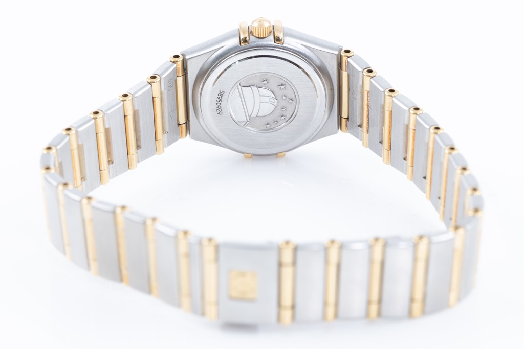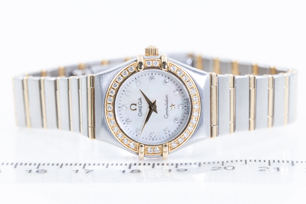 Omega Constellation stainless steel and 18 yellow gold quartz ladies watch. Mother of Pearl dial, Diamond indicators and Diamond set bezel, case diameter: 22.5mm, wrist size: 16.5 cm, Swiss made. Ref# 1267.75. With Omega two tone bracelet and clasp. With Certificate of Authenticity, Omega International Warranty Card, Pictograms Card, Precious Stone Certificate Card and Omega box. 3 month FSA warranty. (Pre-owned)