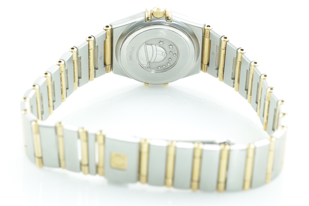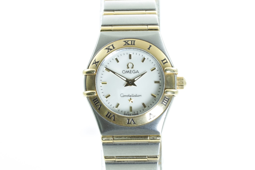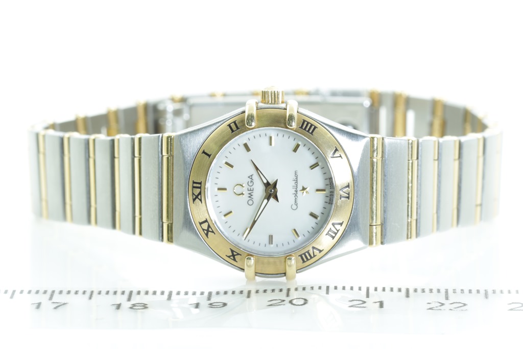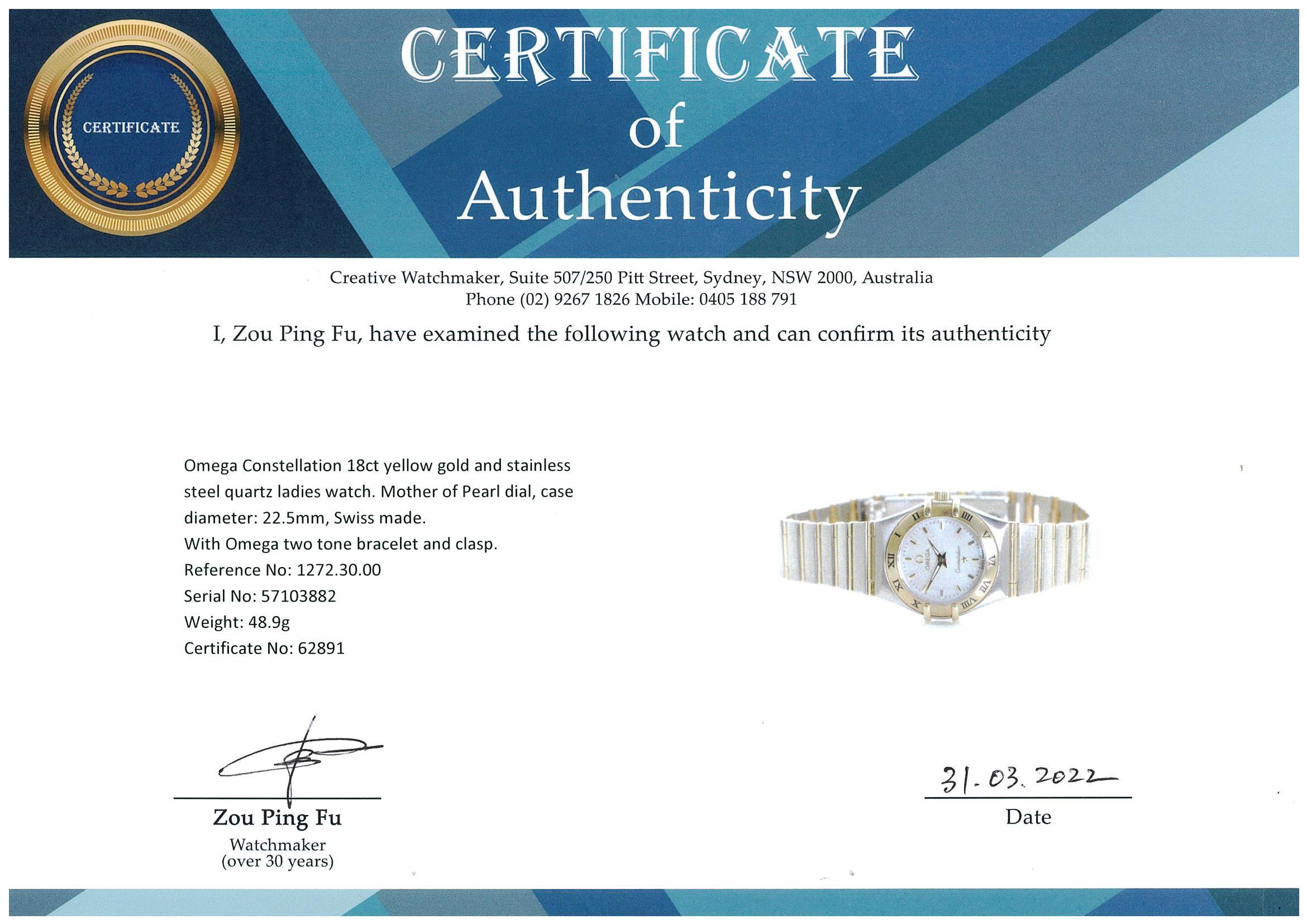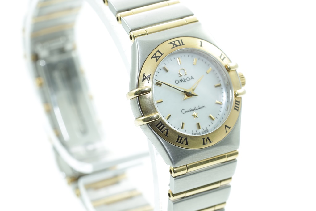 Omega Constellation 18ct yellow gold and stainless steel quartz ladies watch. Mother of Pearl dial, case diameter: 22.5mm, wrist size: 17cm, Swiss made. Ref# 1272.30.00. With Omega two tone bracelet and clasp. With Certificate of Authenticity. 3 month FSA warranty. 3 month FSA warranty. (Pre-owned)
