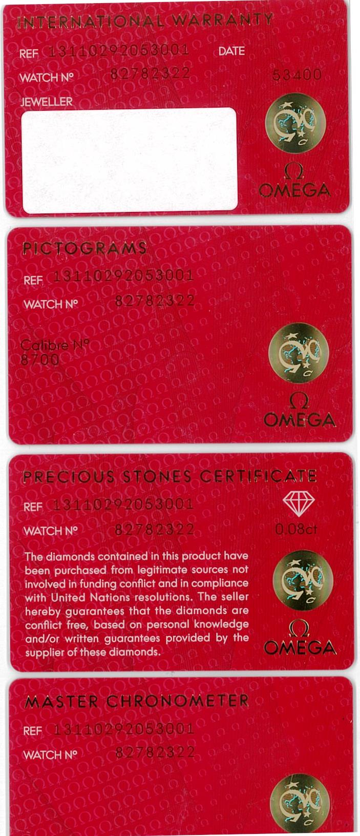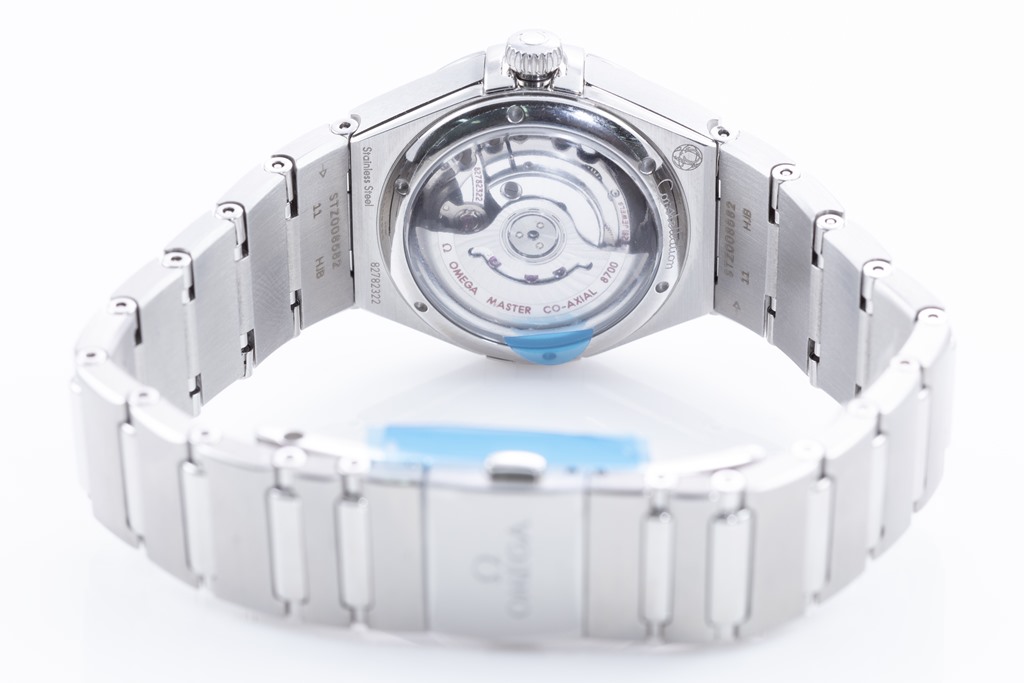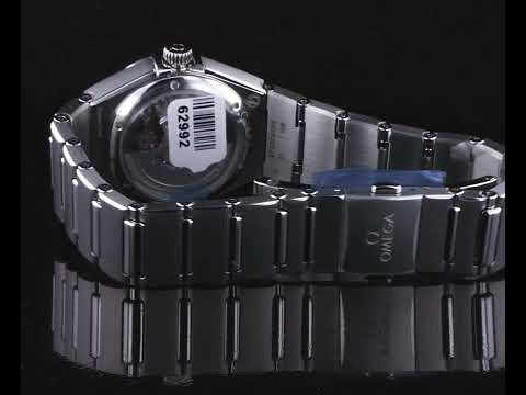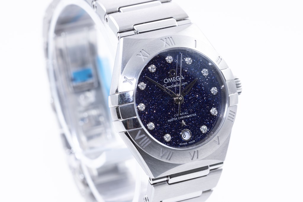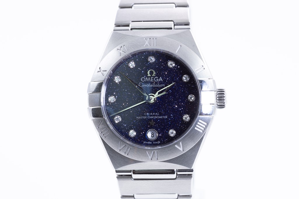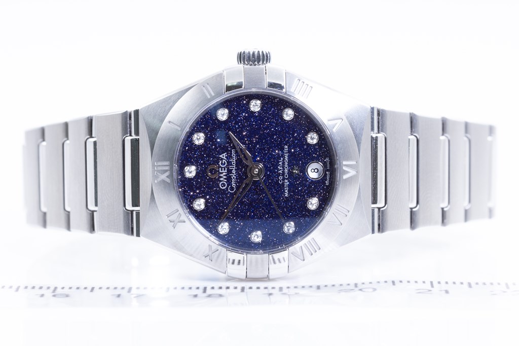 Omega Constellation stainless steel automatic ladies watch. Blue dial, date, Diamond indicators, case diameter: 29mm, wrist size: 17cm, Swiss made. Ref# 131.10.29.20.53.001. Circa: 2007. With Omega stainless steel bracelet and clasp. With Certificate of Authenticity, Omega International Warranty Card, Precious Stones Certificate Card, Master Chronometer Card, Pictograms card and Omega box. 3 month FSA warranty. (Pre-owned)