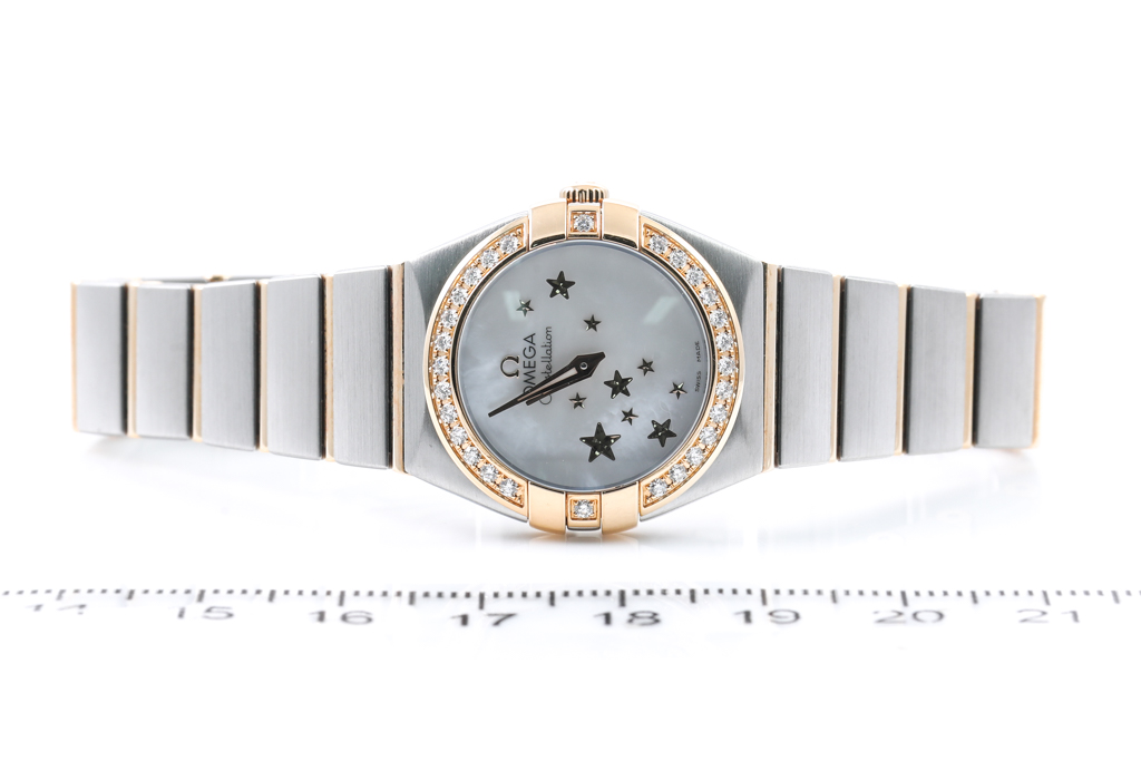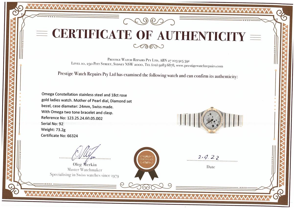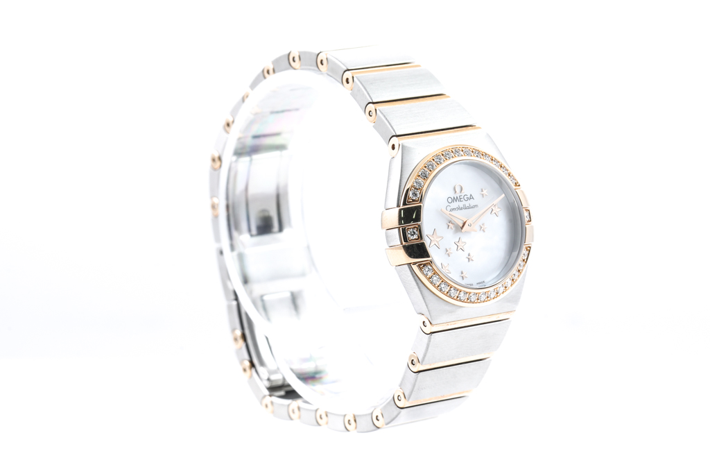 Omega Constellation stainless steel and 18ct rose gold ladies watch. Mother of Pearl dial, Diamond set bezel, case diameter: 24mm, wrist size: 16cm, Swiss made. Ref# 123.25.24.60.05.002. With Omega two tone bracelet and clasp. With Certificate of Authenticity, Omega International Warranty card, Pictograms card, Precious Stones Certificate Card and Omega box. 3 month FSA warranty. (Pre-owned)
