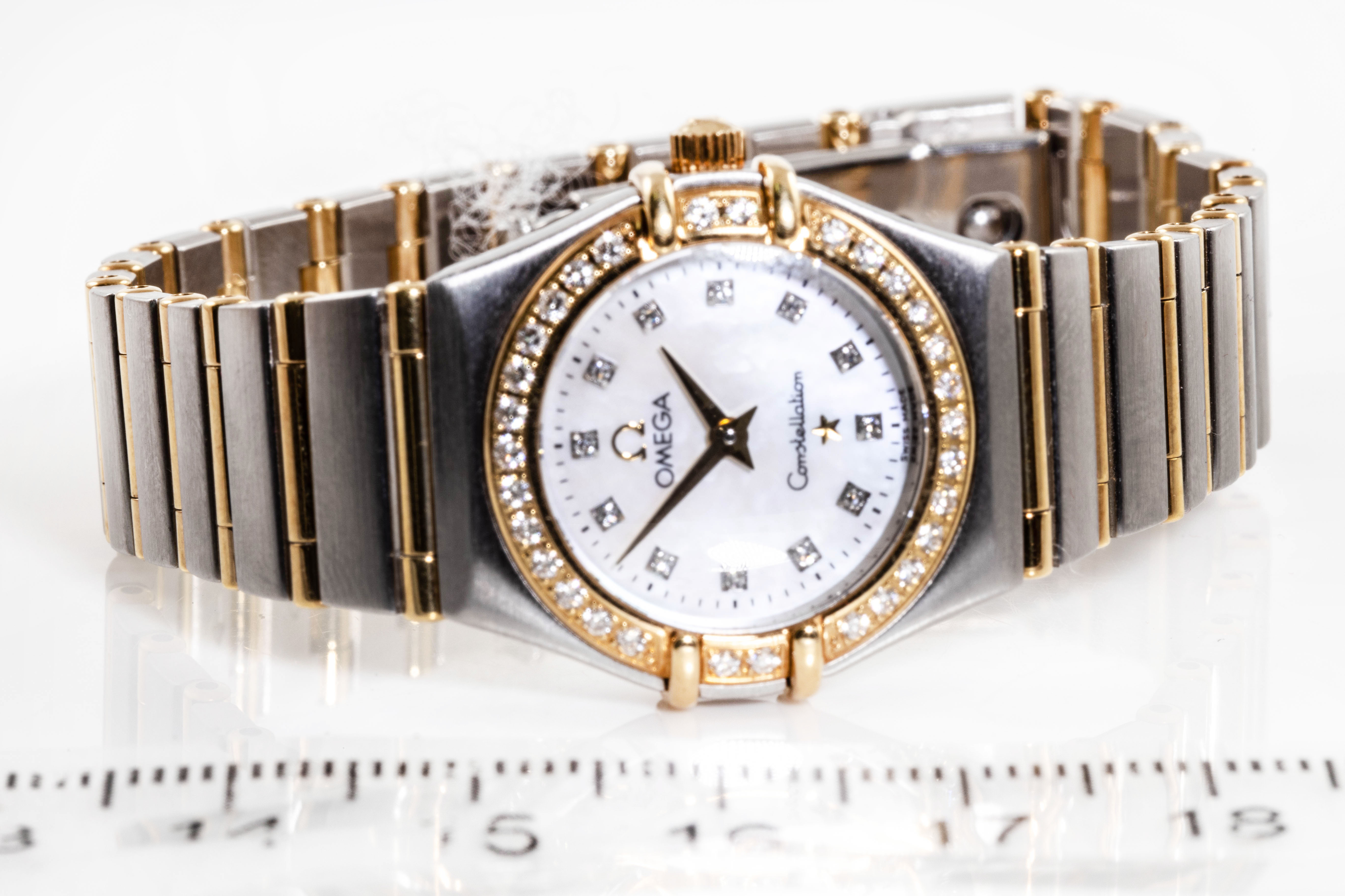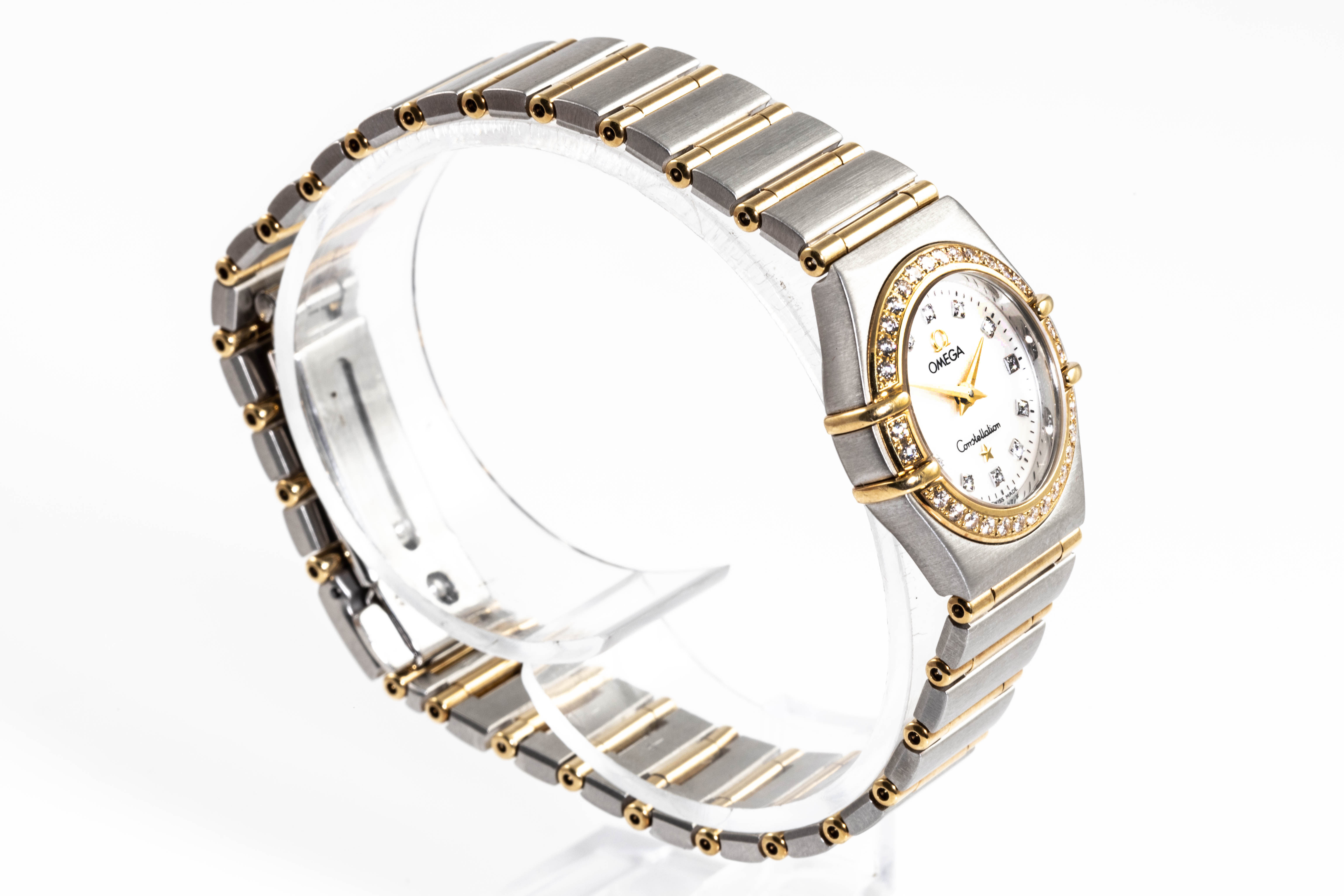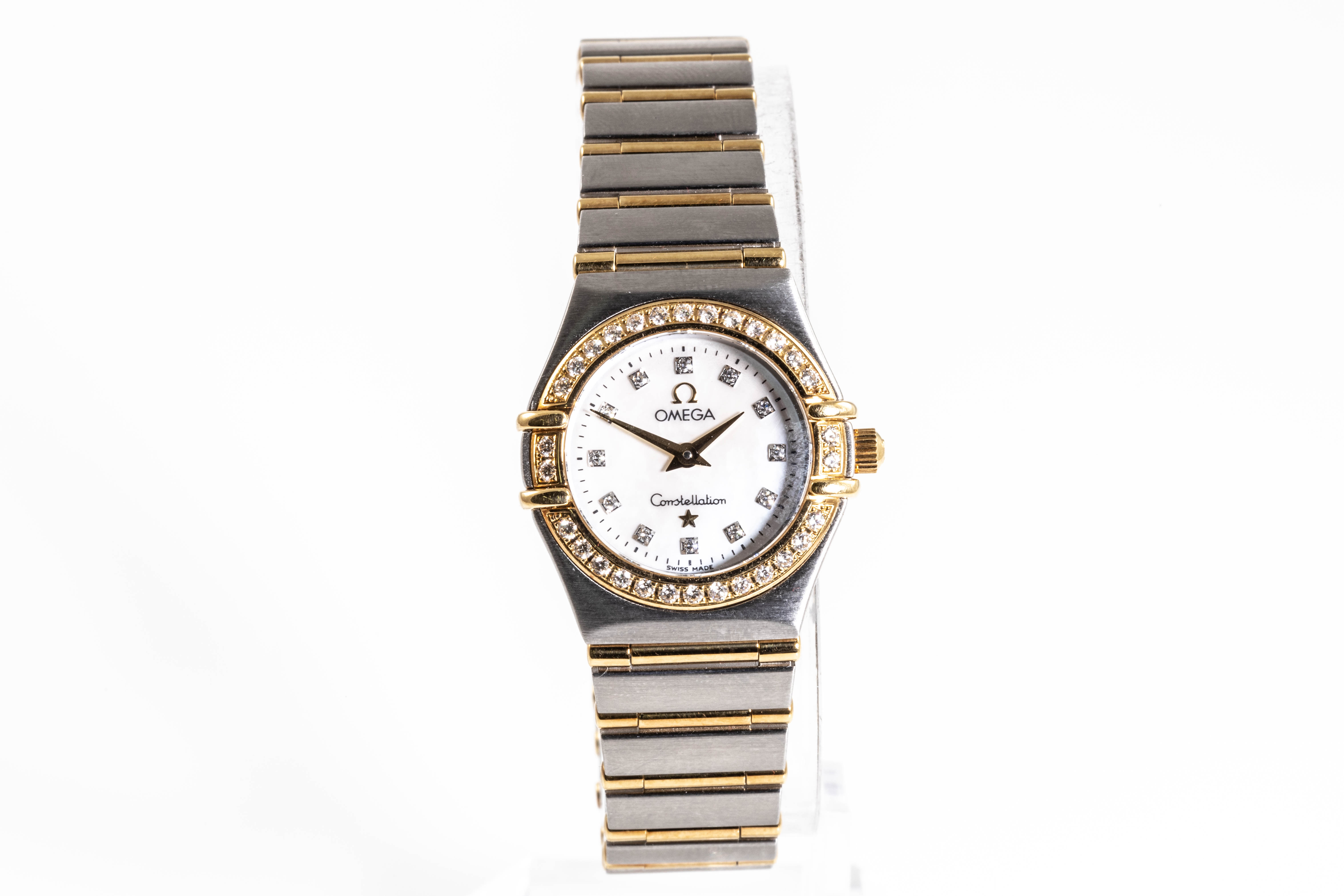 Omega Constellation stainless steel and 18ct yellow gold quartz ladies watch. Mother of Pearl dial, Diamond indicators and Diamond set bezel, case diameter: 22.5mm, wrist size: 17cm, Swiss made. Ref# 1267.75. With Omega two tone bracelet and clasp. With Certificate of Authenticity, Omega International Warranty Card, Pictograms card, Precious Stone Certificate card and Omega pouch. 3 month FSA warranty. (Pre-owned)
