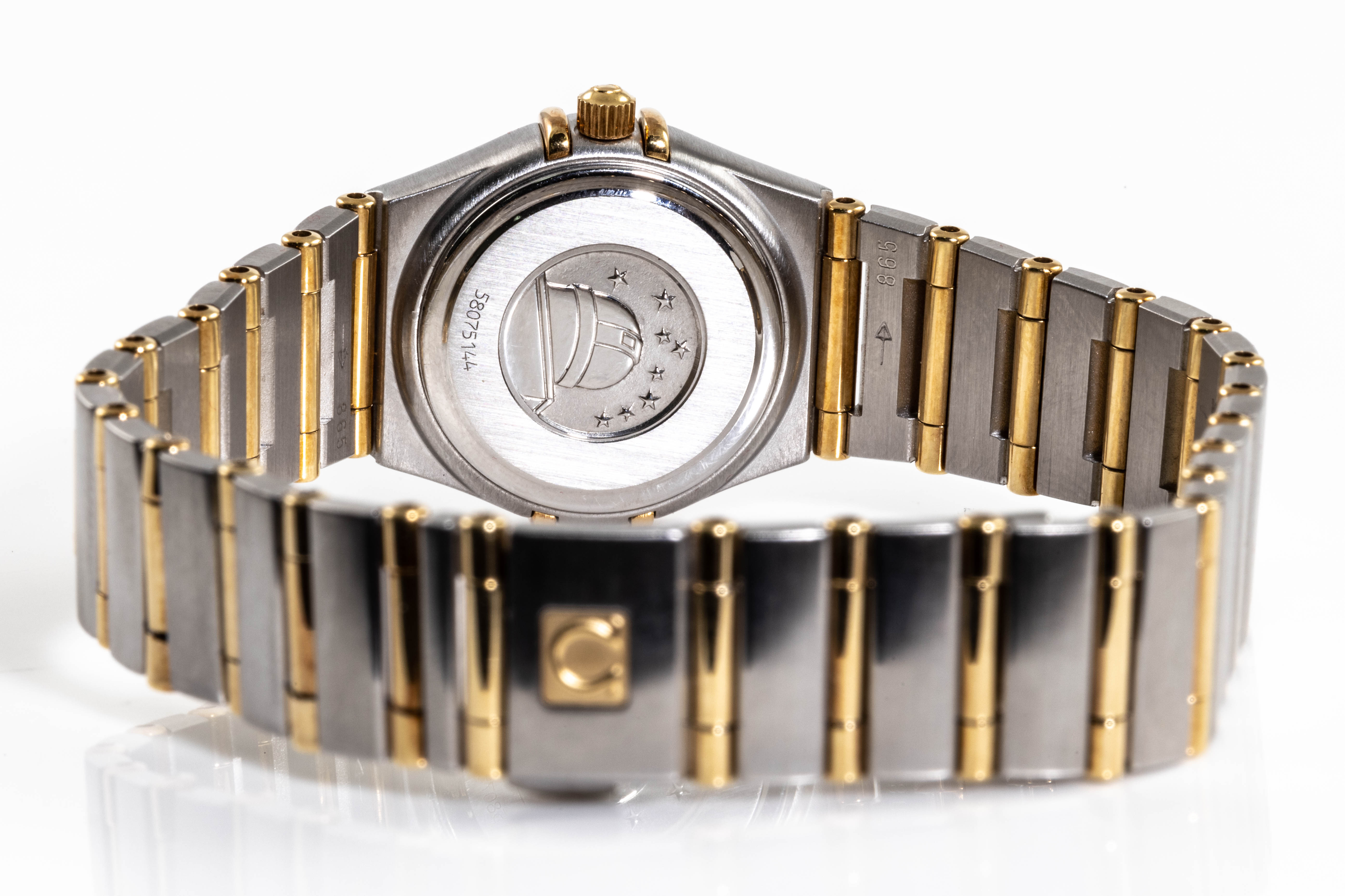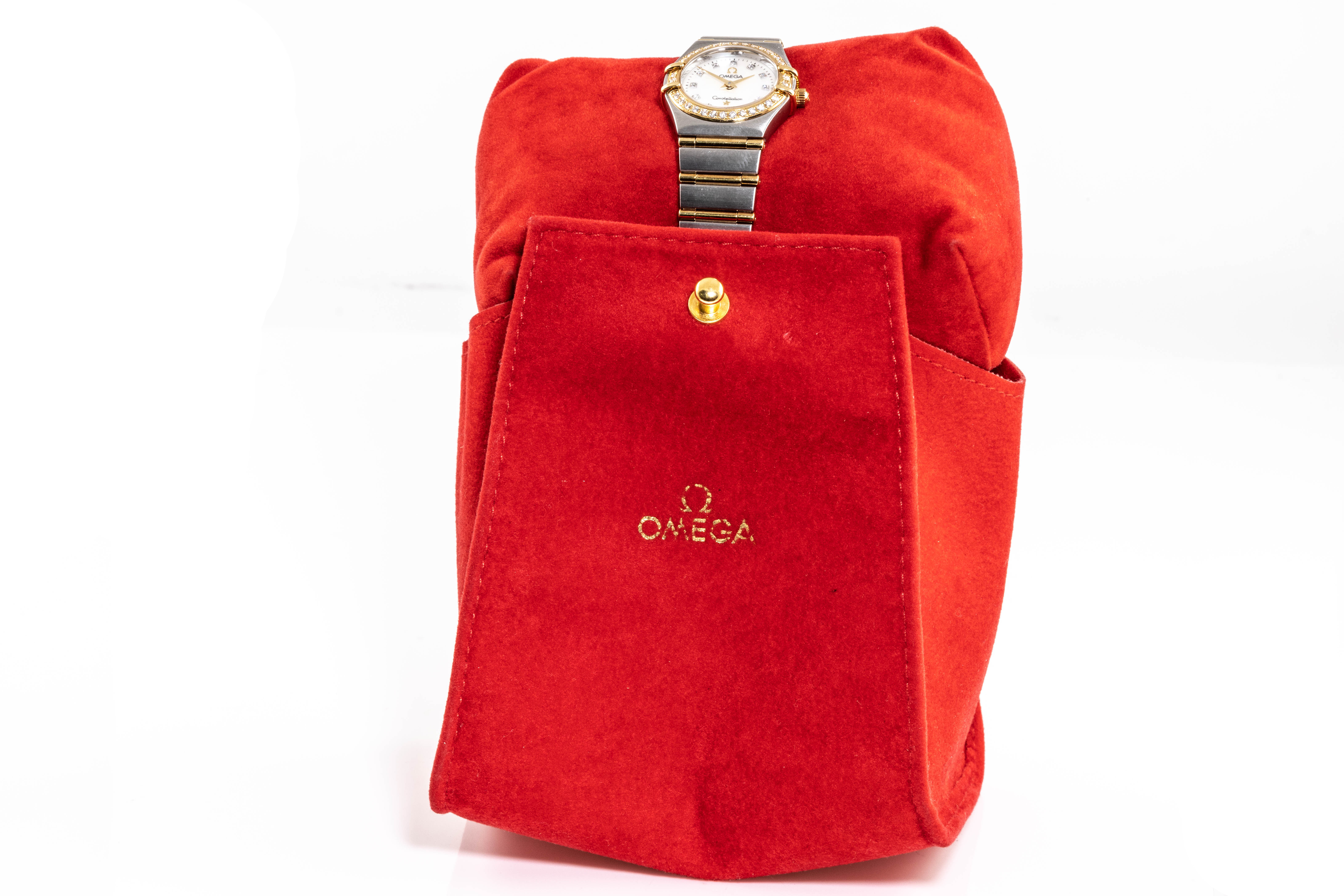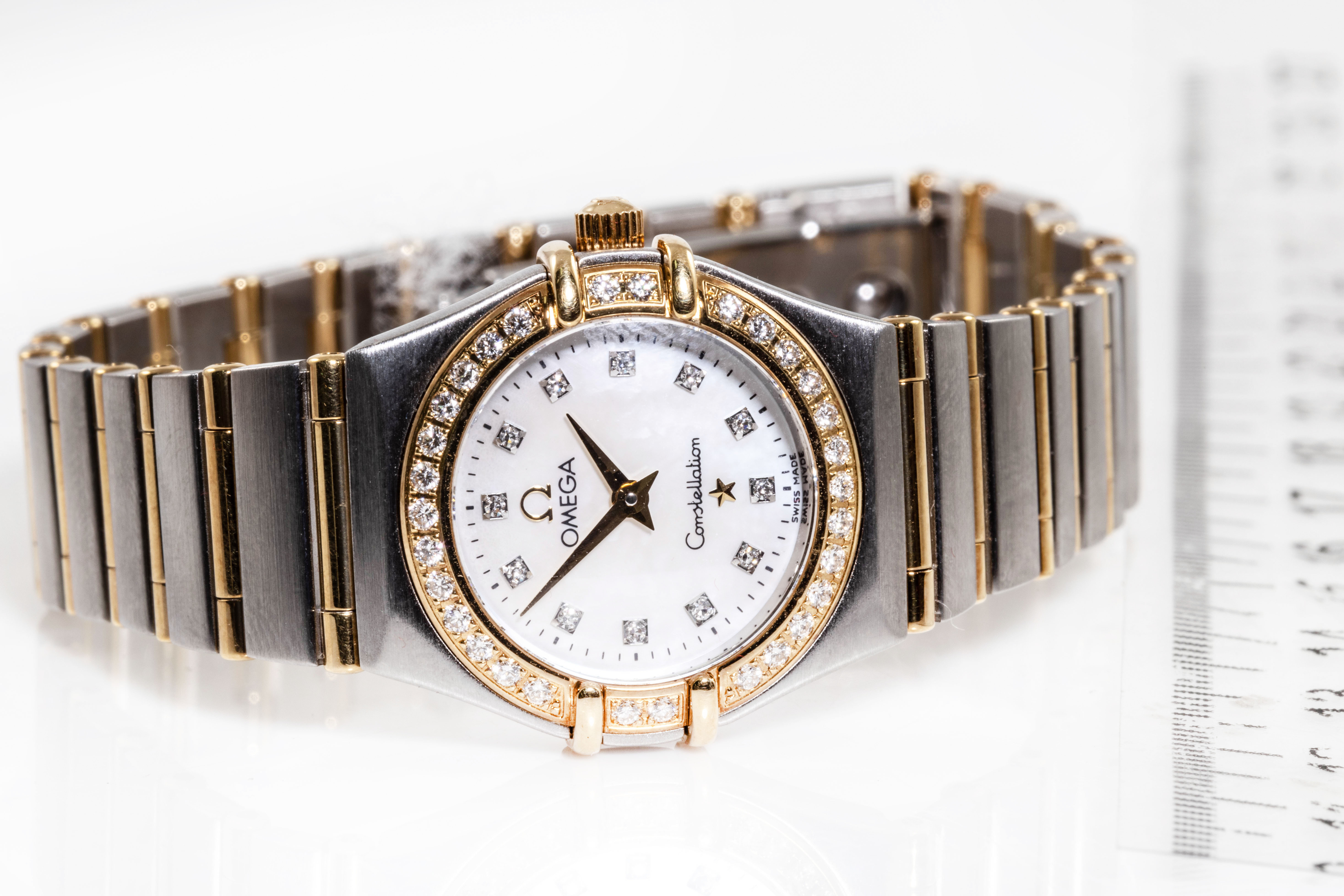 Omega Constellation stainless steel and 18ct yellow gold quartz ladies watch. Mother of Pearl dial, Diamond indicators and Diamond set bezel, case diameter: 22.5mm, wrist size: 17cm, Swiss made. Ref# 1267.75. With Omega two tone bracelet and clasp. With Certificate of Authenticity, Omega International Warranty Card, Pictograms card, Precious Stone Certificate card and Omega pouch. 3 month FSA warranty. (Pre-owned)