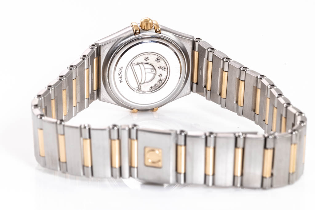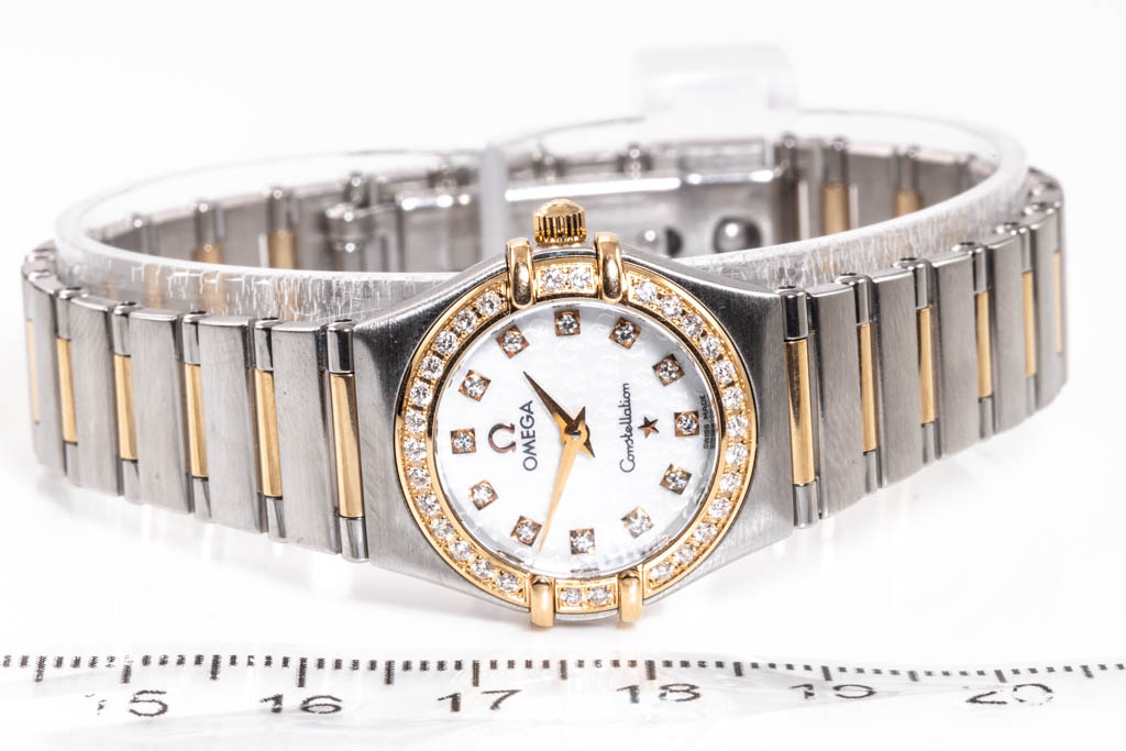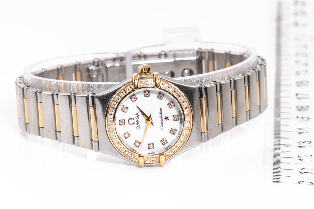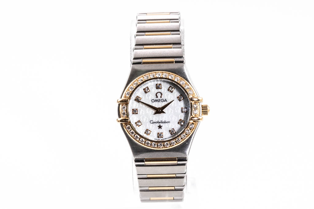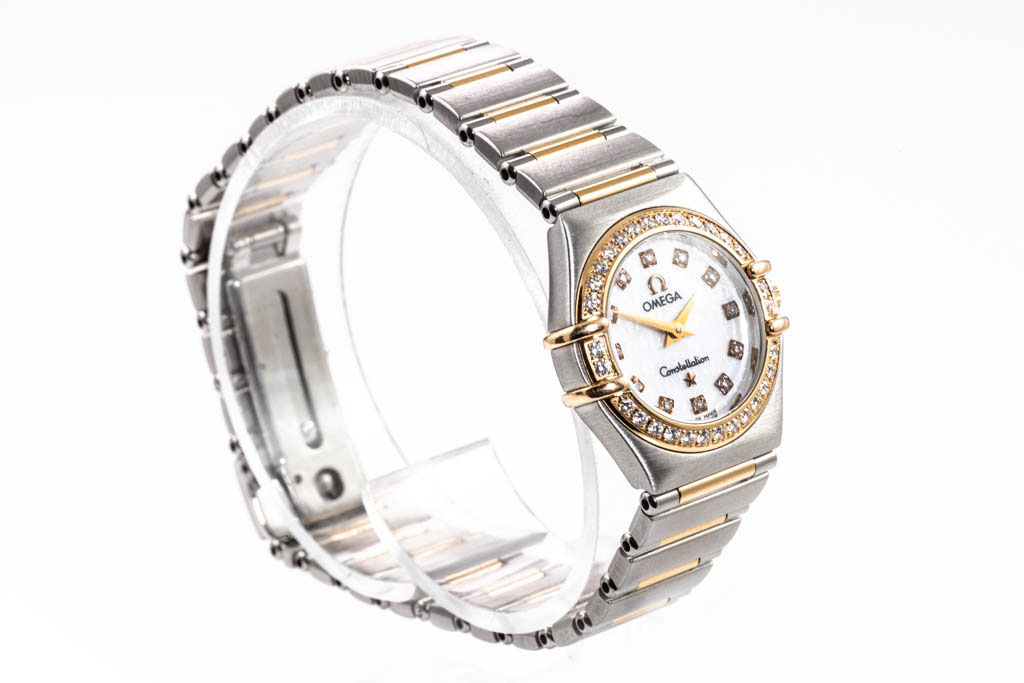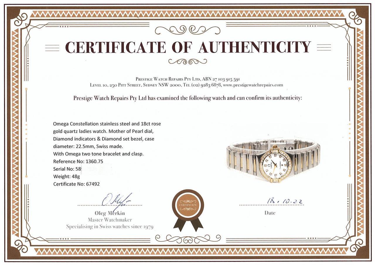 Omega Constellation stainless steel and 18ct rose gold quartz ladies watch. Mother of Pearl dial, Diamond indicators & Diamond set bezel, case diameter: 22.5mm, wrist size: 17cm, Swiss made. Ref# 1360.75. With Omega two tone bracelet and clasp. With Certificate of Authenticity. 3 month FSA warranty. (Pre-owned)