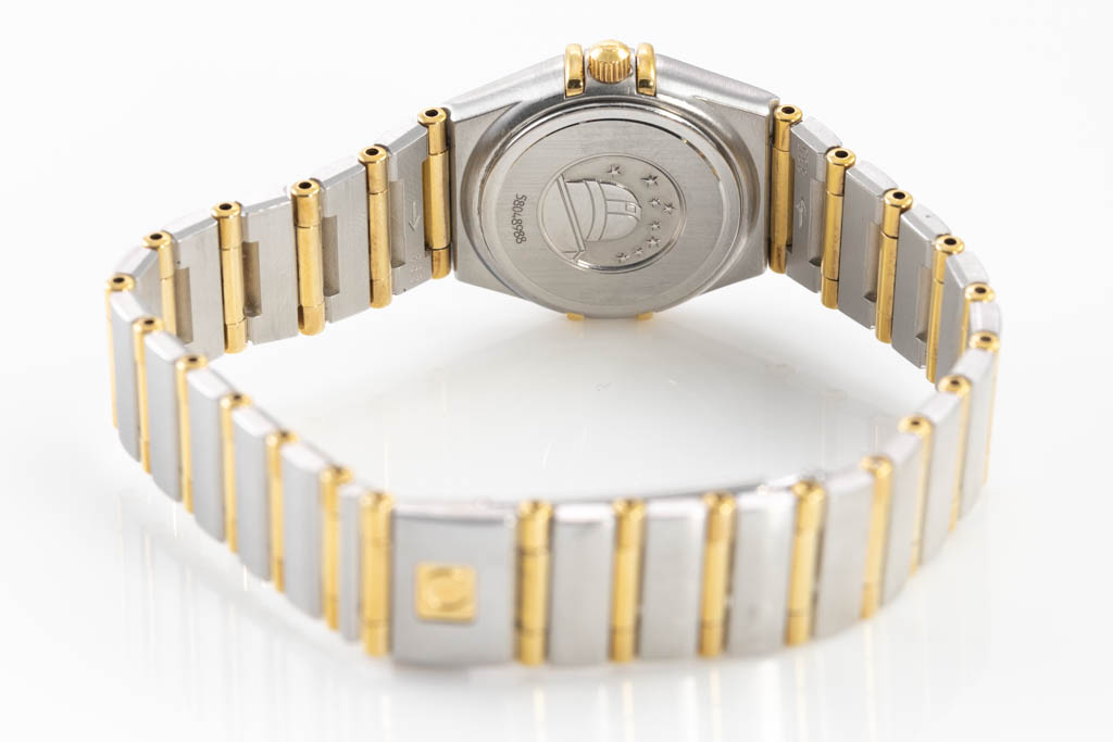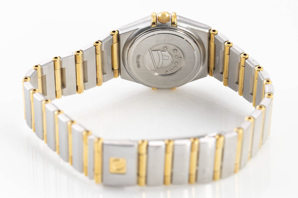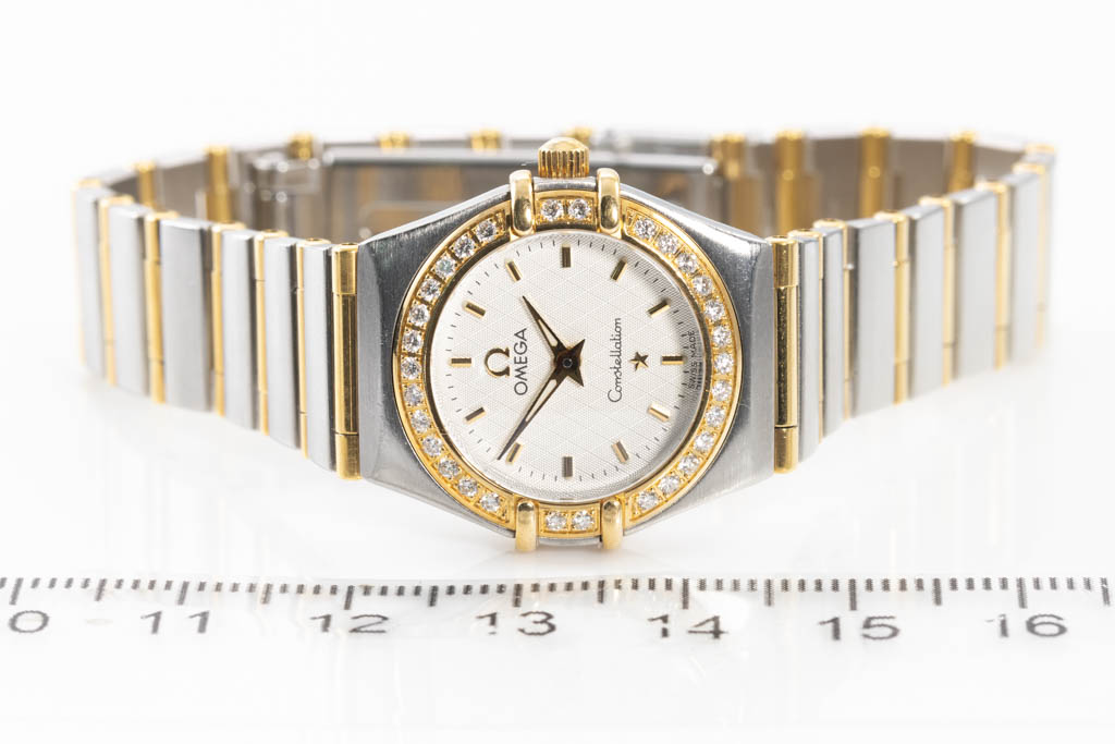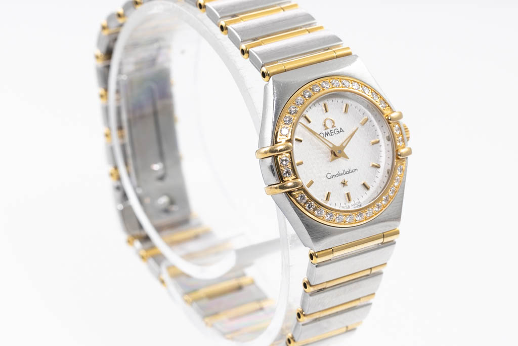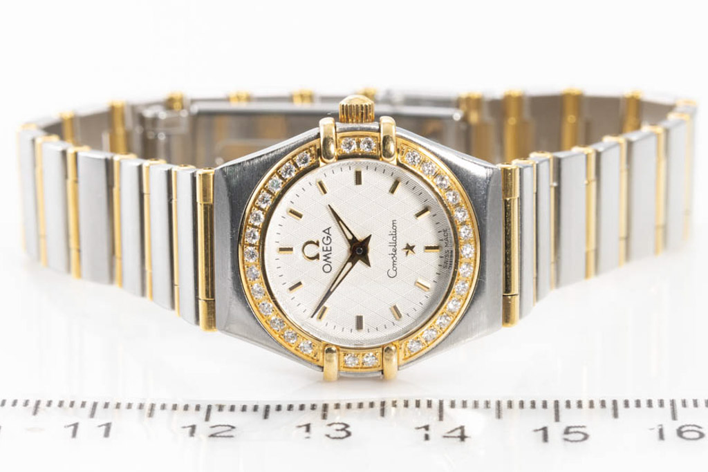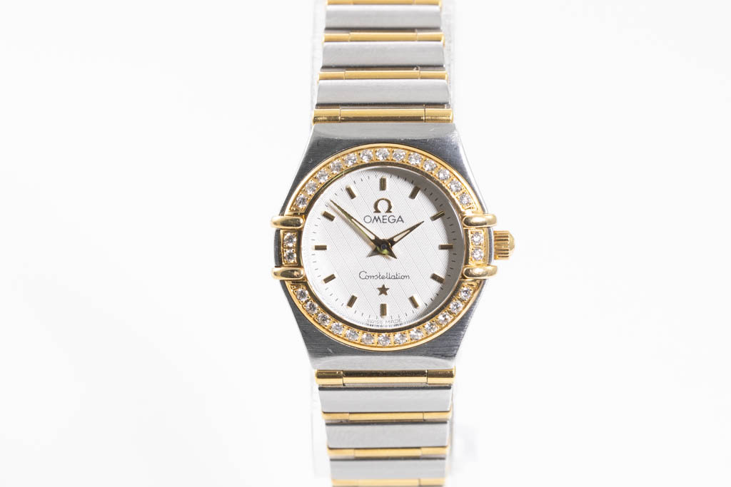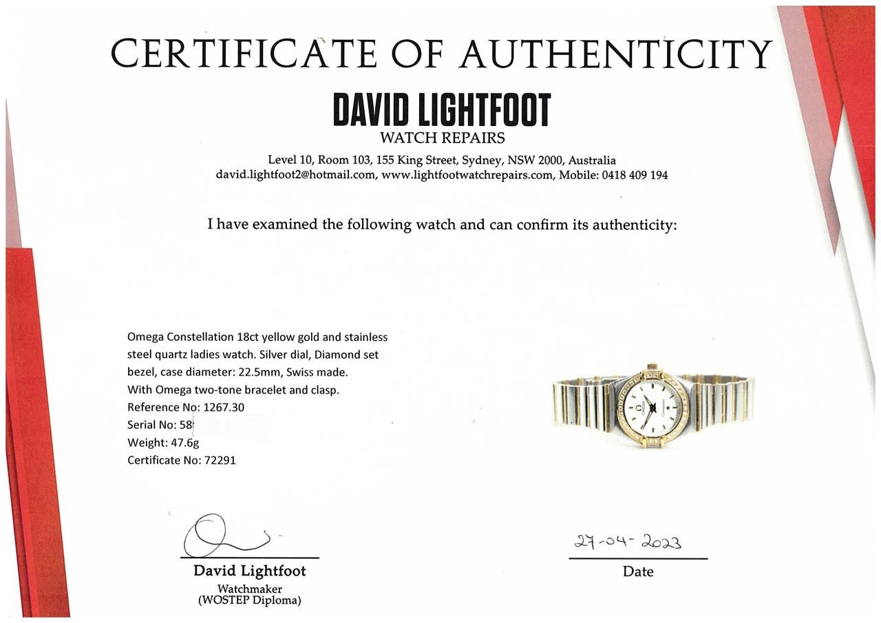 Omega Constellation 18ct yellow gold and stainless steel quartz ladies watch. Silver dial, Diamond set bezel, case diameter: 22.5mm, wrist size: 16cm, Swiss made. Ref# 1267.30. With Omega two-tone bracelet and clasp. With Certificate of Authenticity. 3 month FSA warranty. (Pre-owned)
