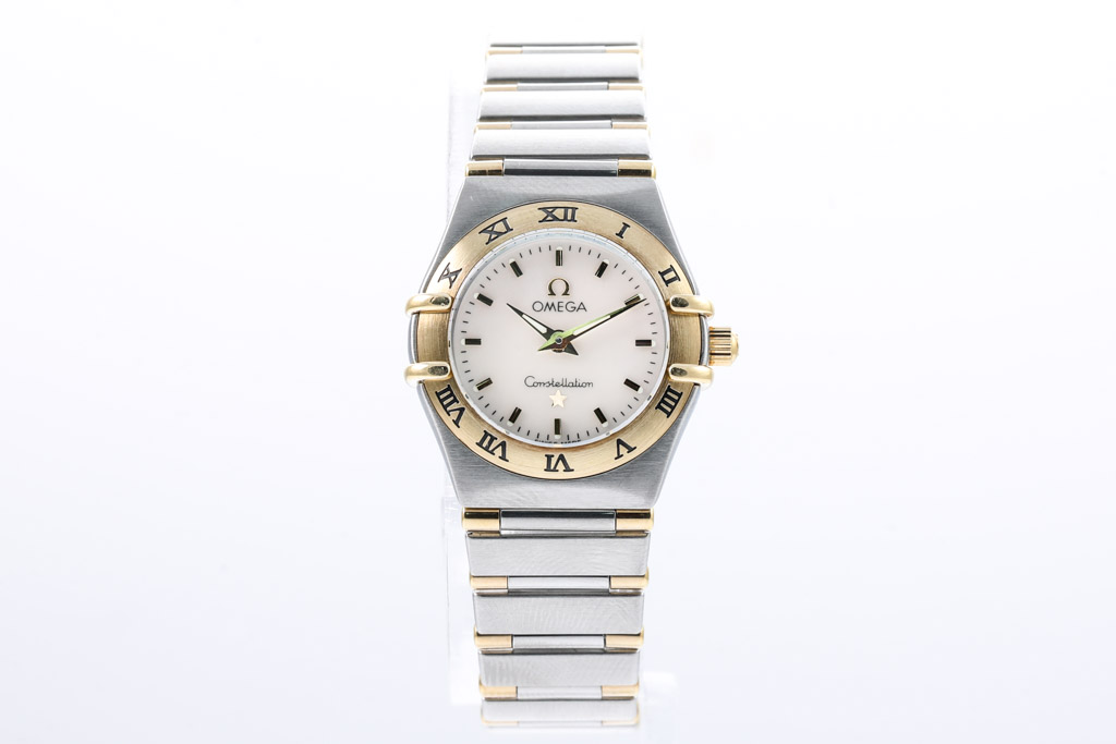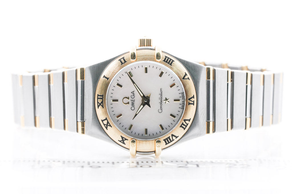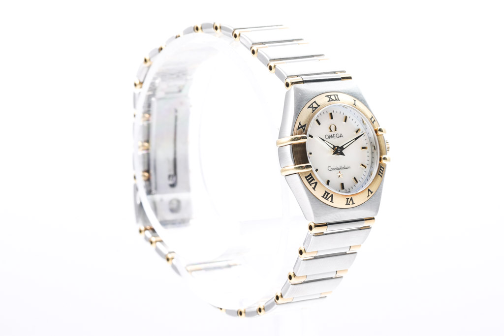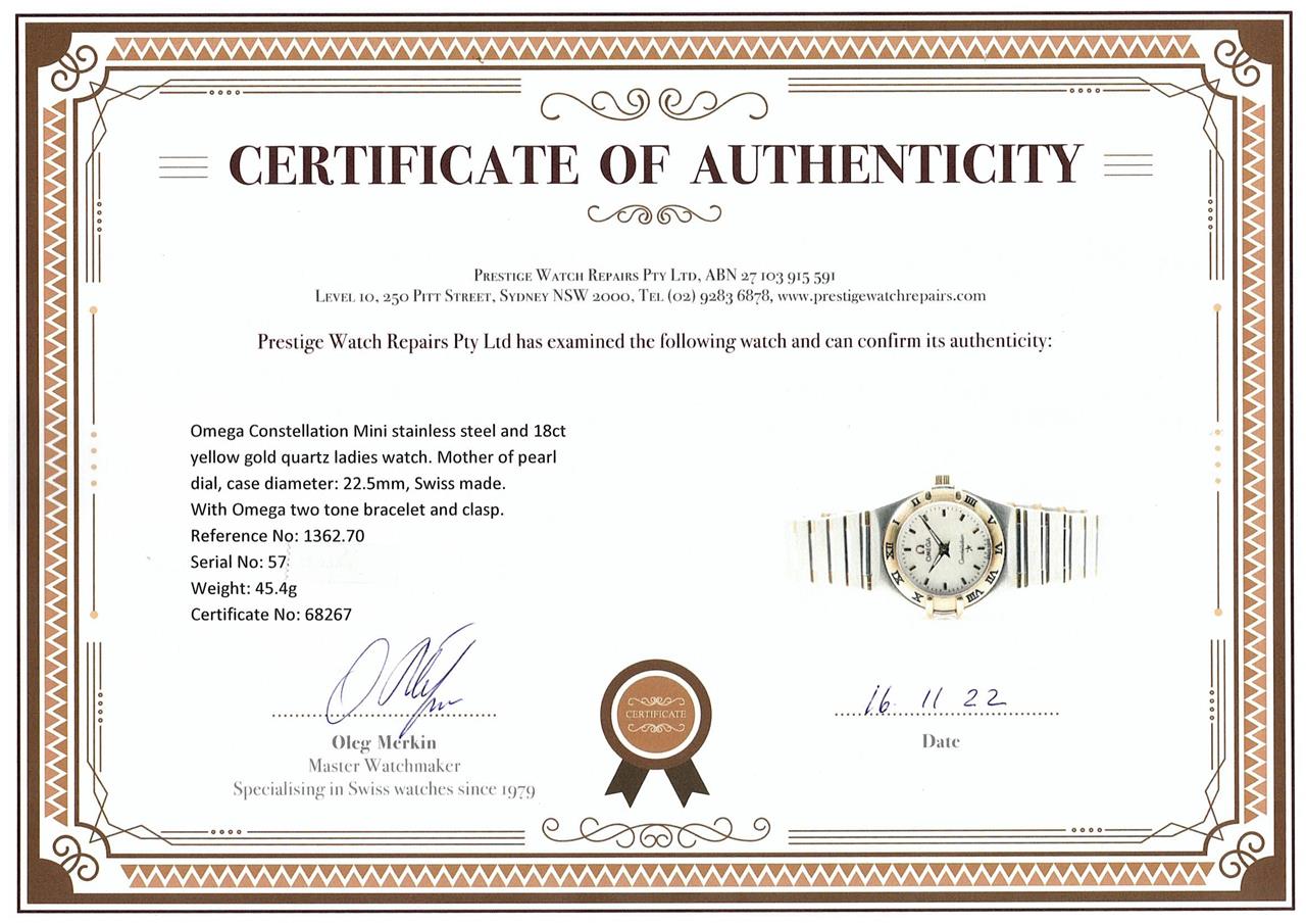 Omega Constellation Mini stainless steel and 18ct yellow gold quartz ladies watch. Mother of pearl dial, case diameter: 22.5mm, wrist size: 15.5cm, Swiss made. Ref# 1362.70. With Omega two tone bracelet and clasp. With Certificate of Authenticity and Omega International Warranty Card. 3 month FSA warranty. (Pre-owned)
