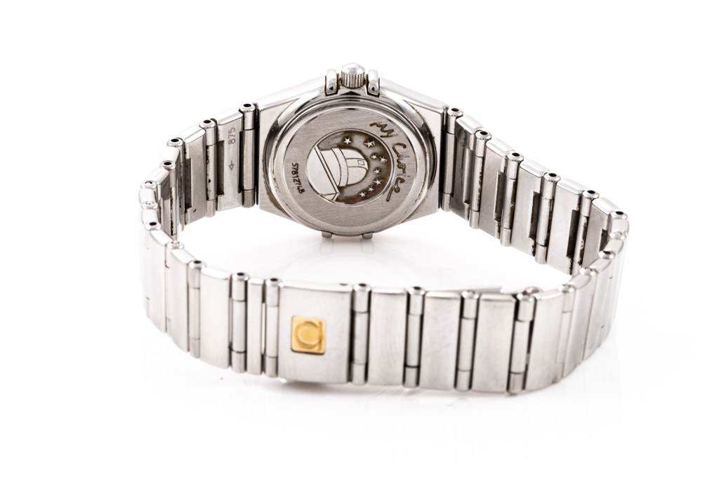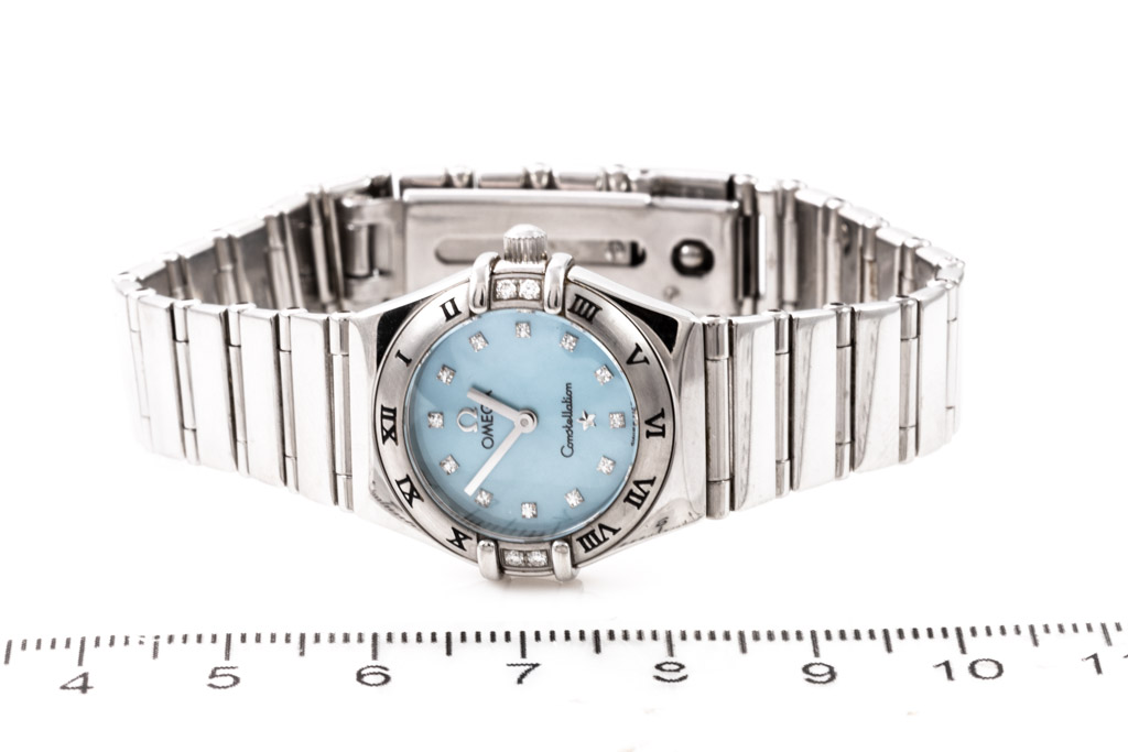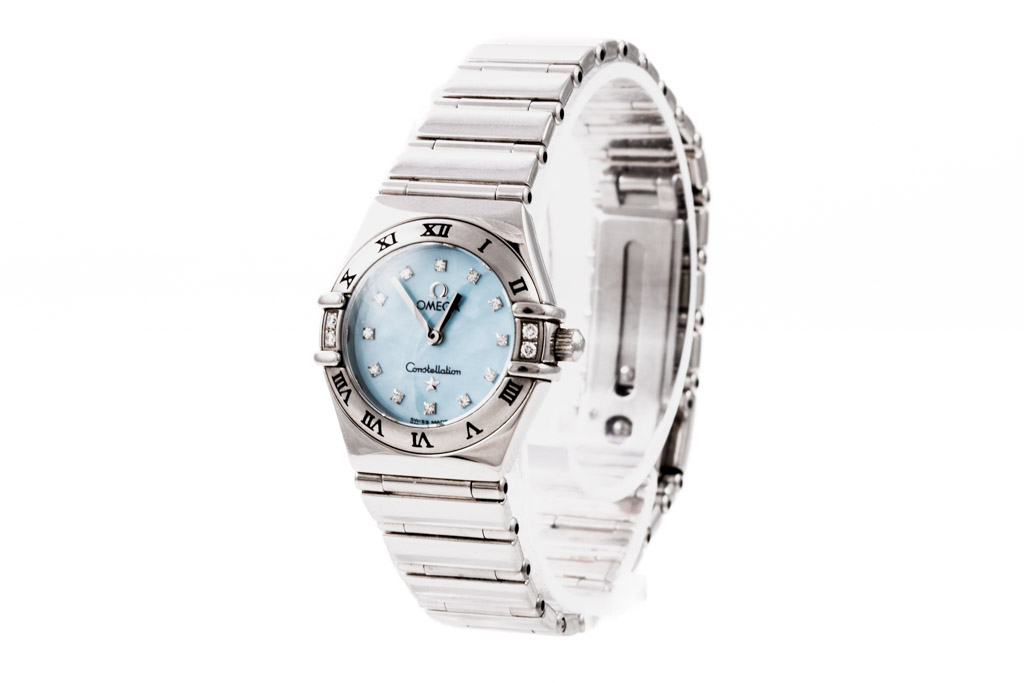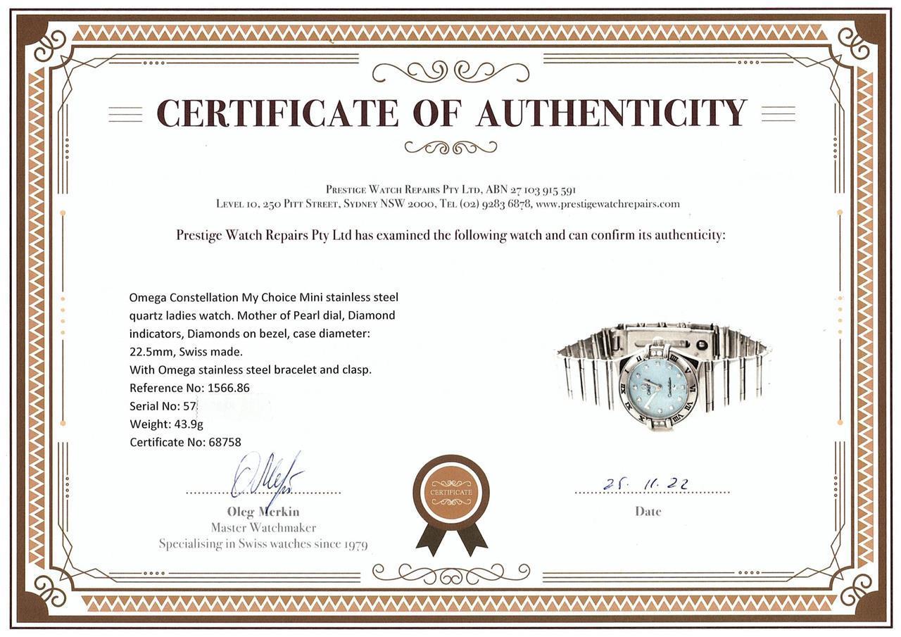 Omega Constellation My Choice Mini stainless steel quartz ladies watch. Mother of Pearl dial, Diamond indicators, Diamonds on case, case diameter: 22.5mm, wrist size: 15cm, Swiss made. Ref# 1566.86. With Omega stainless steel bracelet and clasp. With Certificate of Authenticity, Omega International Warranty Card dated 8/01/2005, Omega Precious Stones Certificate Card dated 8/01/2005 and Omega case. 3 month FSA warranty. (Pre-owned)