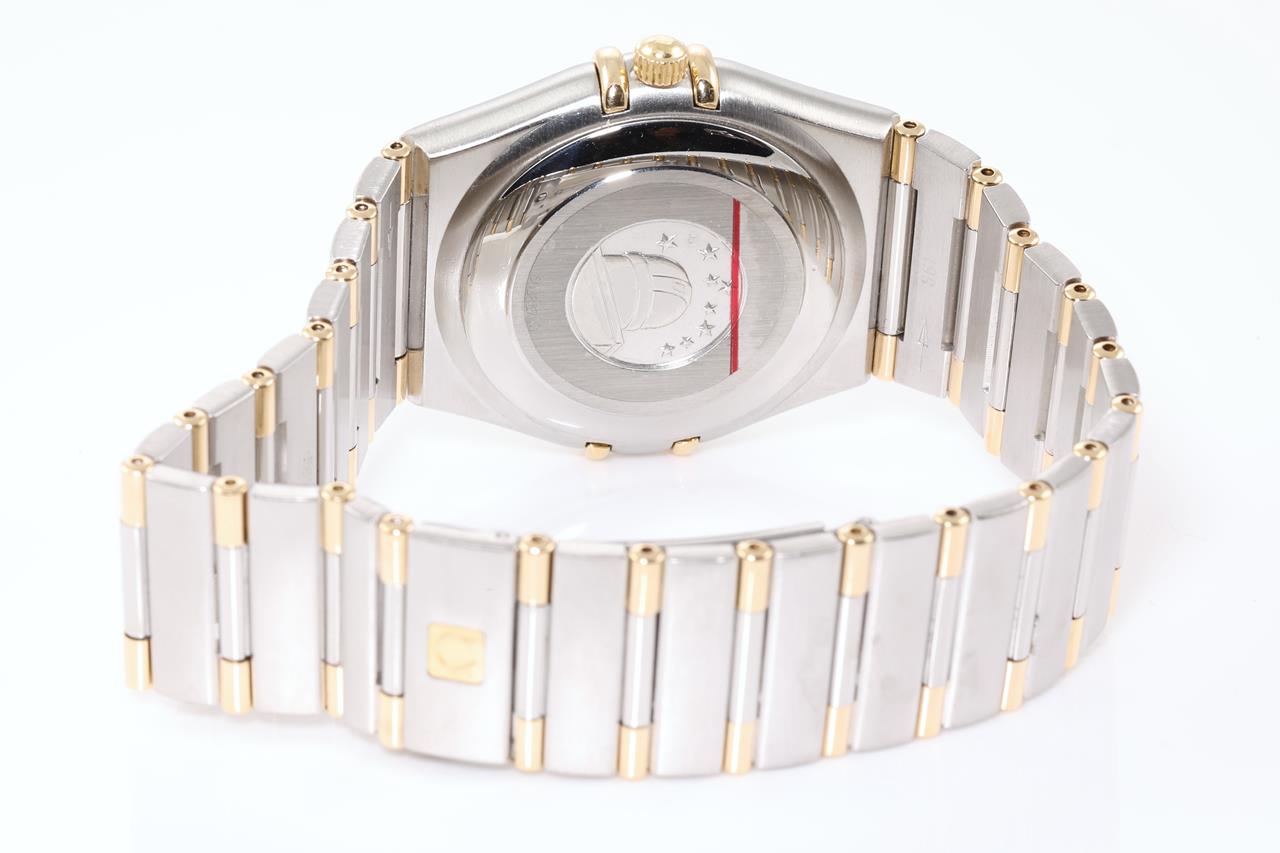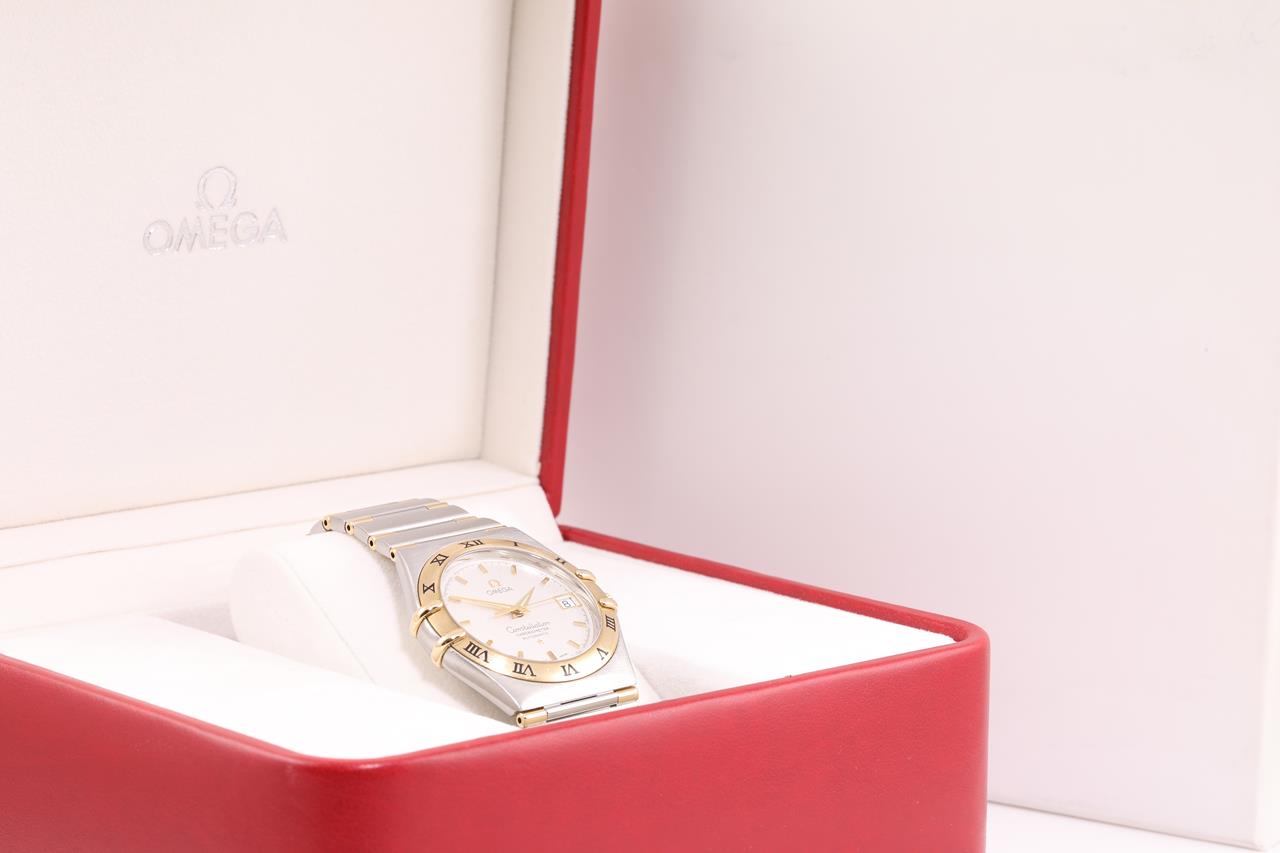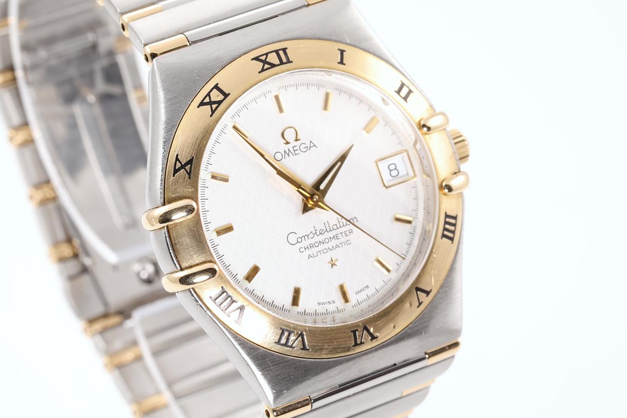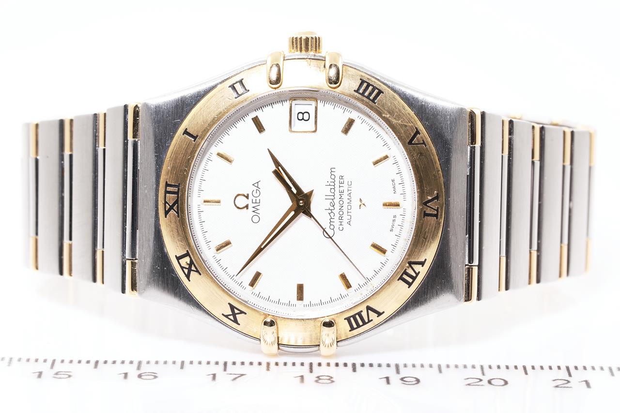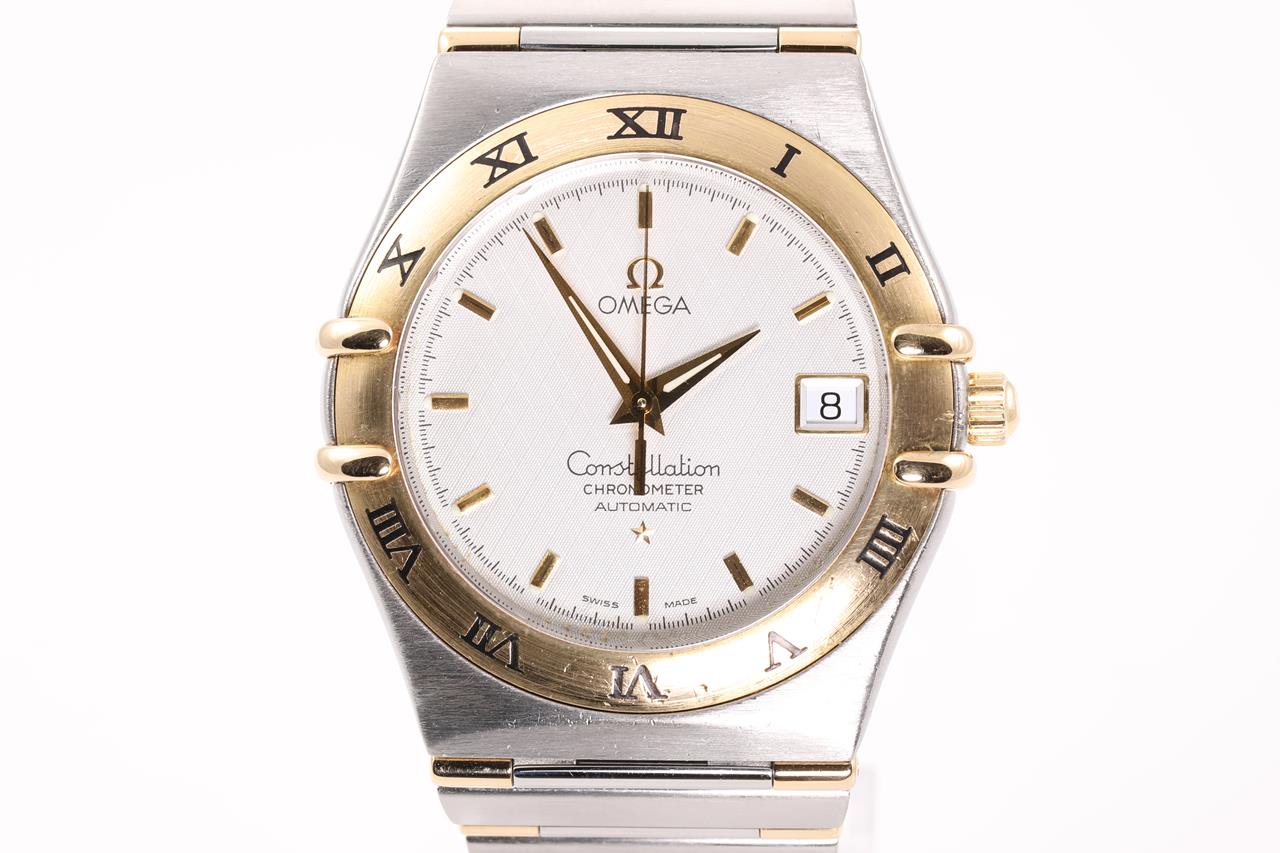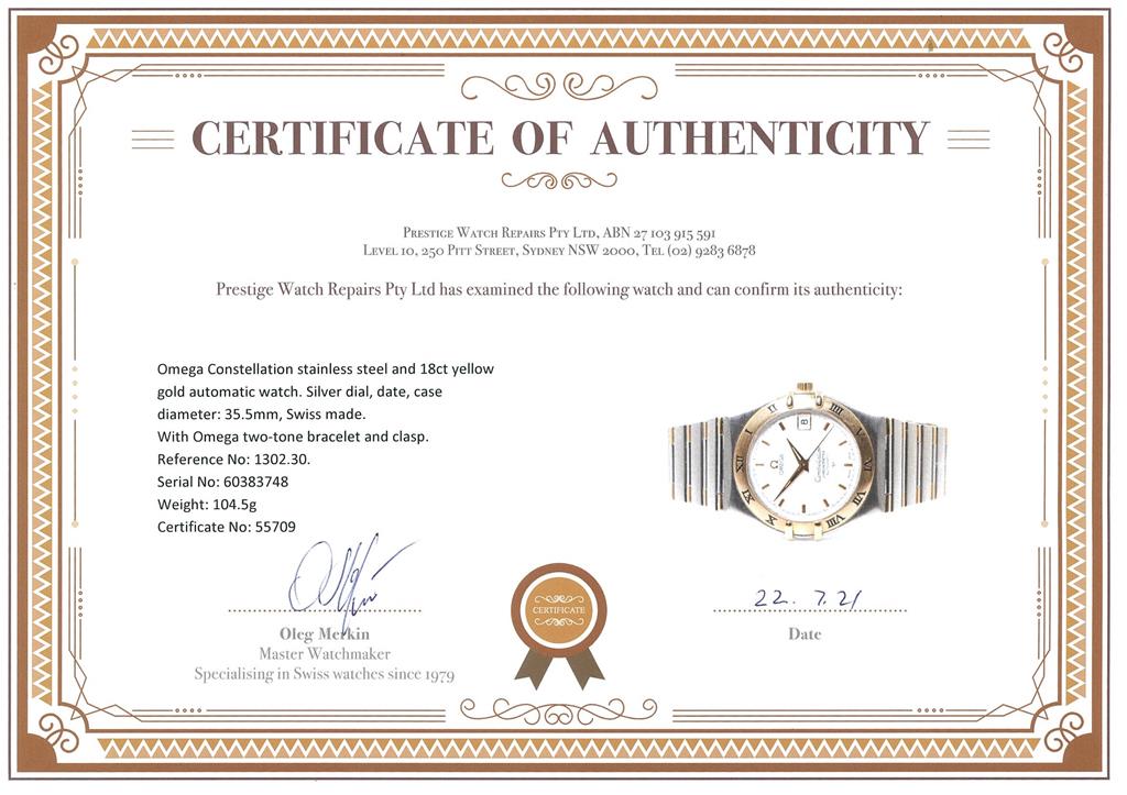 Omega Constellation stainless steel and 18ct yellow gold automatic watch. Silver dial, date, case diameter: 35.5mm, wrist size: 18cm, Swiss made. Ref# 1302.30. With Omega two-tone bracelet and clasp. With Certificate of authenticity and Omega box. 3 month FSA warranty.