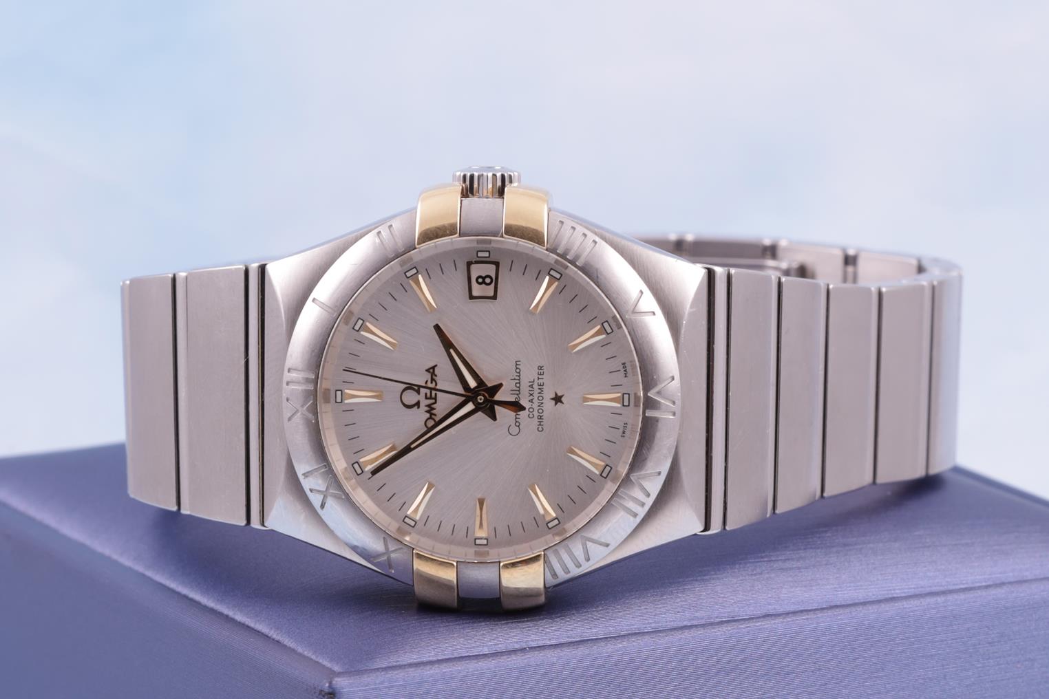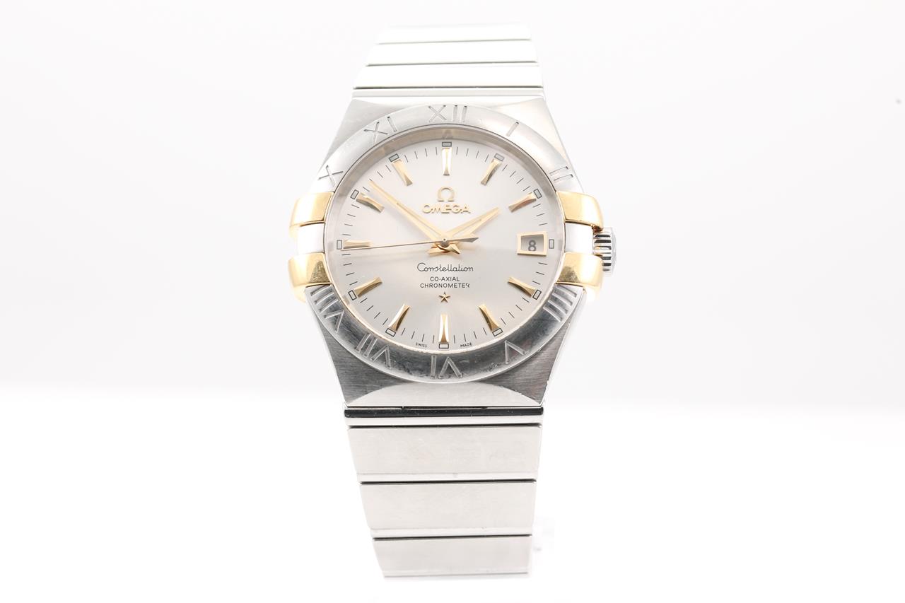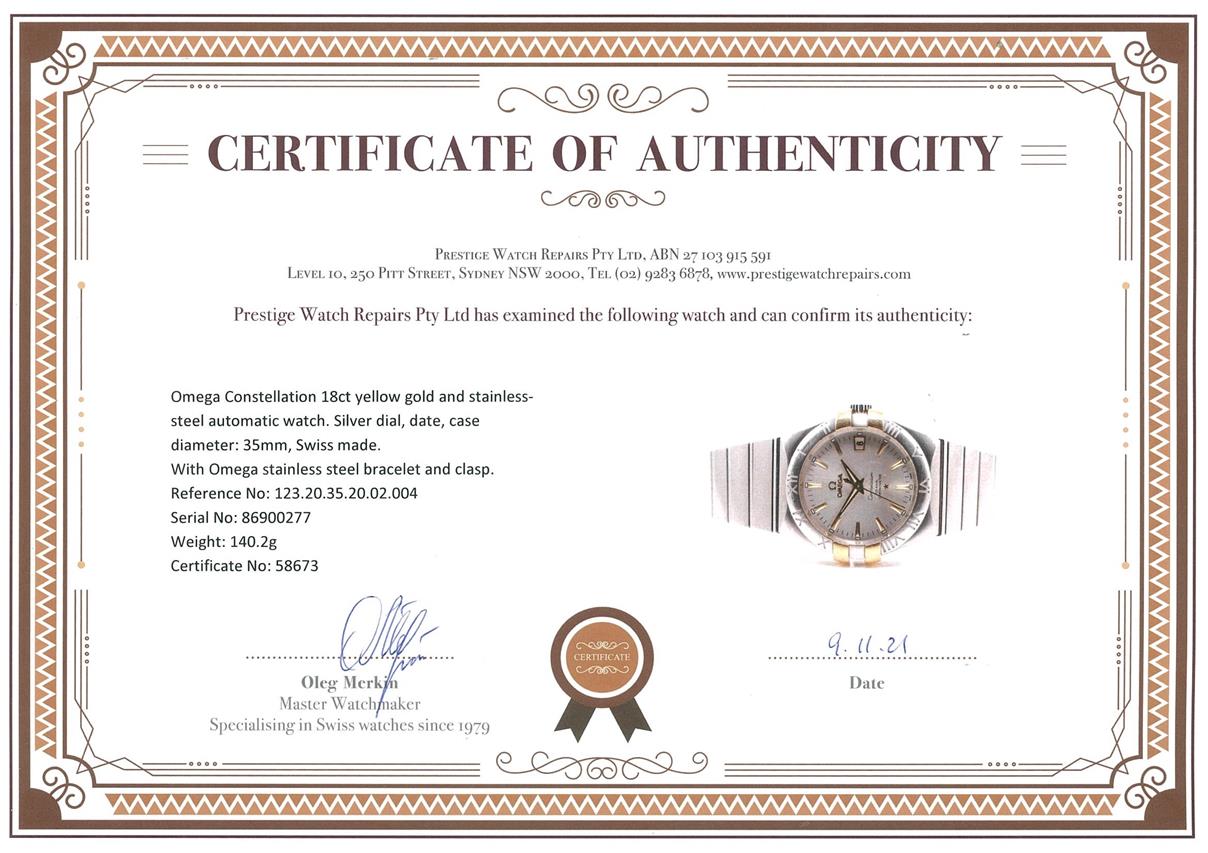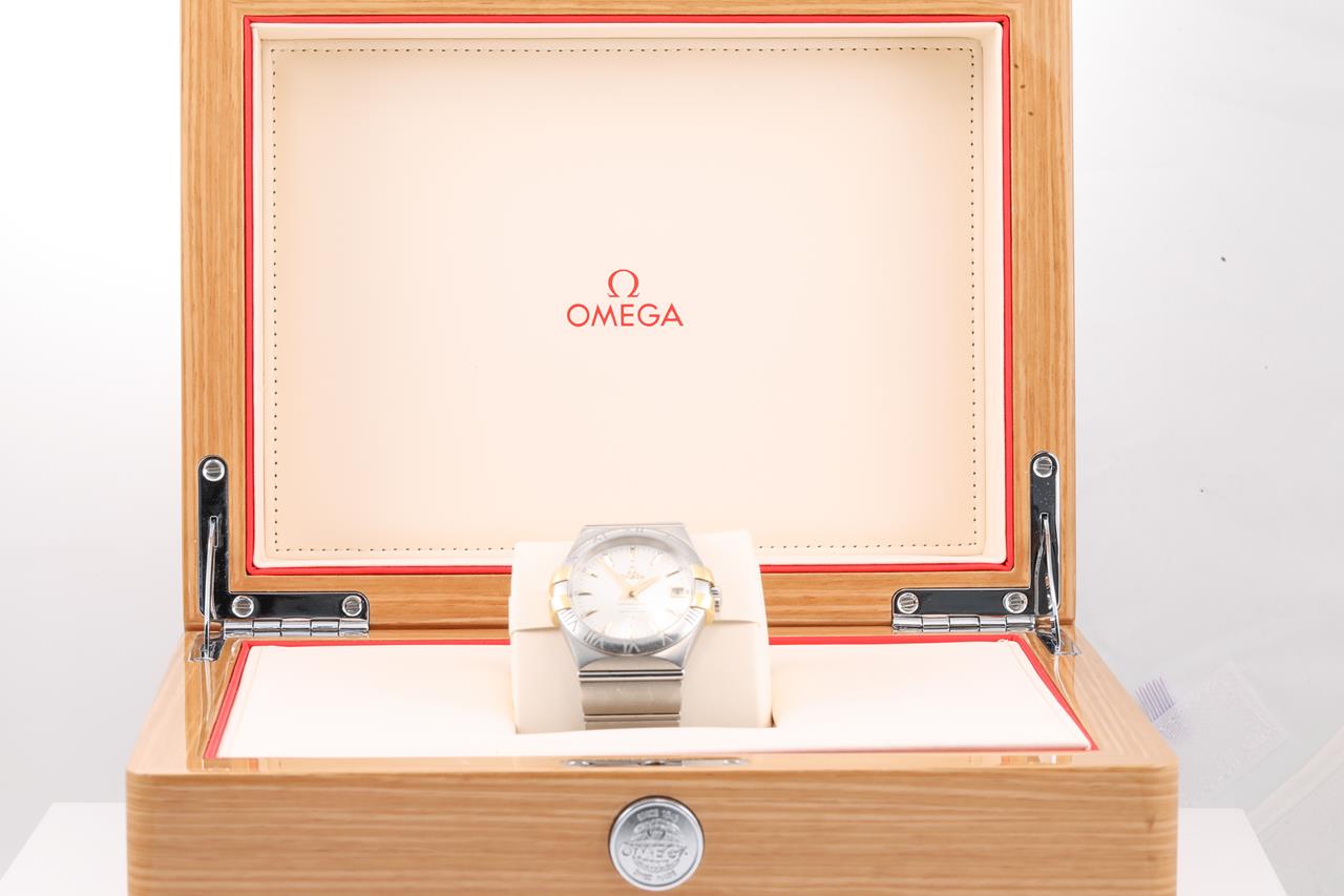 Omega Constellation 18ct yellow gold and stainless steel automatic watch. Silver dial, date, case diameter: 35mm, wrist size: 18.5cm, Swiss made. Ref# 123.20.35.20.02.004. With Omega stainless steel bracelet and clasp. With Certificate of Authenticity, Omega International Warranty card, Pictograms card and Omega box. 6 month Prestige Watchmaker warranty from the date of full service. (Pre-owned)