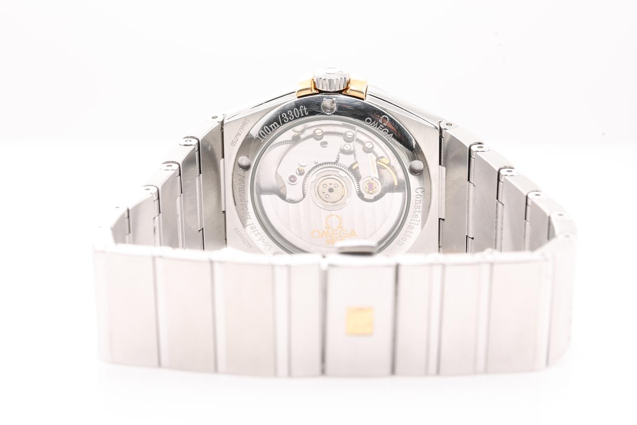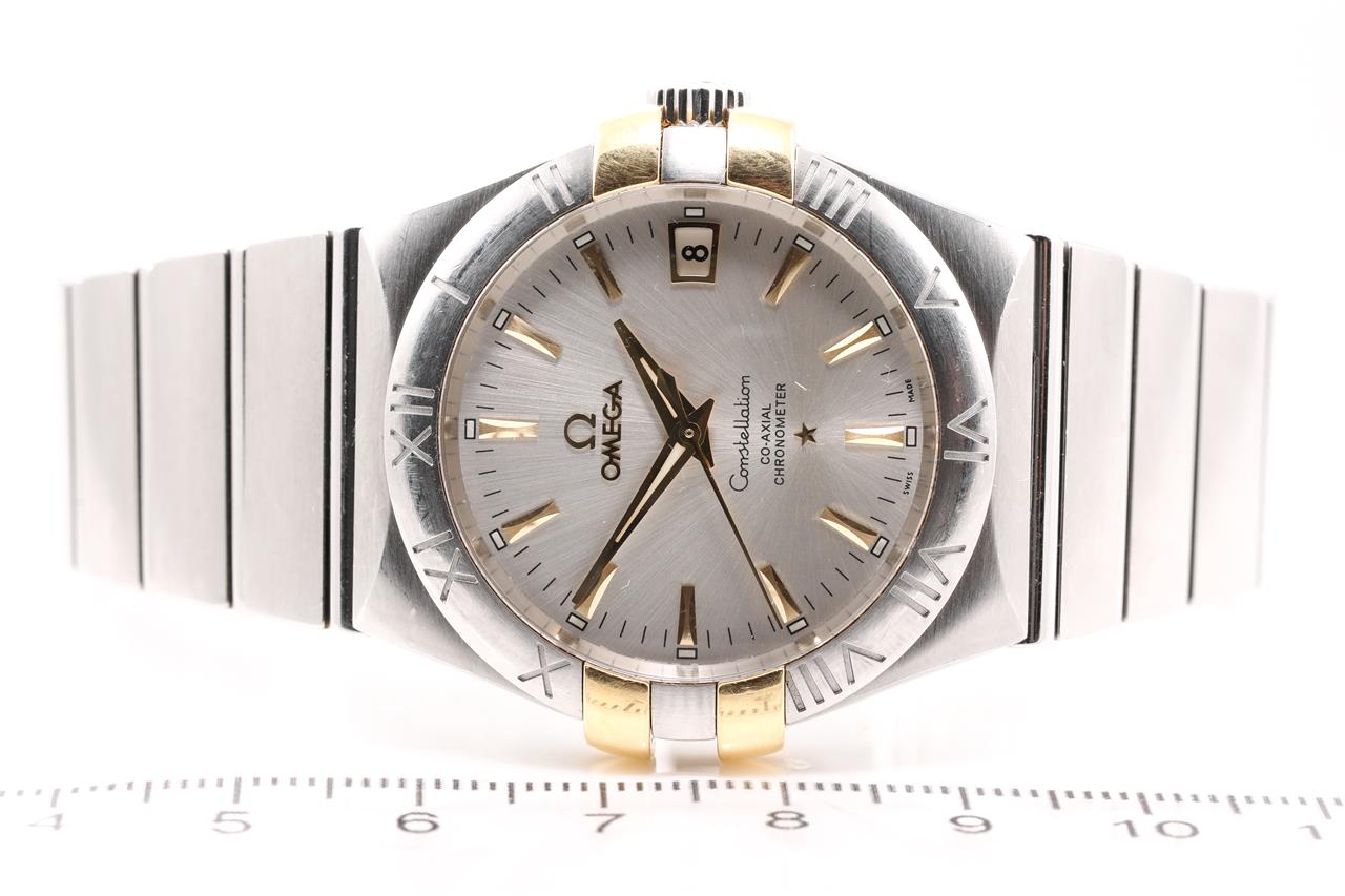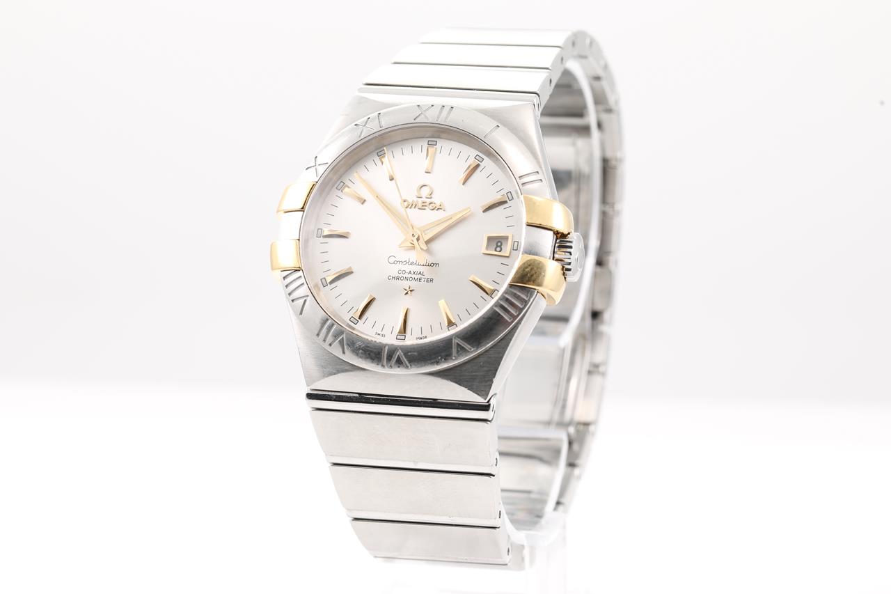 Omega Constellation 18ct yellow gold and stainless steel automatic watch. Silver dial, date, case diameter: 35mm, wrist size: 18.5cm, Swiss made. Ref# 123.20.35.20.02.004. With Omega stainless steel bracelet and clasp. With Certificate of Authenticity, Omega International Warranty card, Pictograms card and Omega box. 6 month Prestige Watchmaker warranty from the date of full service. (Pre-owned)