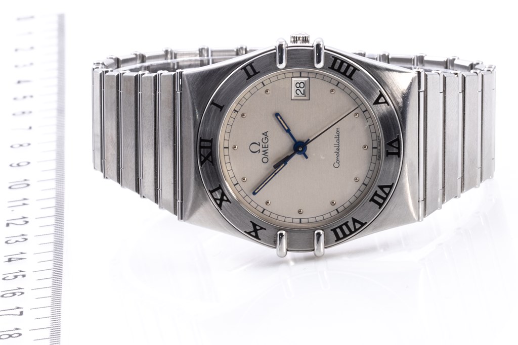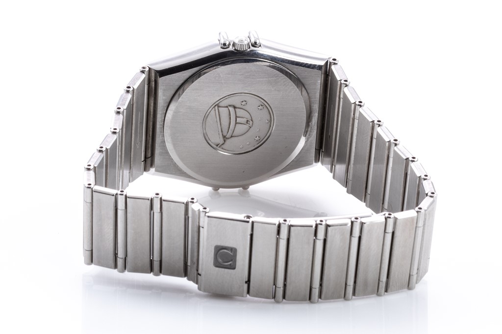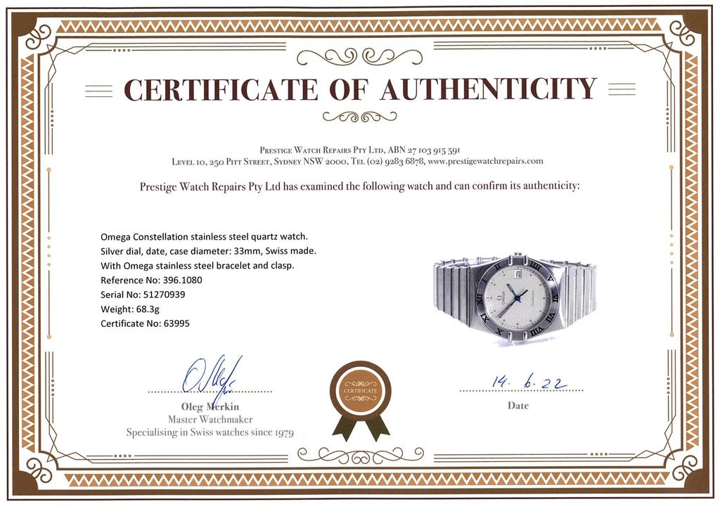 Omega Constellation stainless steel quartz watch. Silver dial, date, case diameter: 33mm, wrist size: 16.5cm, Swiss made. Ref# 396.1080. Circa: 1989. With Omega stainless steel bracelet and clasp. With Certificate of Authenticity. 3 month FSA warranty. (Pre-owned)
