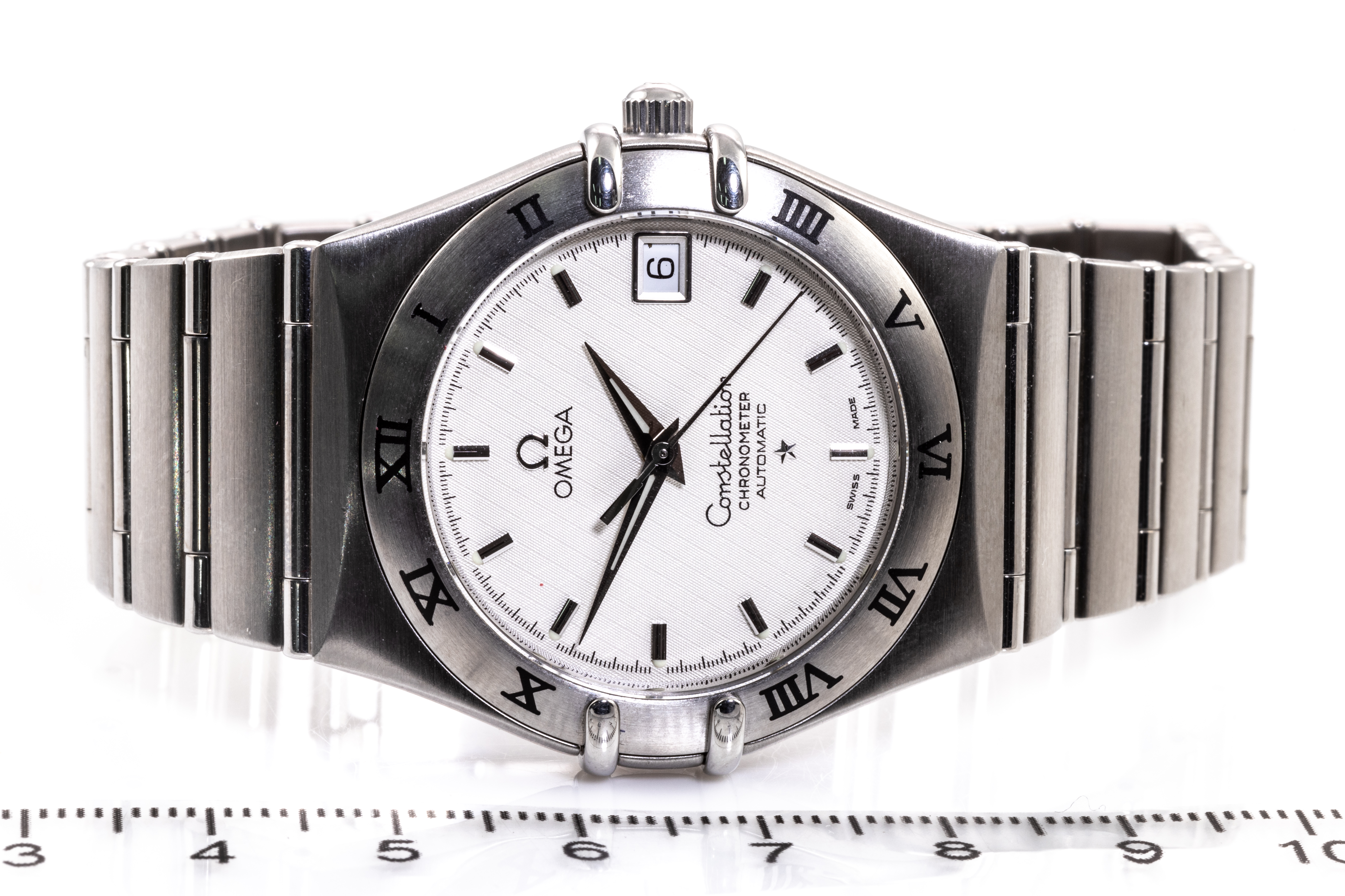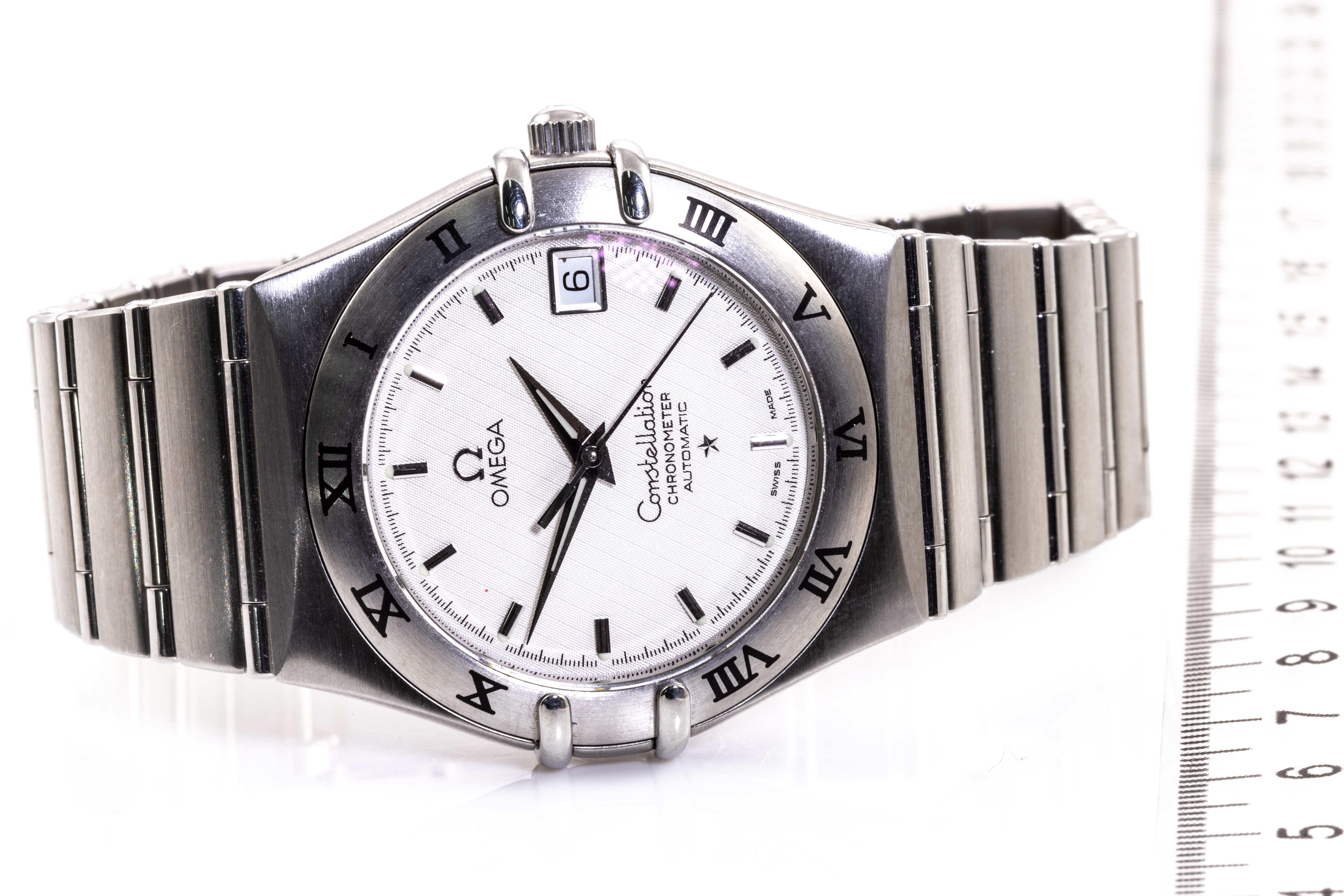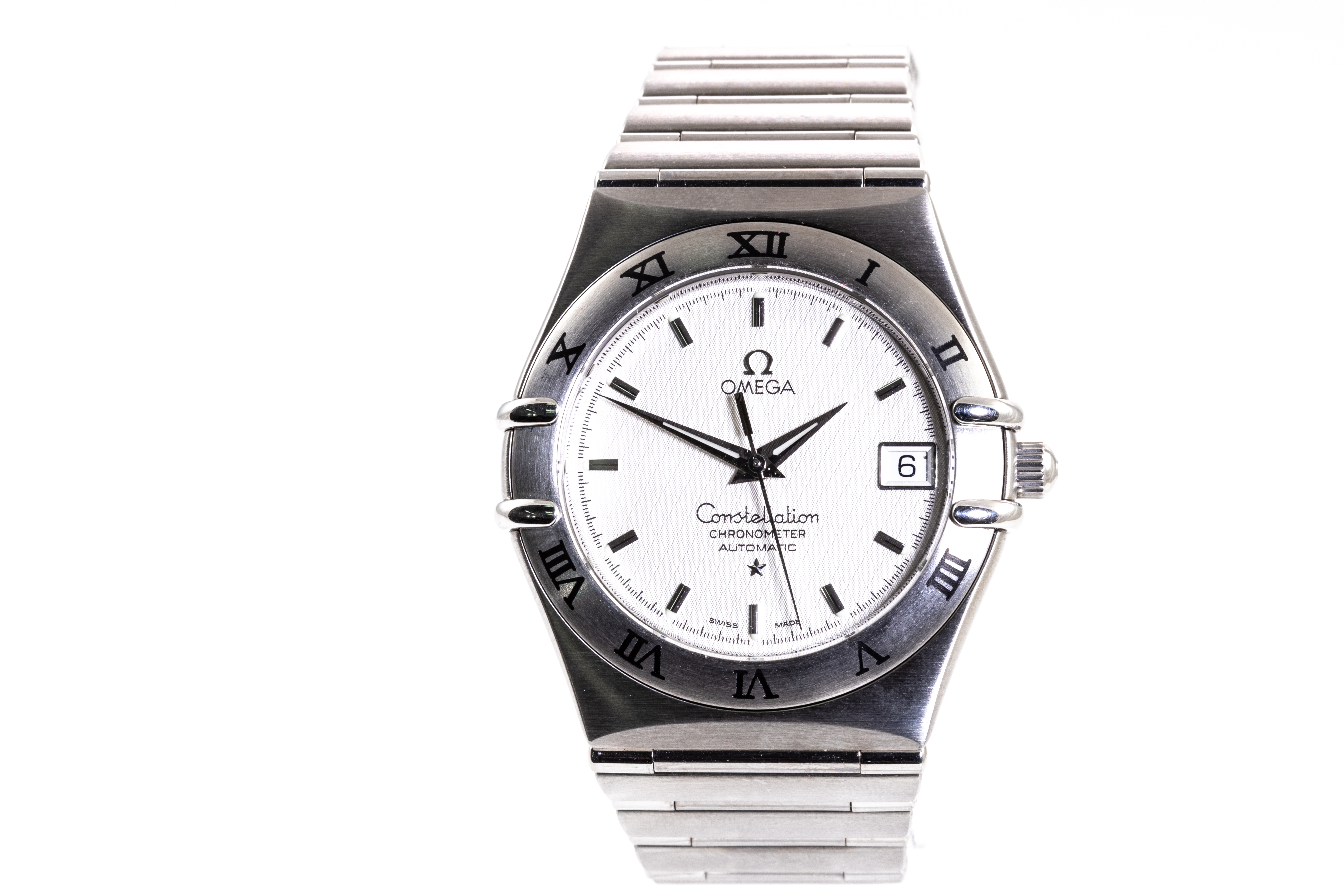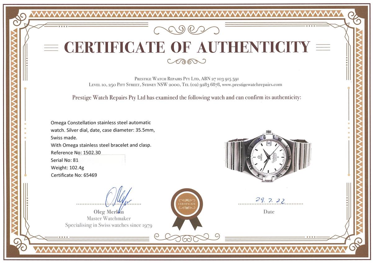 Omega Constellation stainless steel automatic watch. Silver dial, date, case diameter: 35.5mm, wrist size: 18.5cm, Swiss made. Ref# 1502.30, Circa: 2007. With Omega stainless steel bracelet and clasp. With Certificate of Authenticity, Omega International Warranty Card, Pictograms Card, Chronometer Certificate Card and Omega box. 3 month FSA warranty. (Pre-owned)