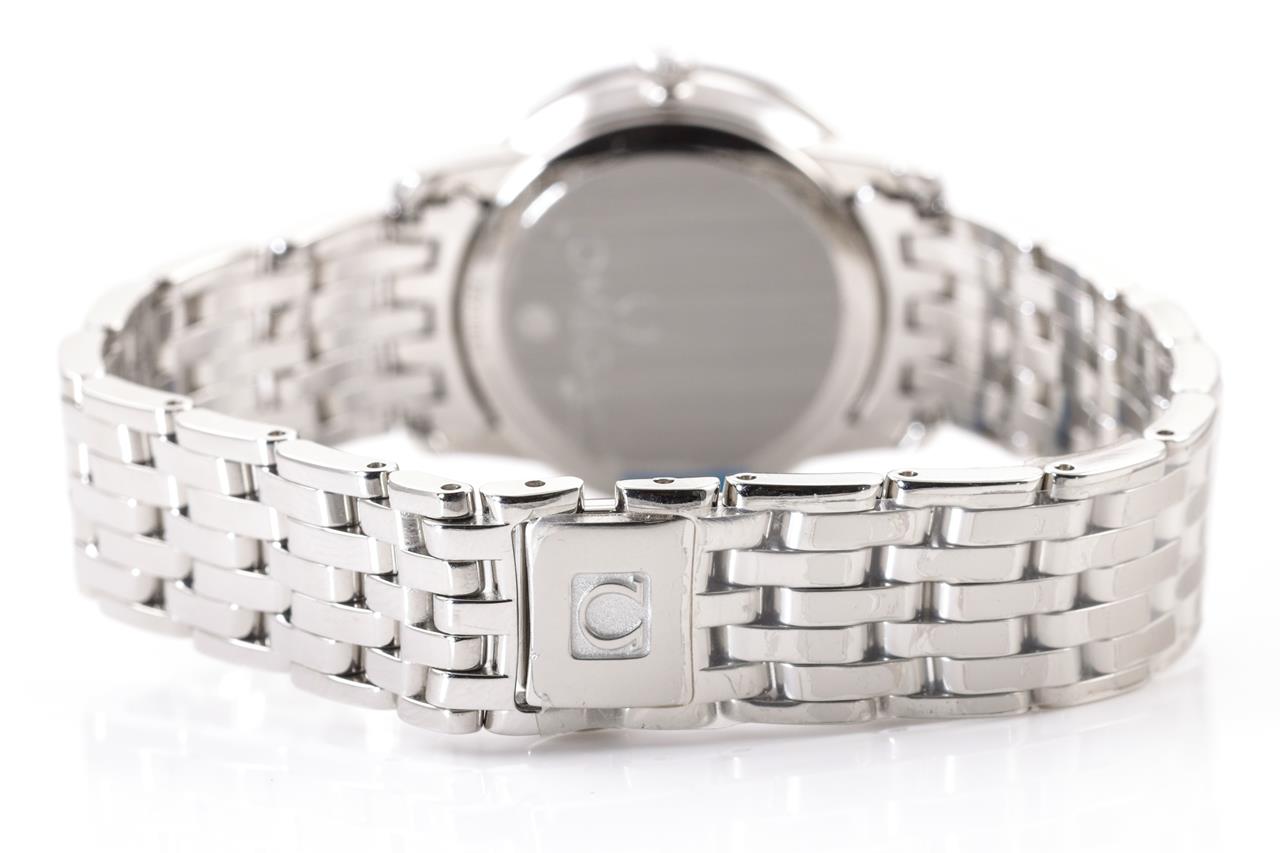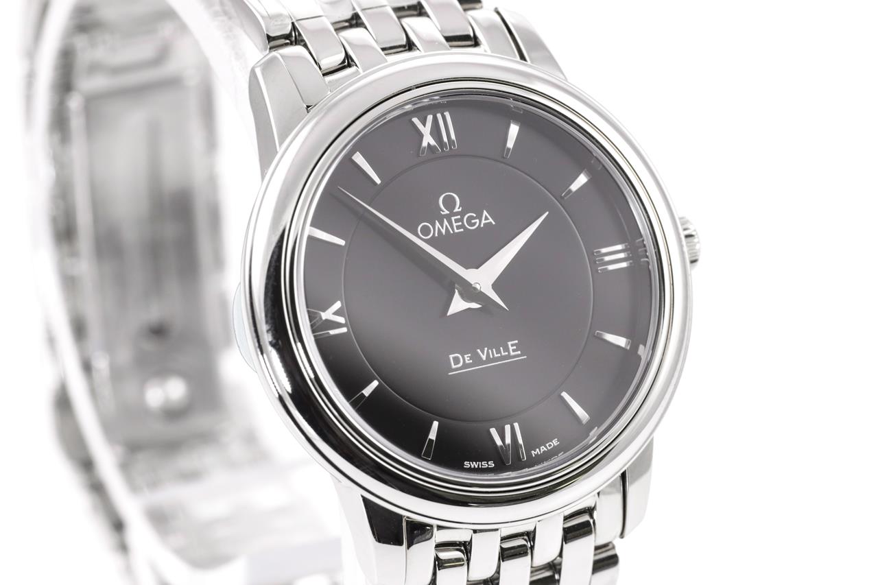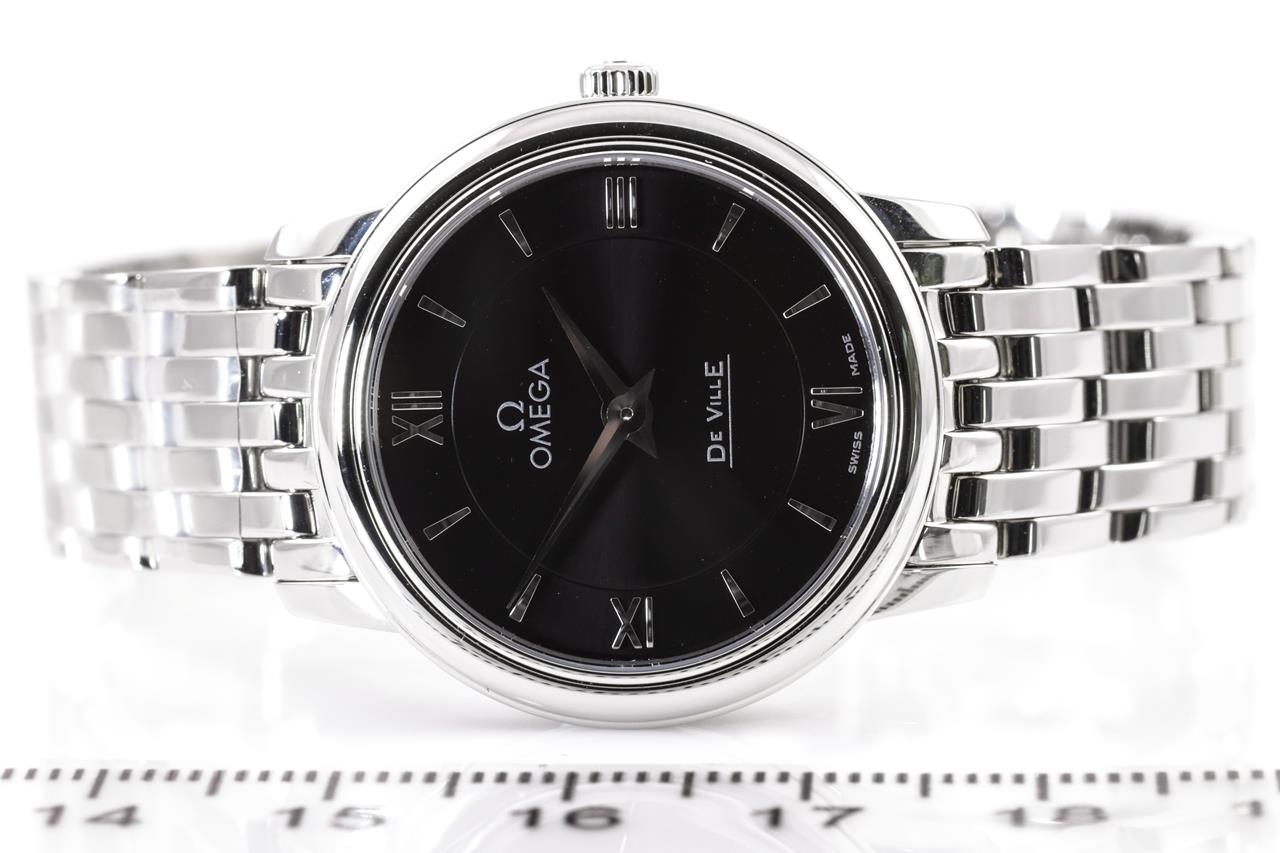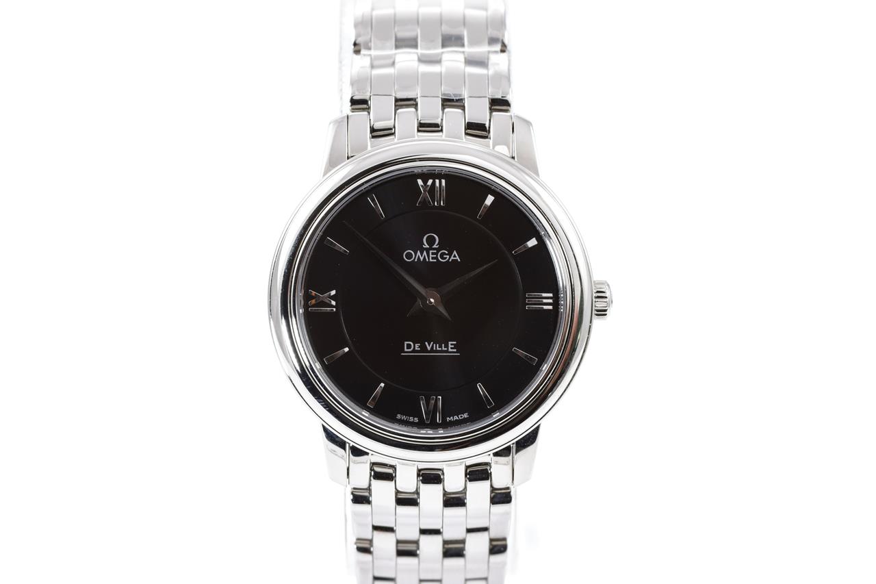 Omega De Ville stainless steel quartz ladies watch. Black dial, case diameter: 27.4mm, wrist size: 15.5cm, Swiss made. Ref# 424.10.27.60.01.001. With Omega stainless steel bracelet and clasp. 3 month FSA warranty. (New)