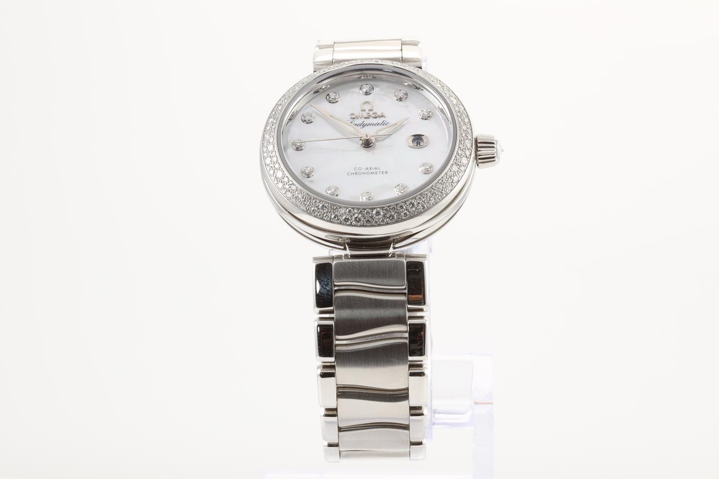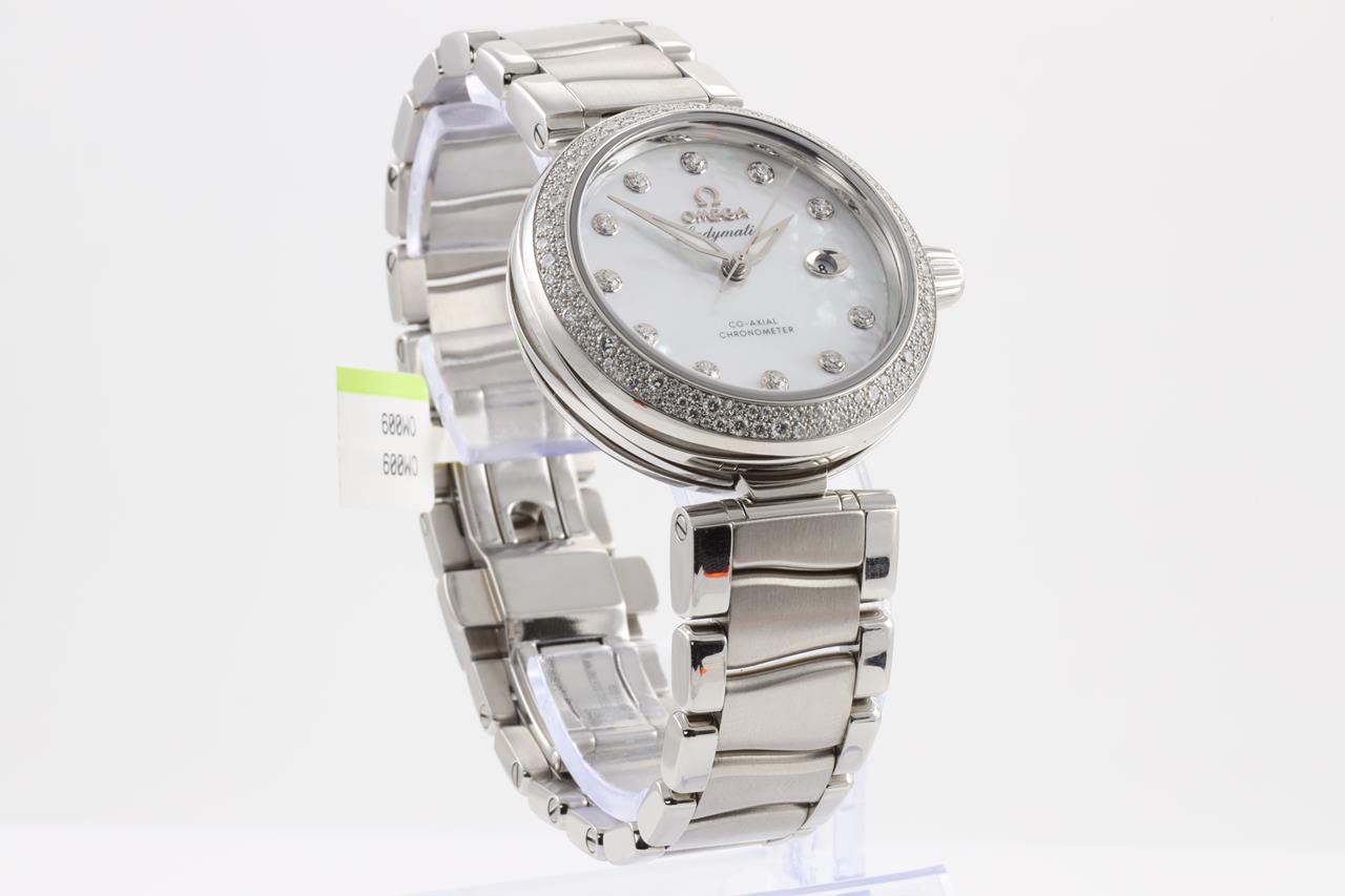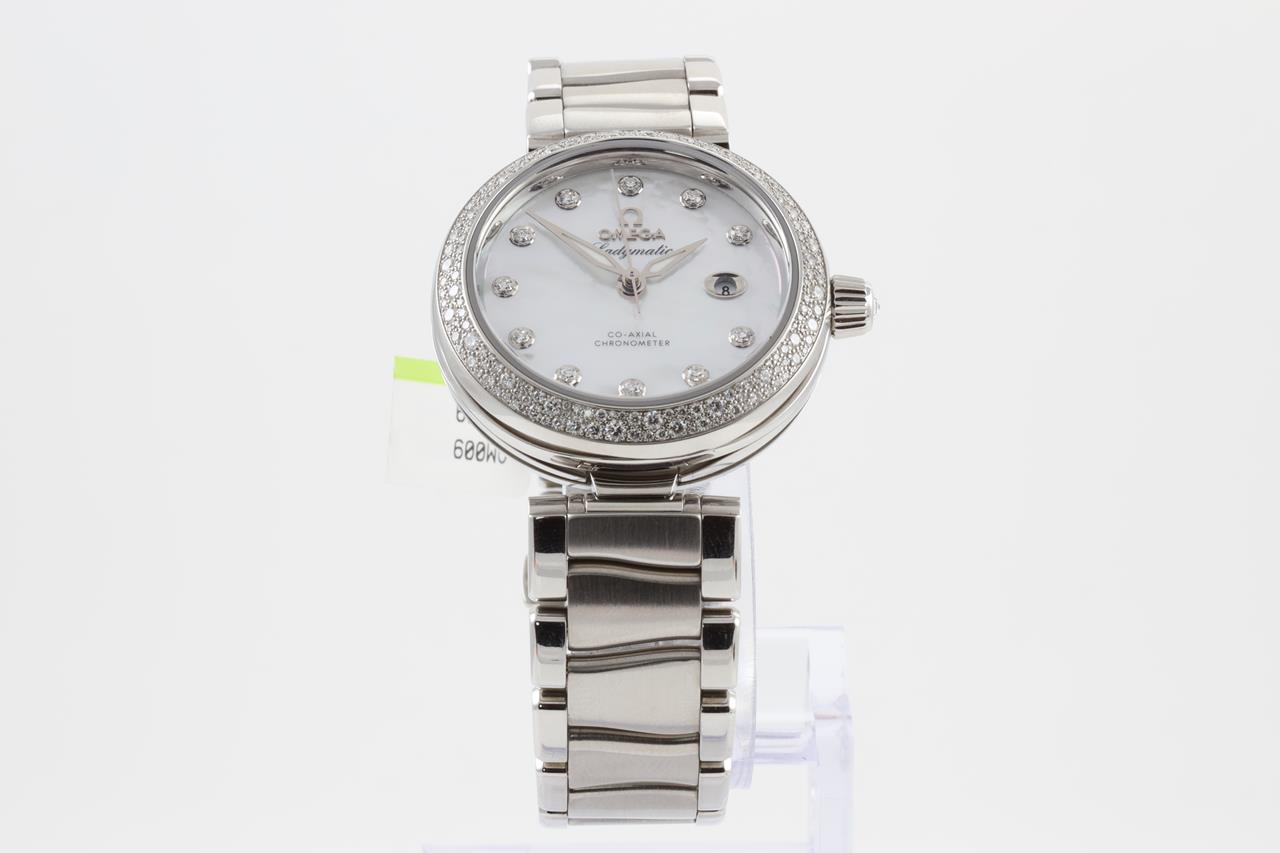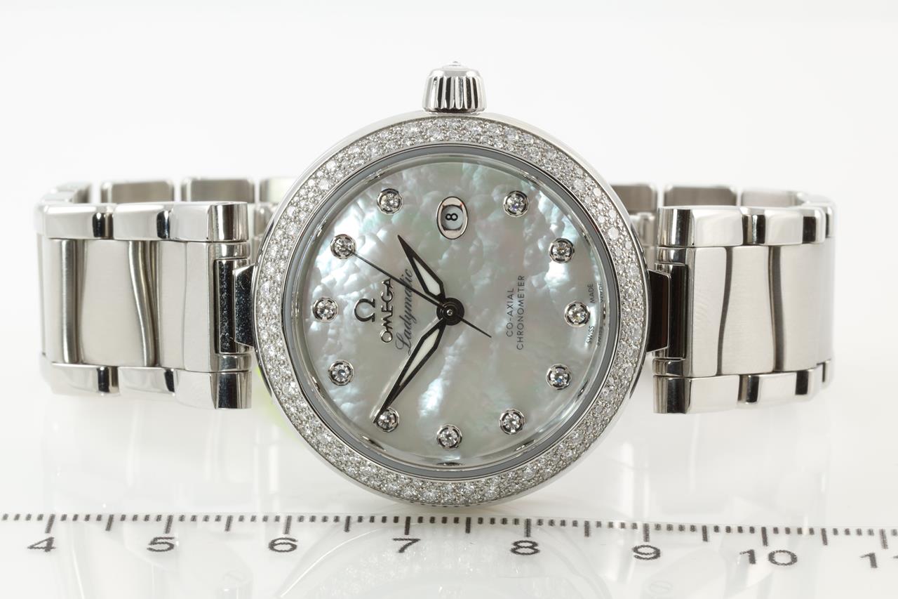 Omega De Ville Ladymatic stainless steel automatic ladies watch. Mother of Pearl dial, date, Diamond indicators, Diamond set bezel, case diameter: 34mm, Swiss made. Ref # 425.35.34.20.55.002. With Omega stainless steel bracelet. With Omega operating instructions booklet inside box. 3 month FSA warranty. (New)