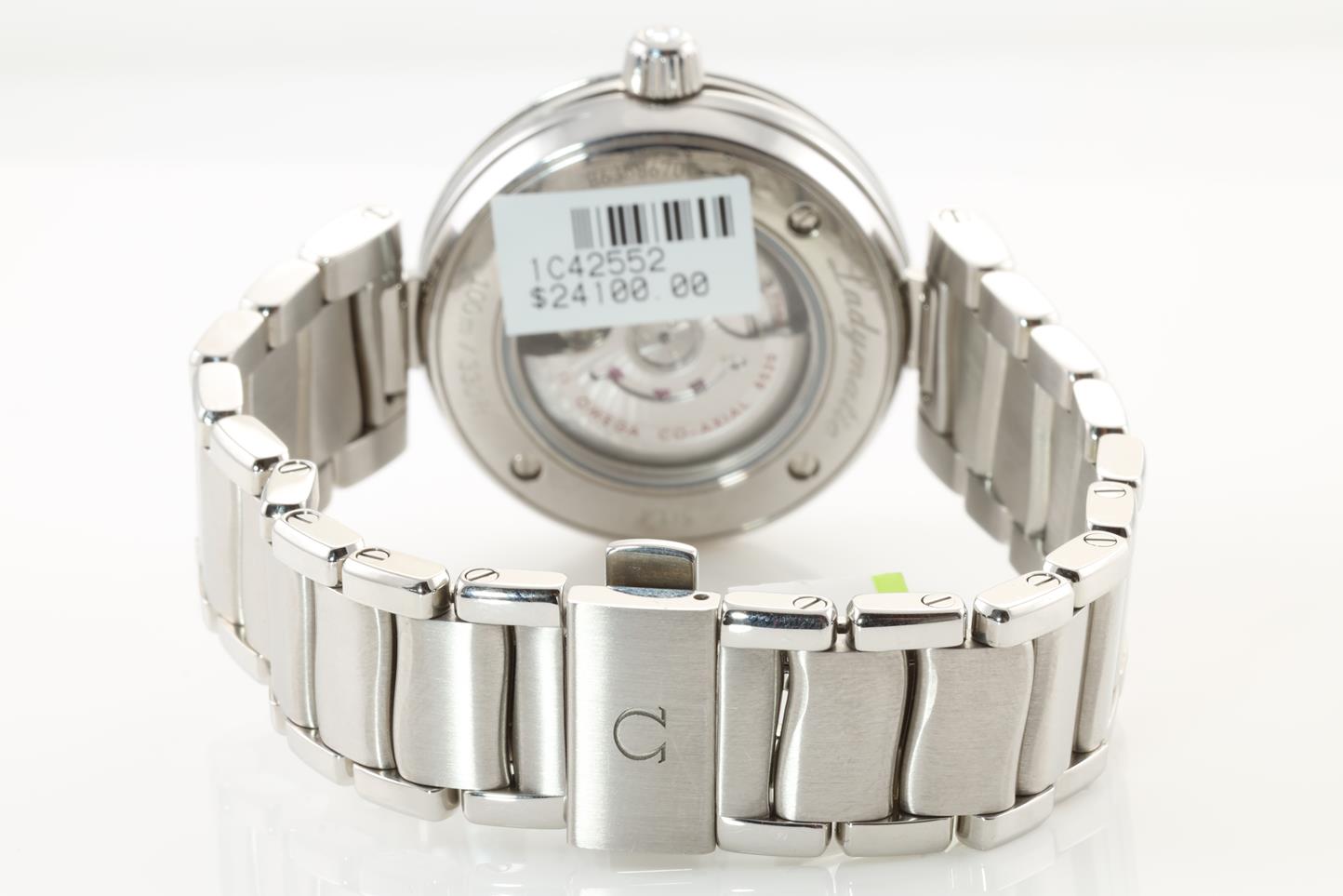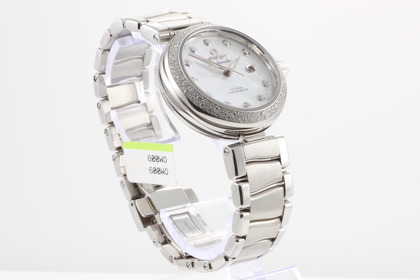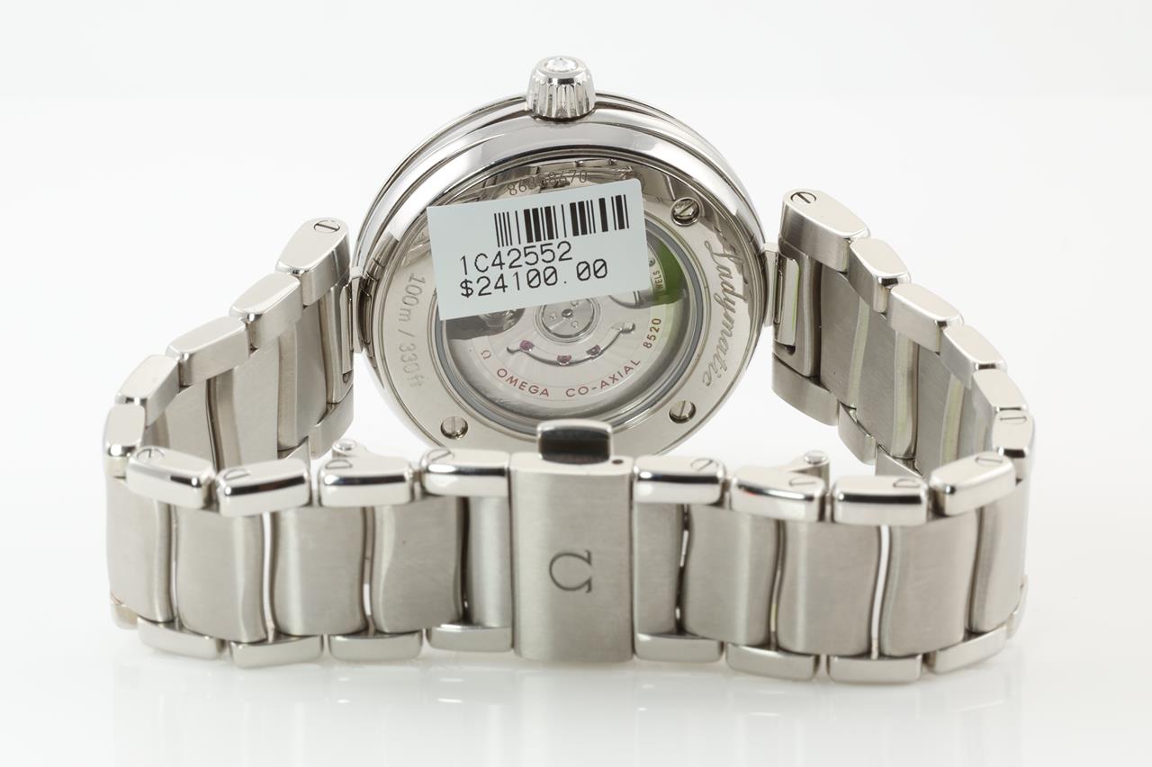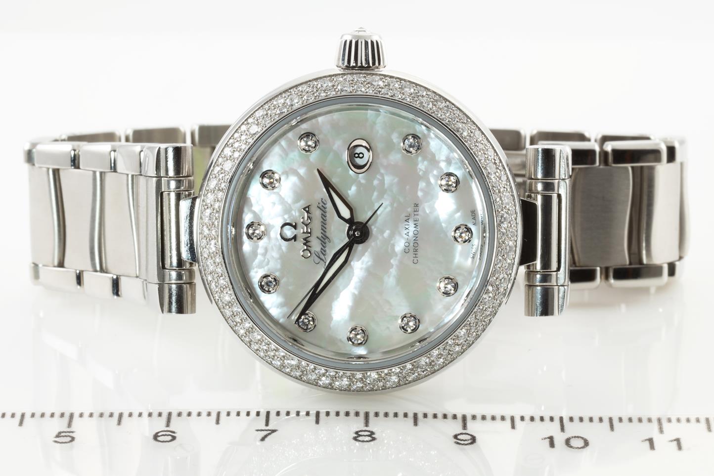 Omega De Ville Ladymatic stainless steel automatic ladies watch. Mother of Pearl dial, date, Diamond indicators, Diamond set bezel, case diameter: 34mm, Swiss made. Ref # 425.35.34.20.55.002. With Omega stainless steel bracelet. With Omega operating instructions booklet inside box. 3 month FSA warranty. (New)