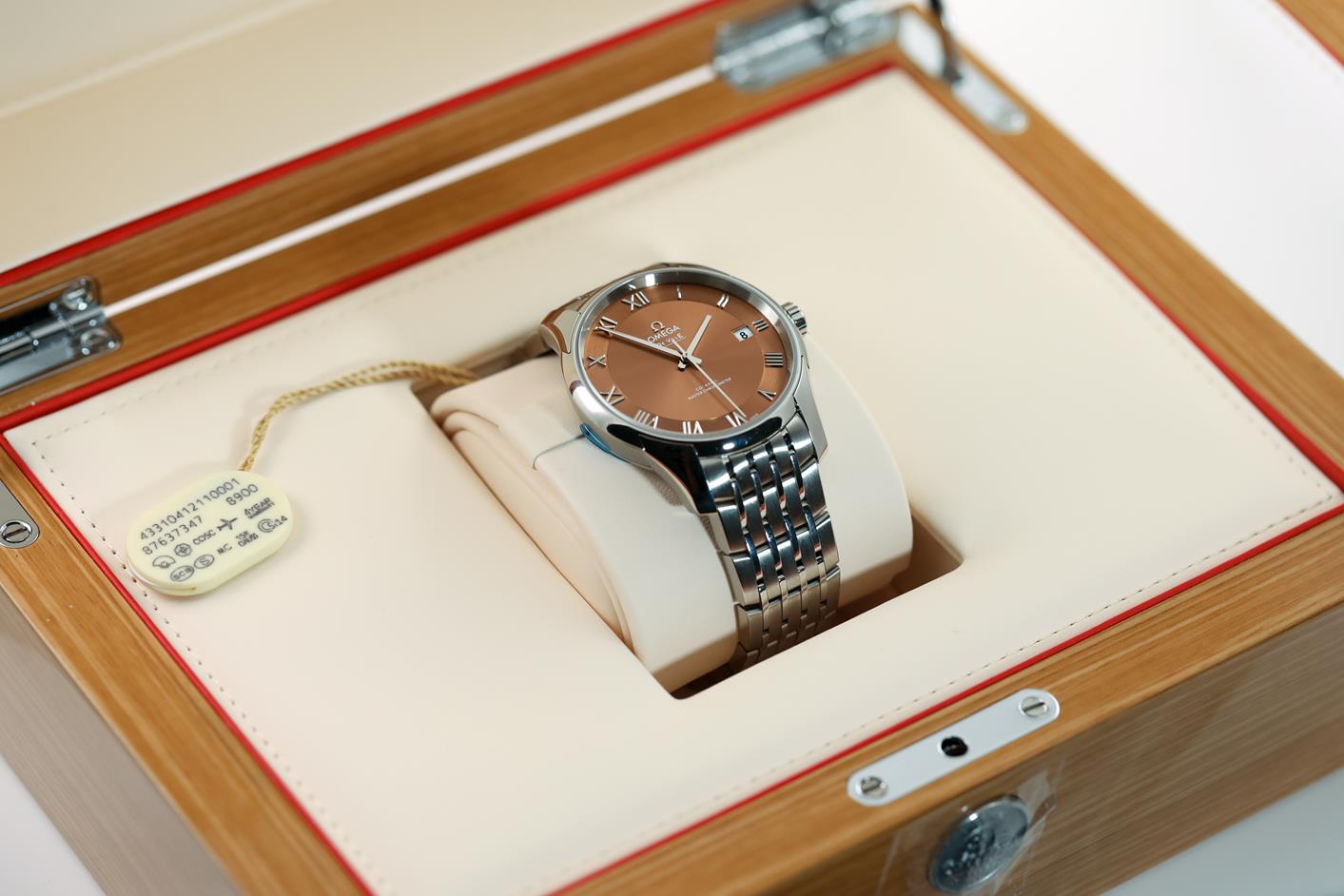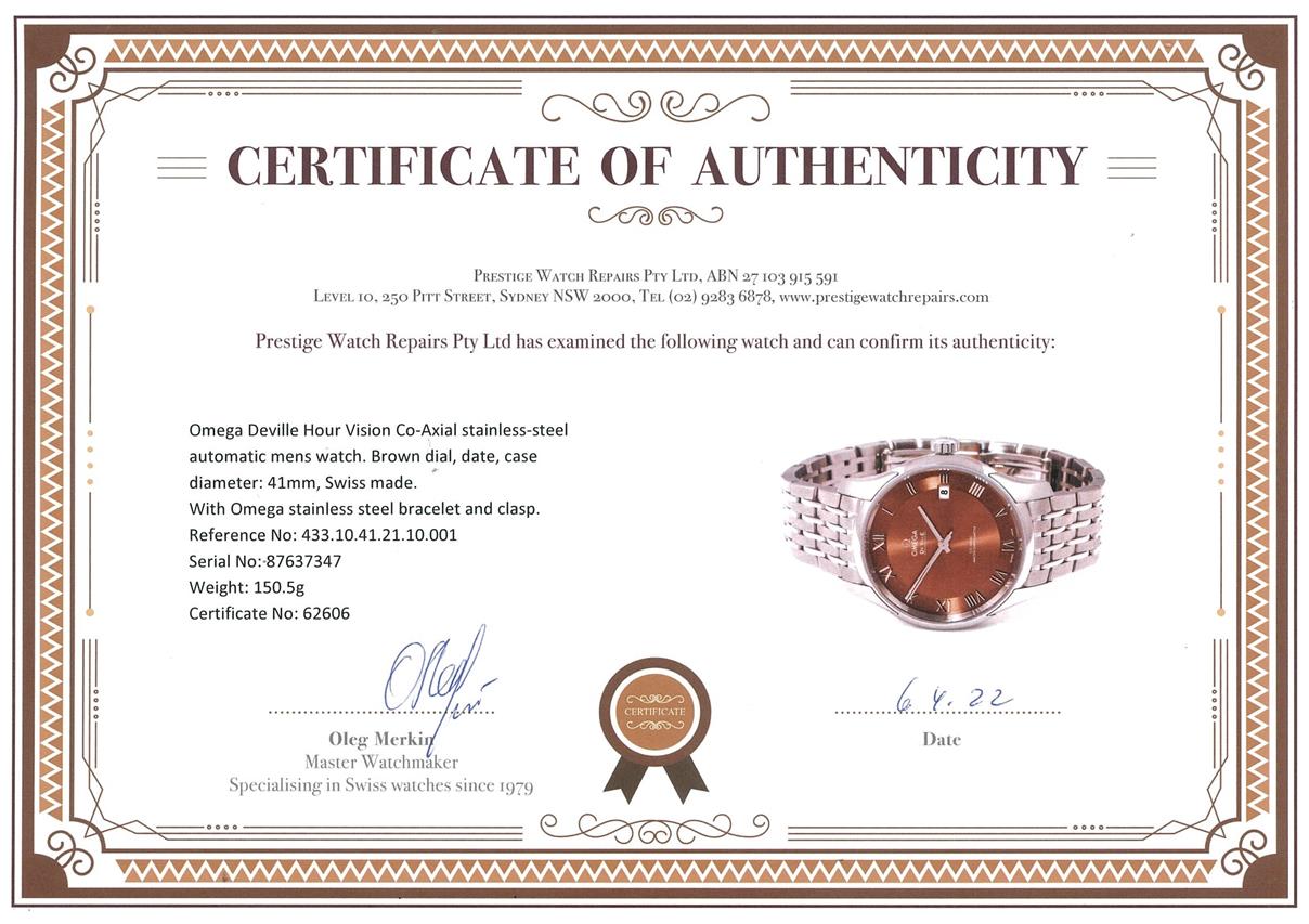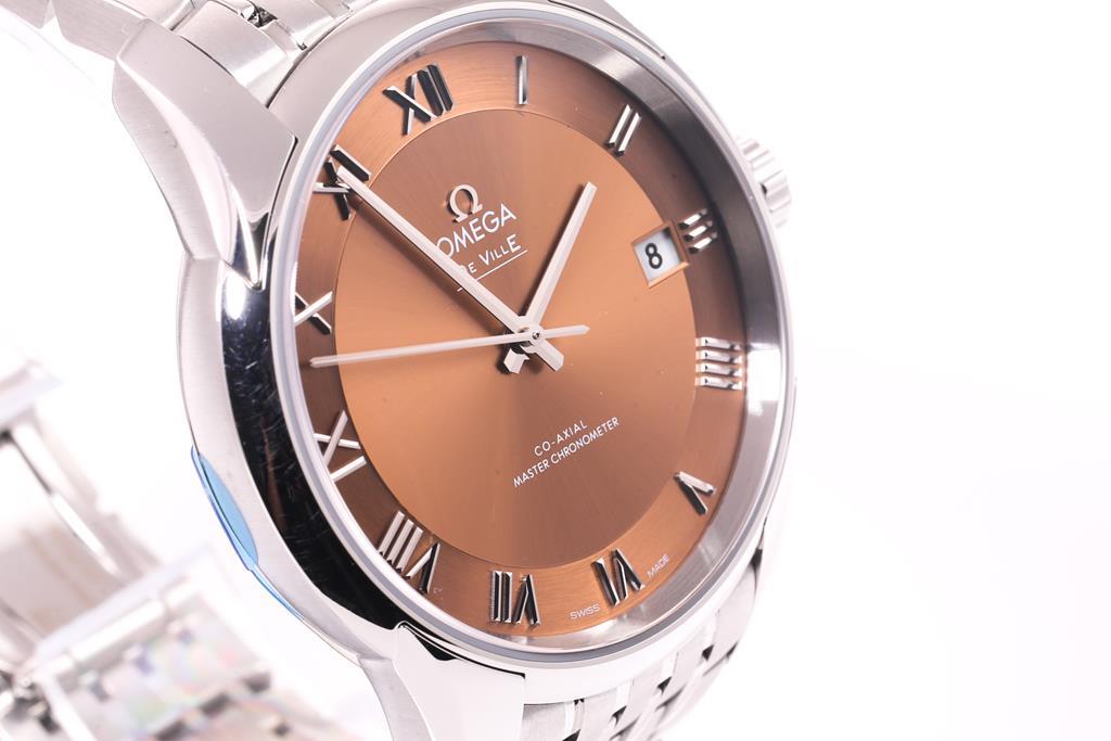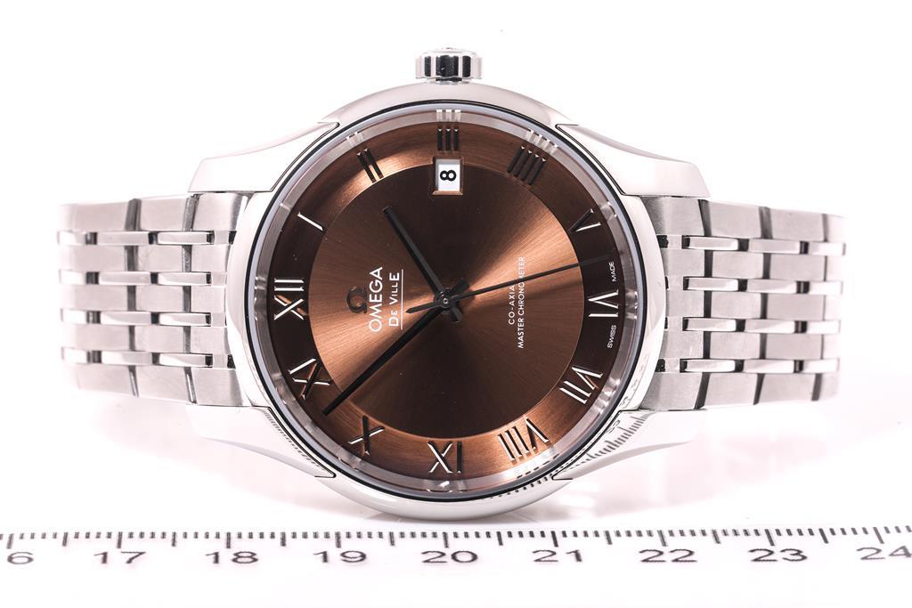 Omega Deville Hour Vision Co-Axial stainless steel automatic mens watch. Brown dial, date, case diameter: 41mm, wrist size: 19cm, Swiss made. Ref# 433.10.41.21.10.001. With Omega stainless steel bracelet and clasp. With Certificate of Authenticity, Omega International Warranty Card, Pictograms Card, Master Chronometer Card and Omega box. 3 month FSA warranty. (Pre-owned)