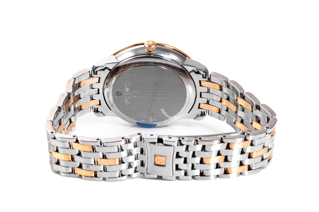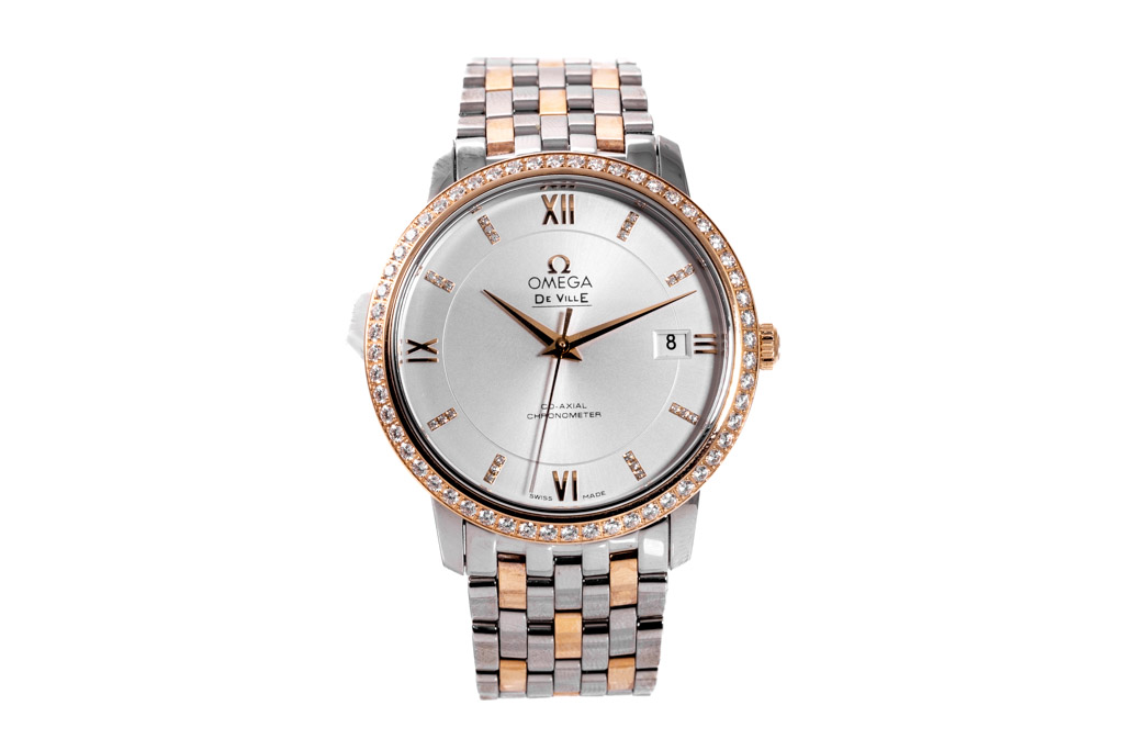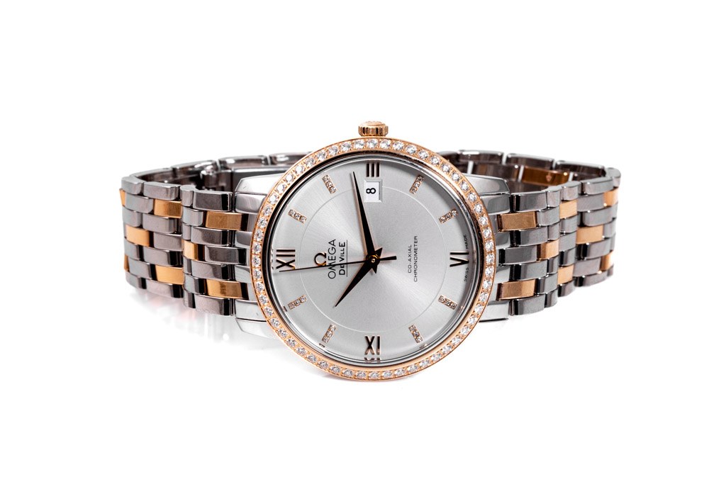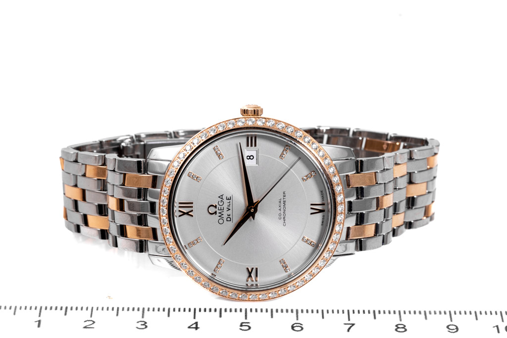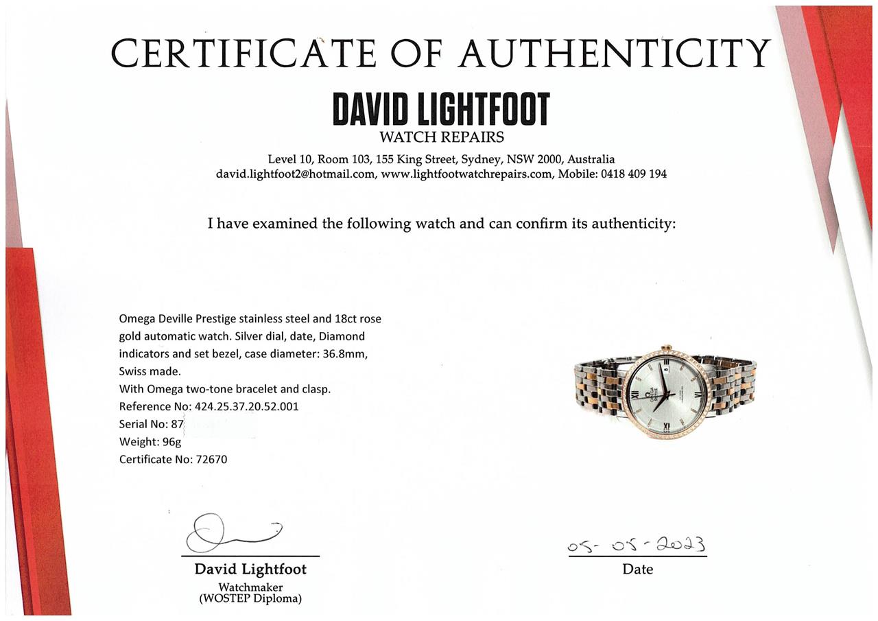 Omega Deville Prestige stainless steel and 18ct rose gold automatic watch. Silver dial, date, Diamond indicators & set bezel, case diameter:36.8mm, wrist size:17.5cm, Swiss made. Ref# 424.25.37.20.52.001. With Omega two-tone bracelet and clasp. With Certificate of Authenticity, Omega International Warranty card dated 16/02/2023, Omega Precious Stones Certificate card, Omega Pictograms card and Omega box. Balance of 5 year Omega manufacturer warranty applies. (Pre-owned)