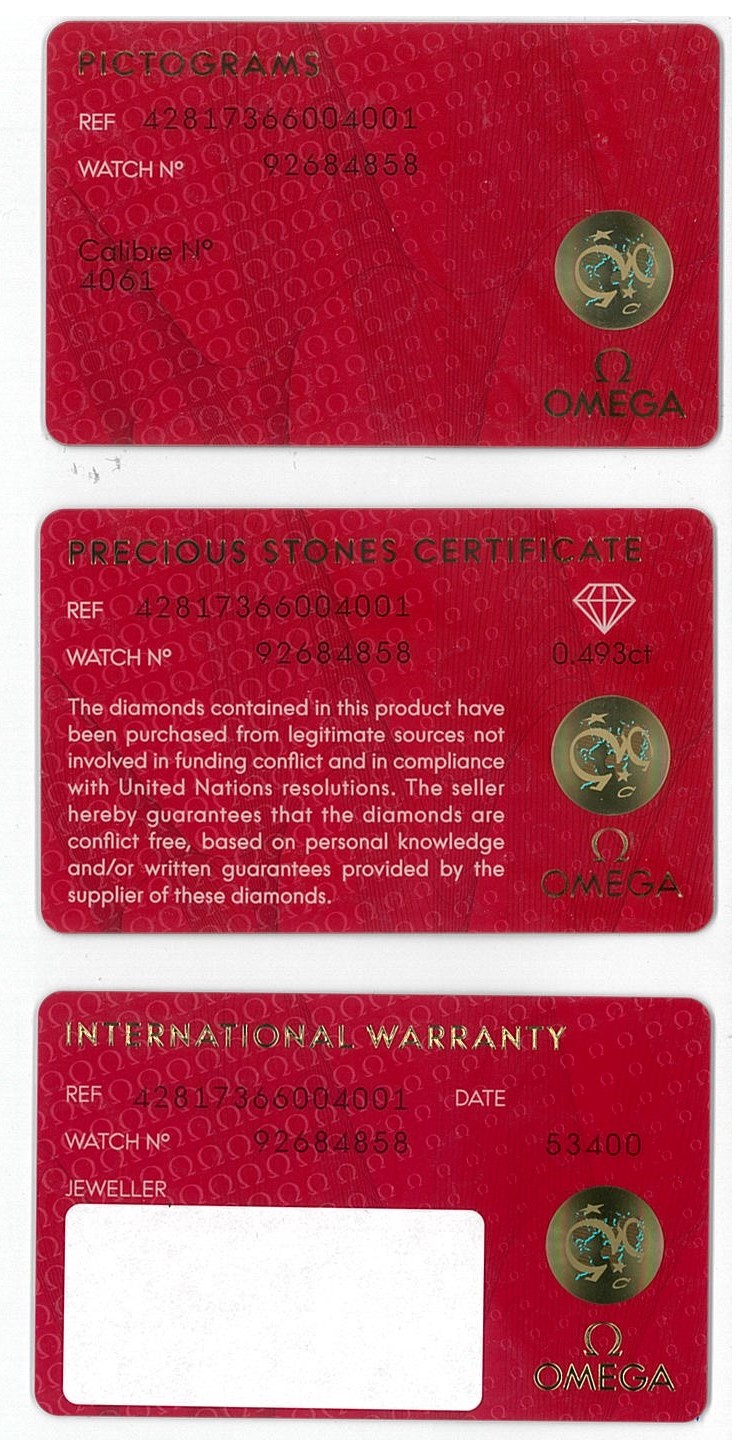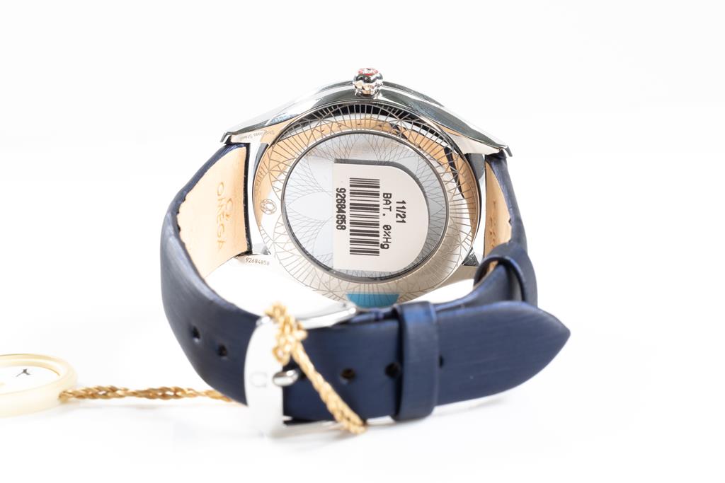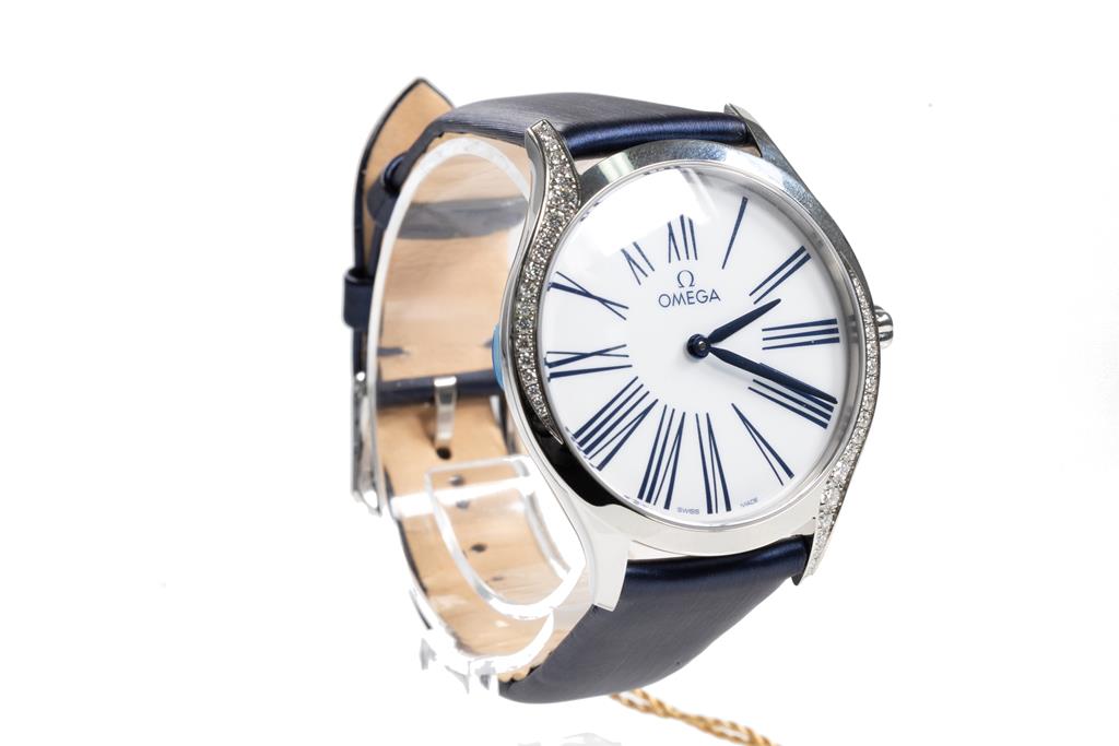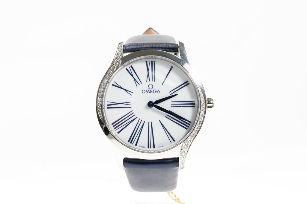 Omega Deville Tresor stainless steel quartz ladies watch. White dial, Diamonds on bezel, case diameter: 36mm, strap length: 18.5cm, Swiss made. Ref# 428.17.36.60.04.001. With Omega blue fabric strap and buckle. With Certificate of Authenticity, Omega International Warranty Card, Pictograms Card, Precious Stone Certificate Card and Omega box. 3 month FSA warranty. (Pre-owned)