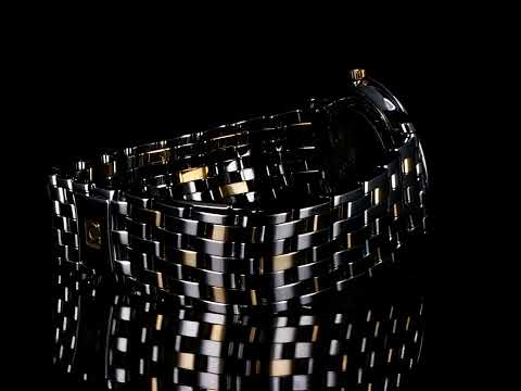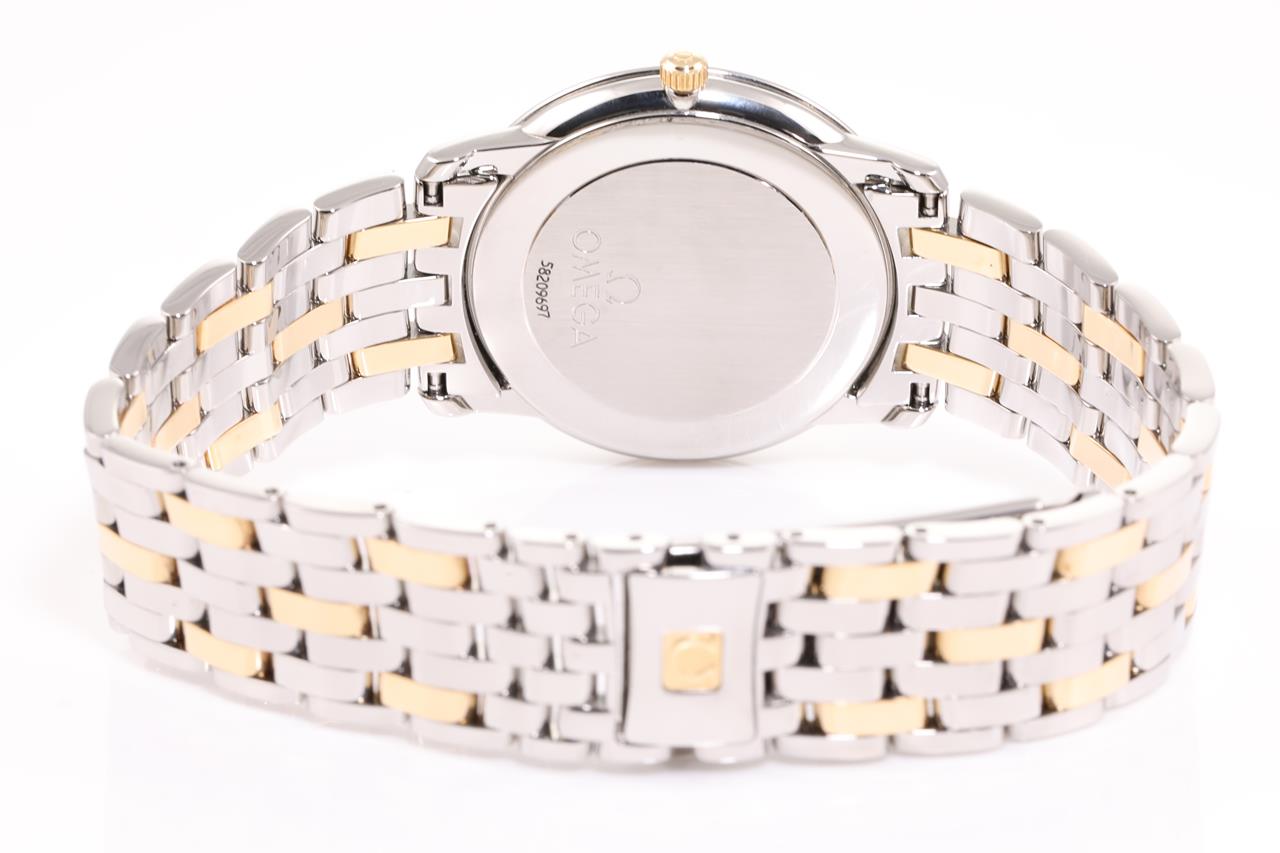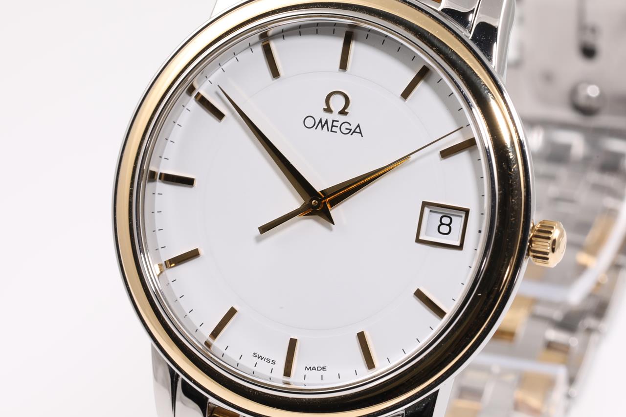 Omega DeVille 18ct yellow gold and stainless steel quartz watch. White dial, date, case diameter: 35mm, wrist size: 19cm, Swiss made. Ref# 4310.21.00. With Omega two tone bracelet and clasp. With Certificate of Authenticity, Omega International Warranty Card, Pictograms card and Omega box. 3 month FSA warranty. (Pre-owned)