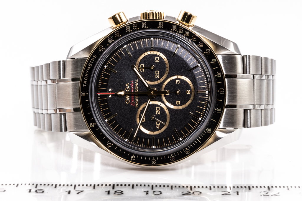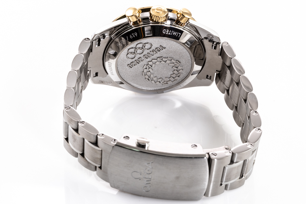 Omega Speedmaster Tokyo Olympic 2020 Limited Edition of 2020 stainless steel and 18ct rose gold manual winding mens watch. Black chronograph dial, case diameter: 42mm, wrist size: 19cm, Swiss made. Ref# 522.20.42.30.01.001. With Omega stainless steel bracelet and clasp. With Certificate of Authenticity. 3 month FSA warranty. (Pre-owned)