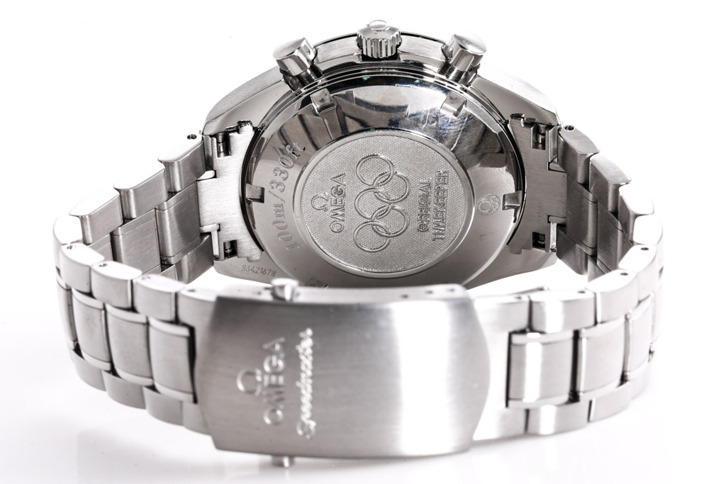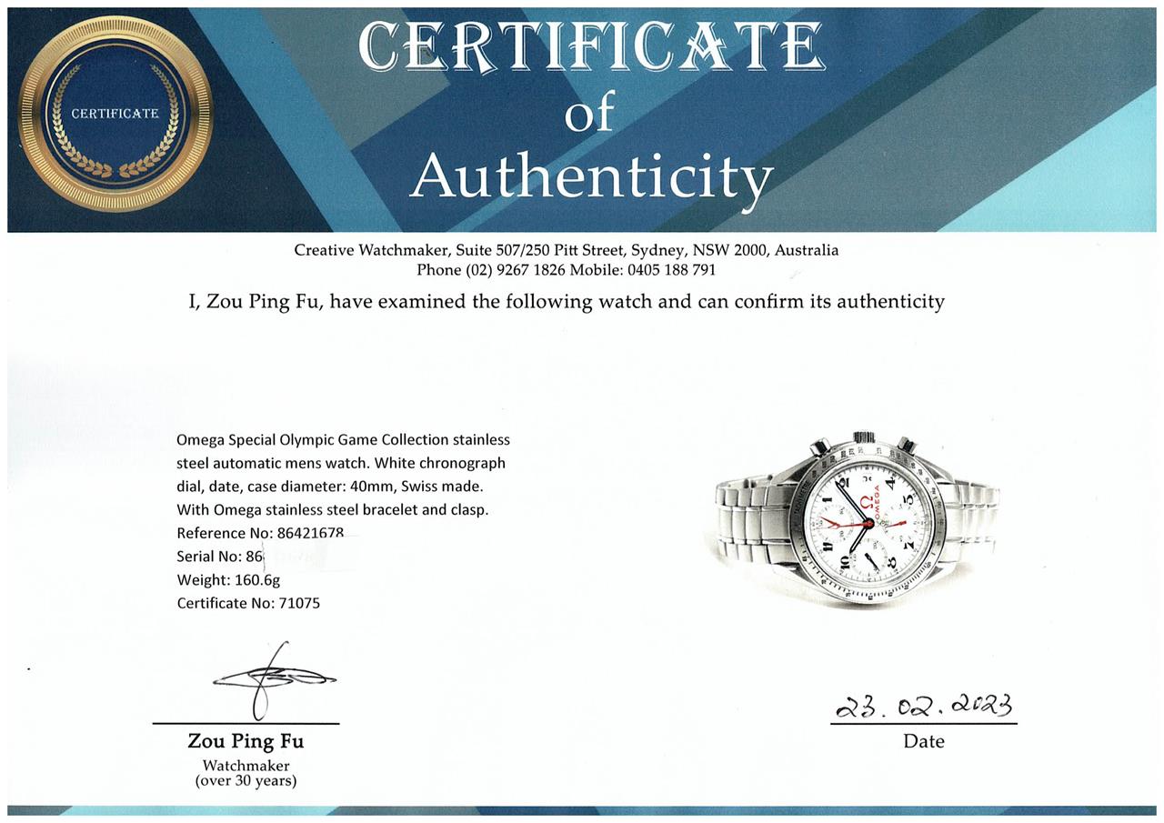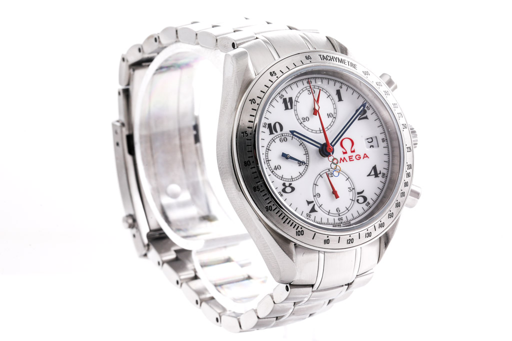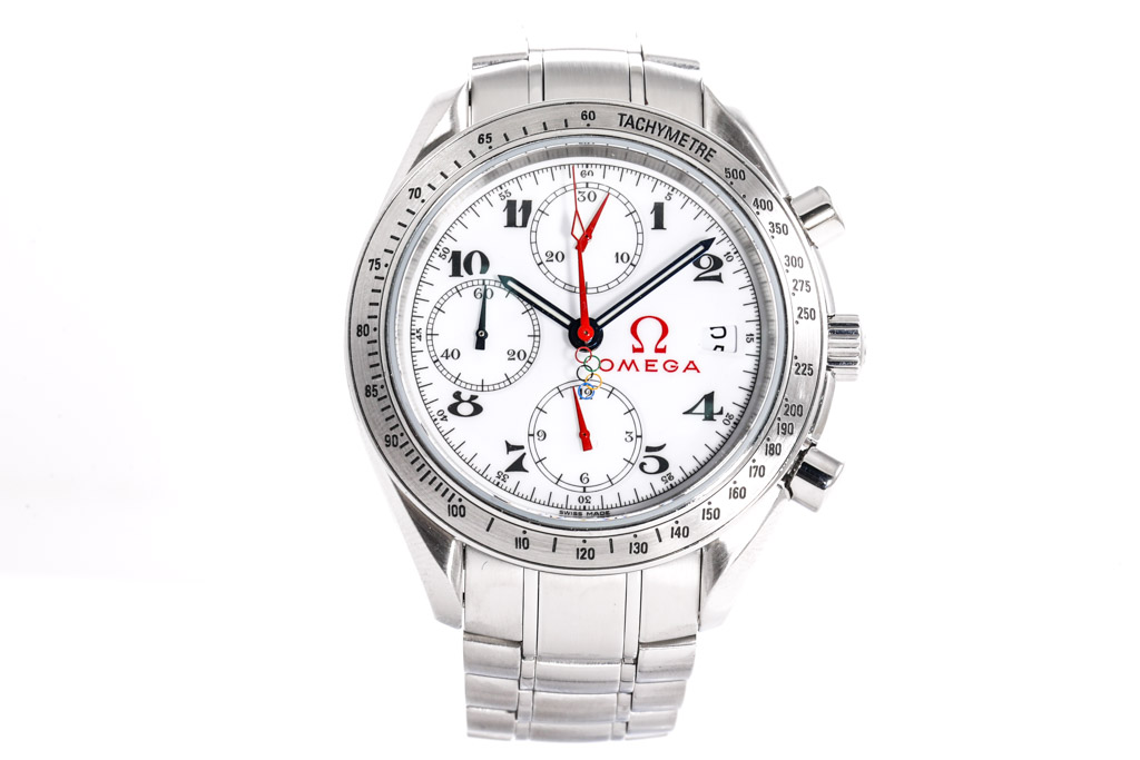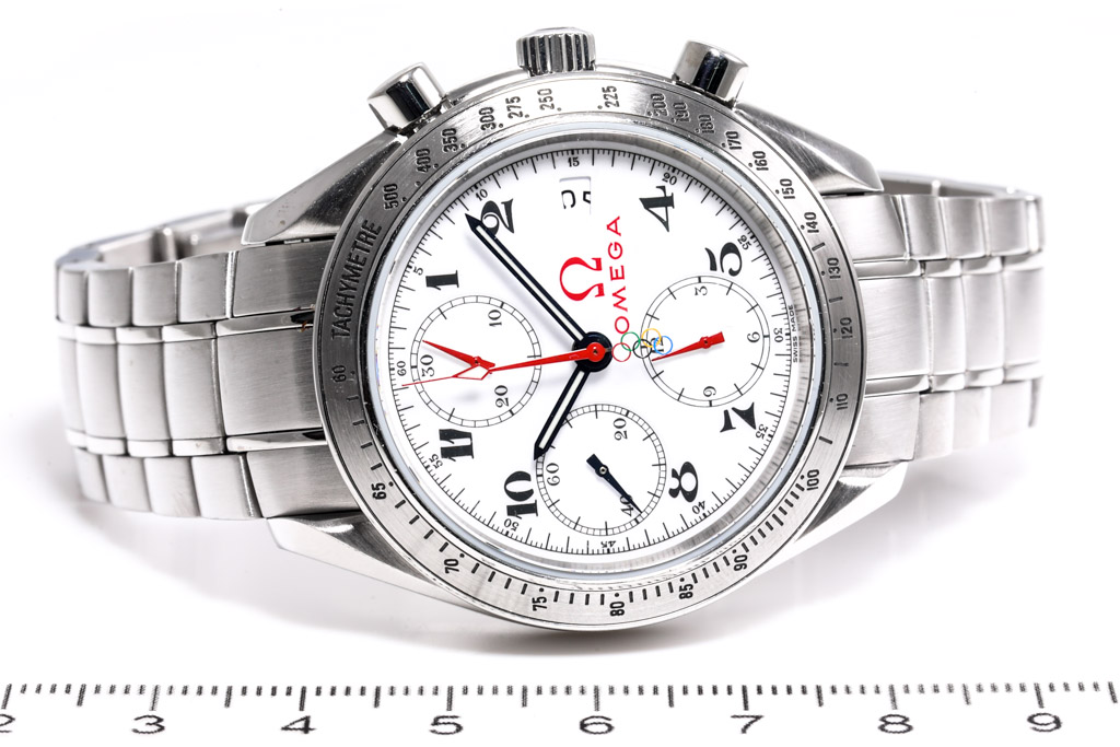 Omega Speedmaster Olympic Games Collection stainless steel automatic men's watch. White chronograph dial, date, case diameter: 40mm, wrist size: 18cm, Swiss made. Ref# 323.10.40.40.04.001. With Omega stainless steel bracelet and clasp. With Certificate of Authenticity and Omega box. 3 month FSA warranty (Pre-owned)