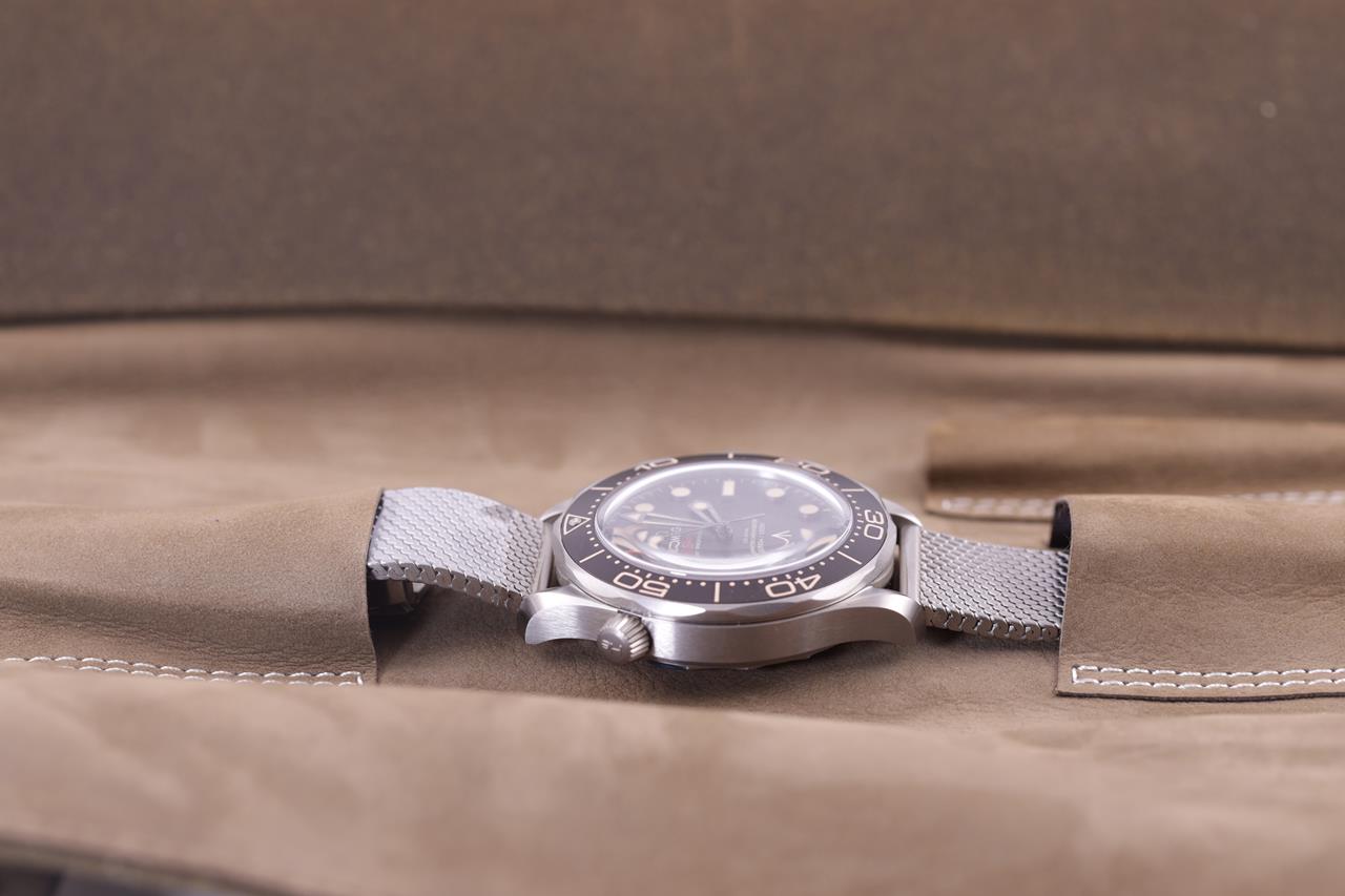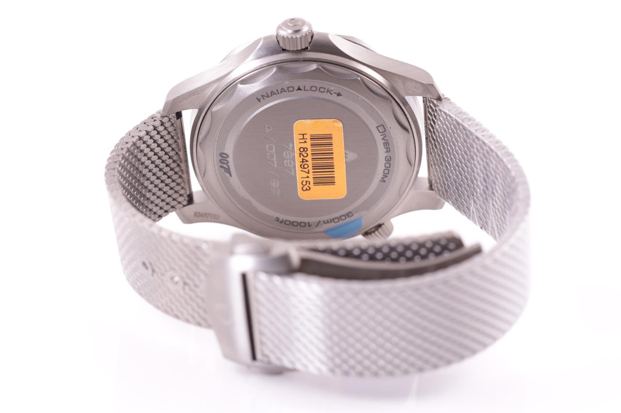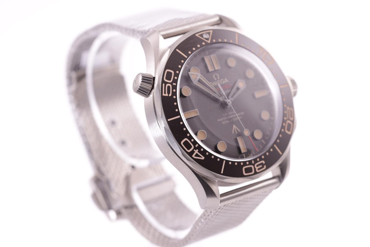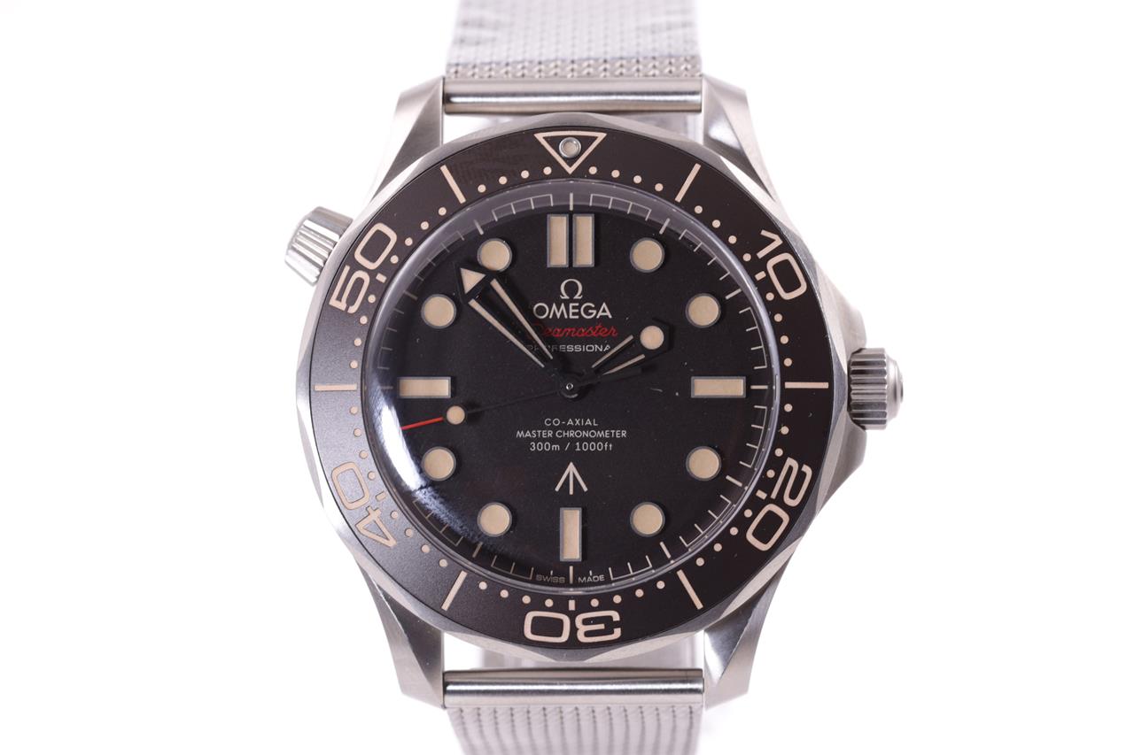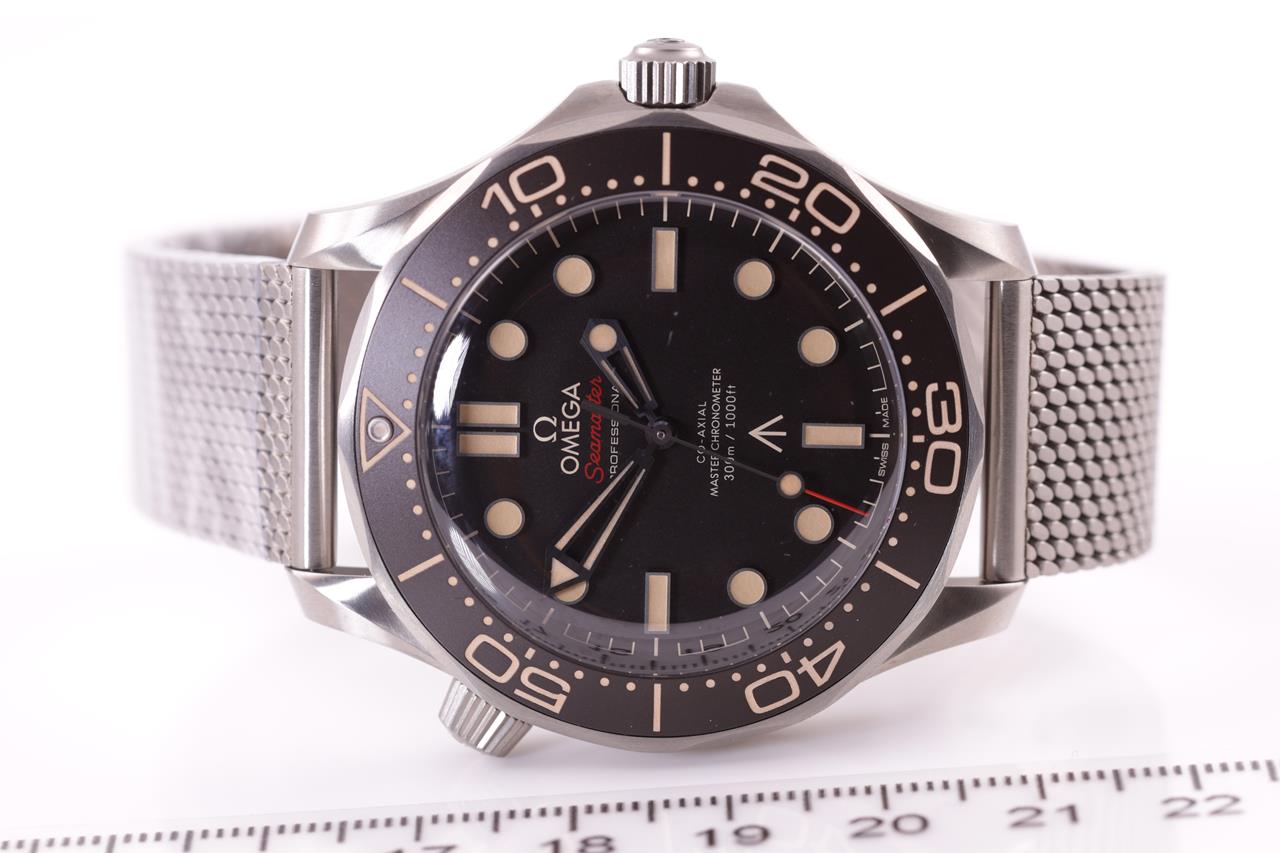 Omega Seamaster Co-axial Master Chronometre 007 Edition - identical to 007's watch in 'NO TIME TO DIE' titanium automatic watch. Black dial, case diameter: 42mm, wrist size: 18cm, Swiss made. Ref# 210.90.42.20.01.001. With Omega titanium mesh bracelet and clasp. With certificate of authenticity, Omega international warranty card dated 26/02/2020, pictograms, Master chronometre card, Omega pen, spare strap, handkerchief and Omega box. 3 month FSA warranty. (Pre-owned)