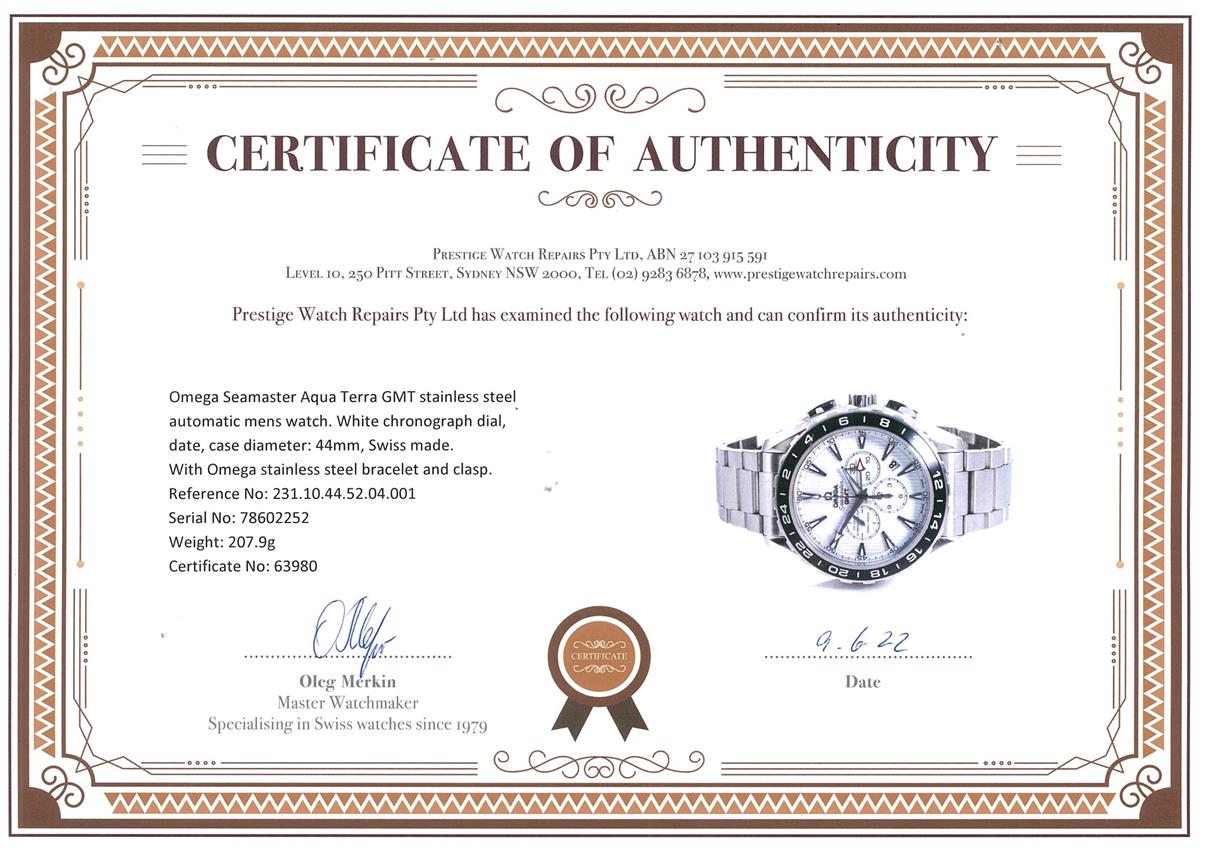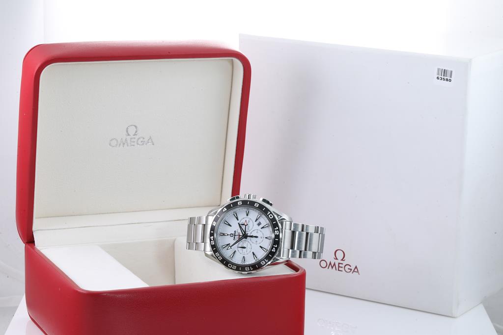 Omega Seamaster Aqua Terra GMT stainless steel automatic mens watch. White chronograph dial, date, case diameter: 44mm, wrist size: 19cm, Swiss made. Ref# 231.10.44.52.04.001, Circa: 2006. With Omega stainless steel bracelet and clasp. With Certificate of Authenticity, Omega International warranty card, Pictograms Card and Omega box. 3 month FSA warranty. (Pre-owned)