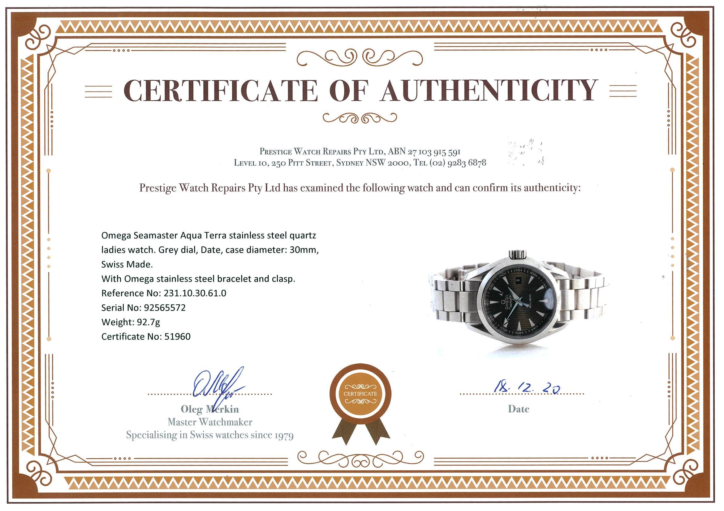 Omega Seamaster Aqua Terra stainless steel quartz ladies watch. Brown dial, Date, case diameter: 30mm, wrist size: 16.5cm, Swiss Made. With Omega stainless steel bracelet and clasp. Ref# 231.10.30.61.0. With Certificate of Authenticity and Omega International warranty Card inside Omega box (Pre-owne