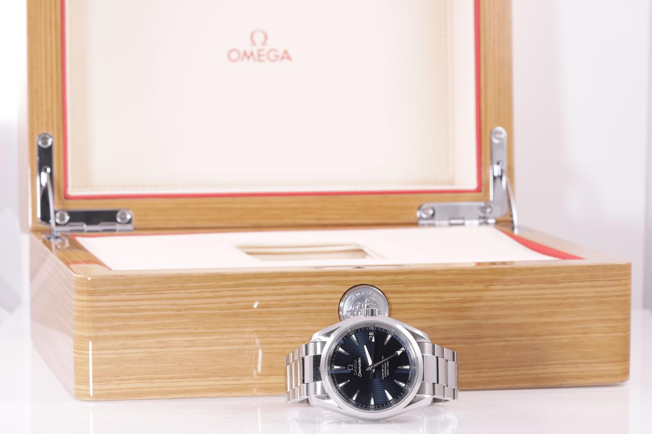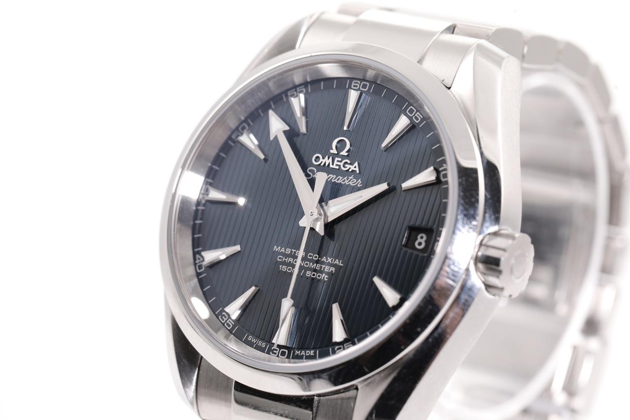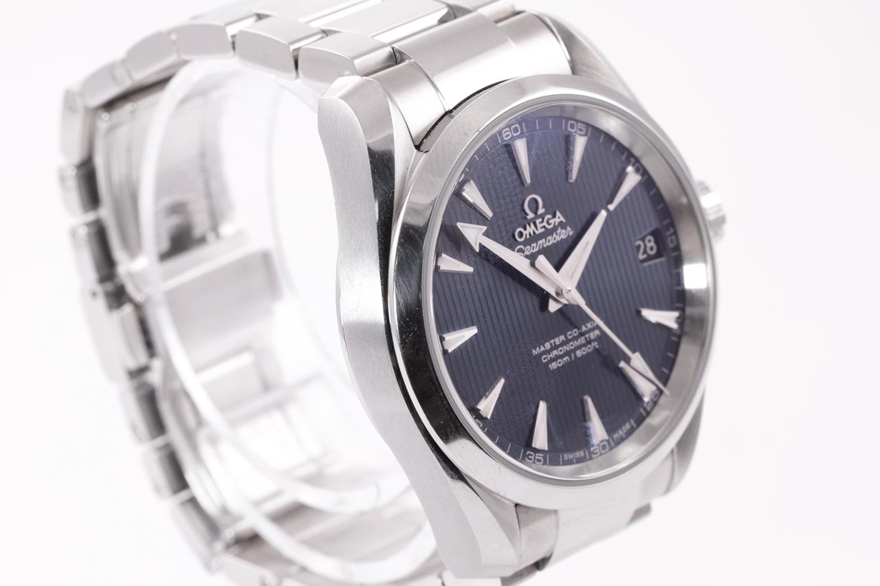 Omega Seamaster Aqua Terra Master Co-axial stainless steel automatic mens watch. Blue dial, date, case diameter: 38.5mm, wrist size: 15.5cm, Swiss made. Ref# 231.10.39.21.03.002. With Omega stainless steel bracelet and clasp. With Certificate of Authenticity, Omega International warranty card, pictograms card and Omega box. 3 month FSA warranty. (Pre-owned)