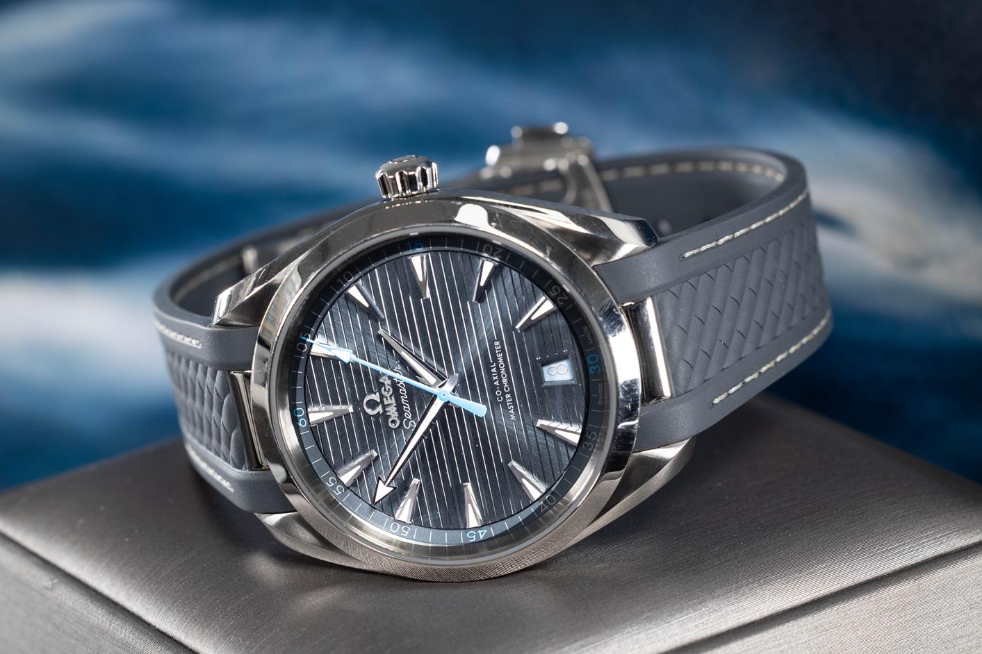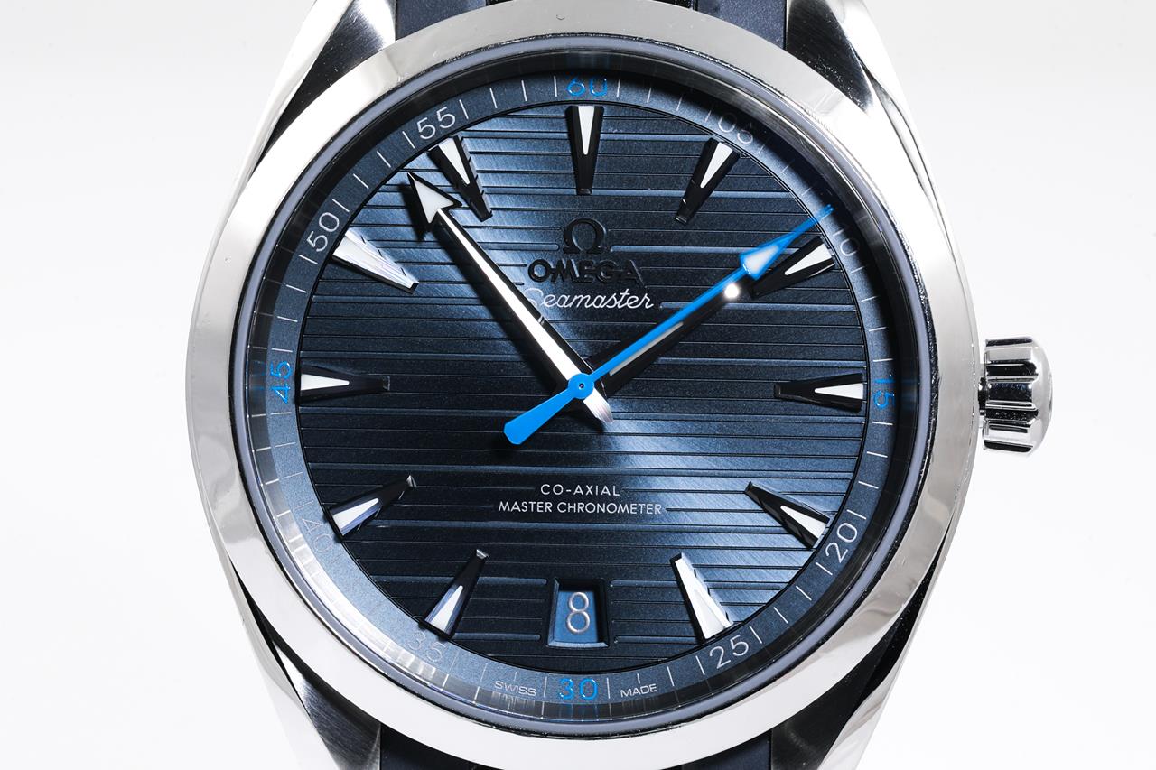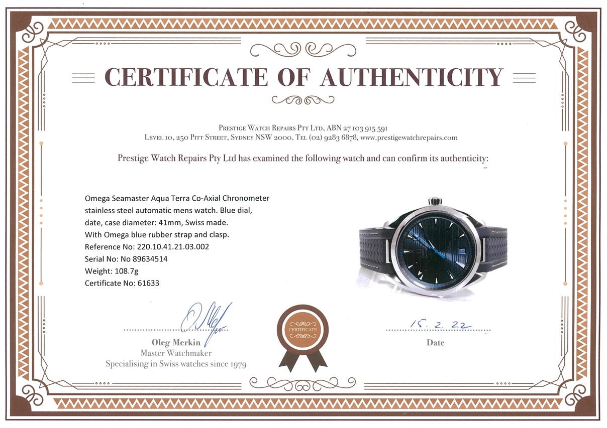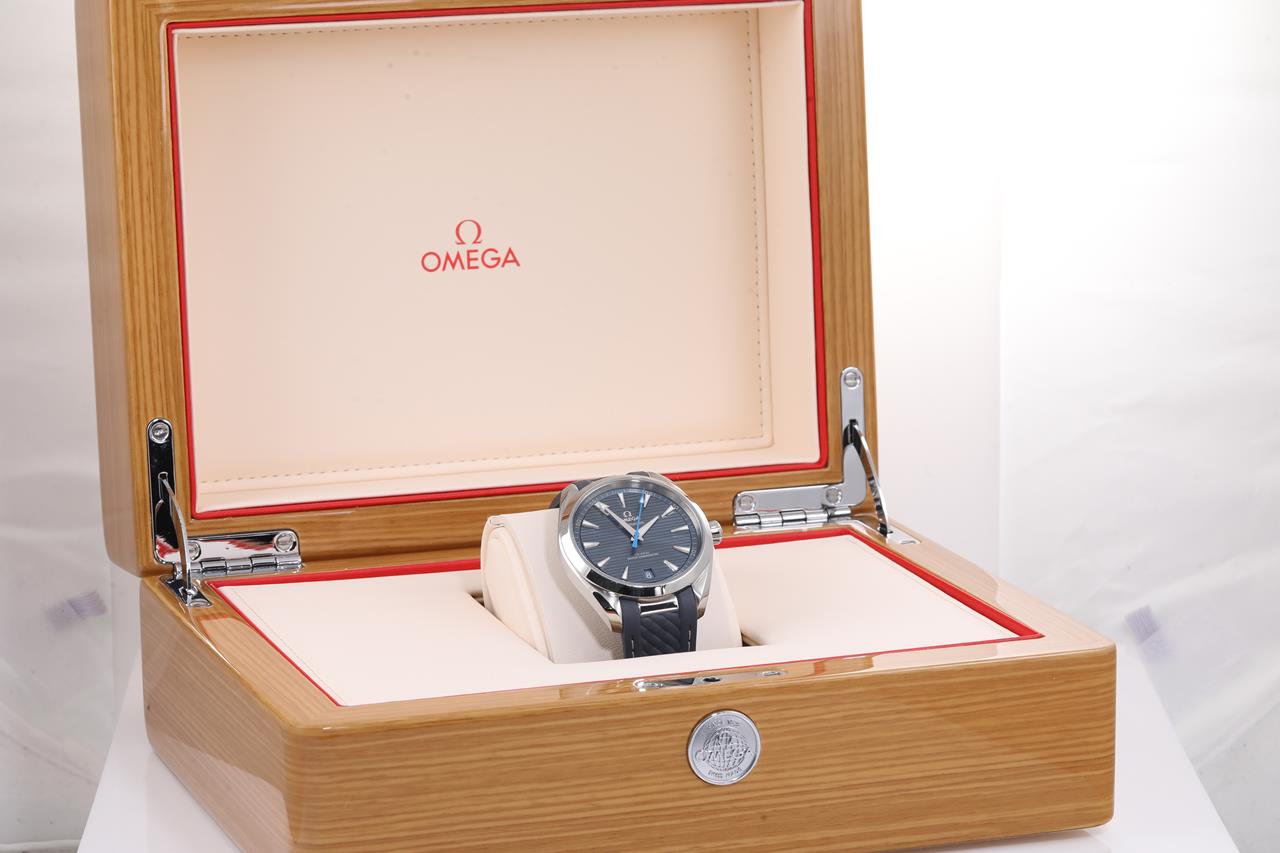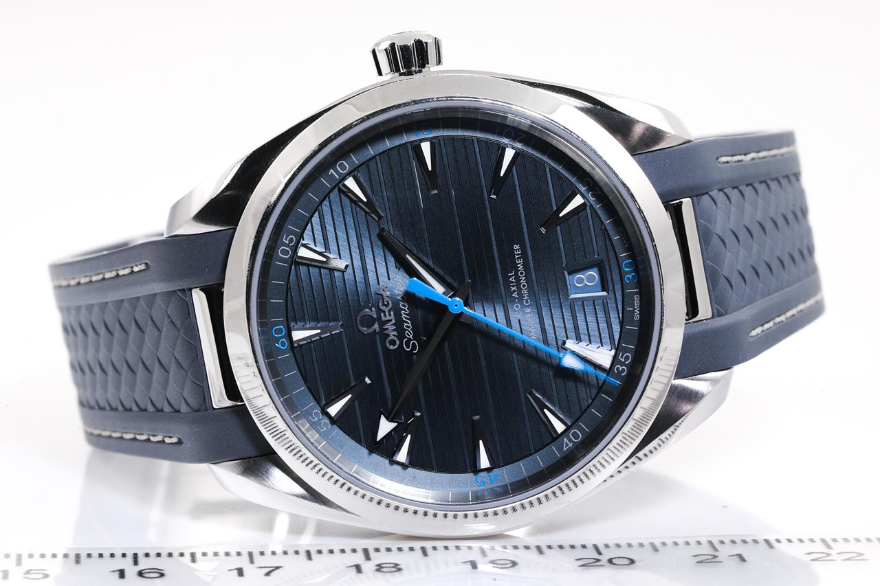 Omega Seamaster Aqua Terra Co-Axial Chronometer stainless steel automatic mens watch. Blue dial, date, case diameter: 41mm, wrist size: 20cm, Swiss made. Ref# 220.10.41.21.03.002. With Omega blue rubber strap and clasp. With Certificate of Authenticity, Omega International Warranty card dated 4/6/2020, Master Chronometer Card, Pictograms Card and Omega box. 3 month FSA warranty. (Pre-owned)