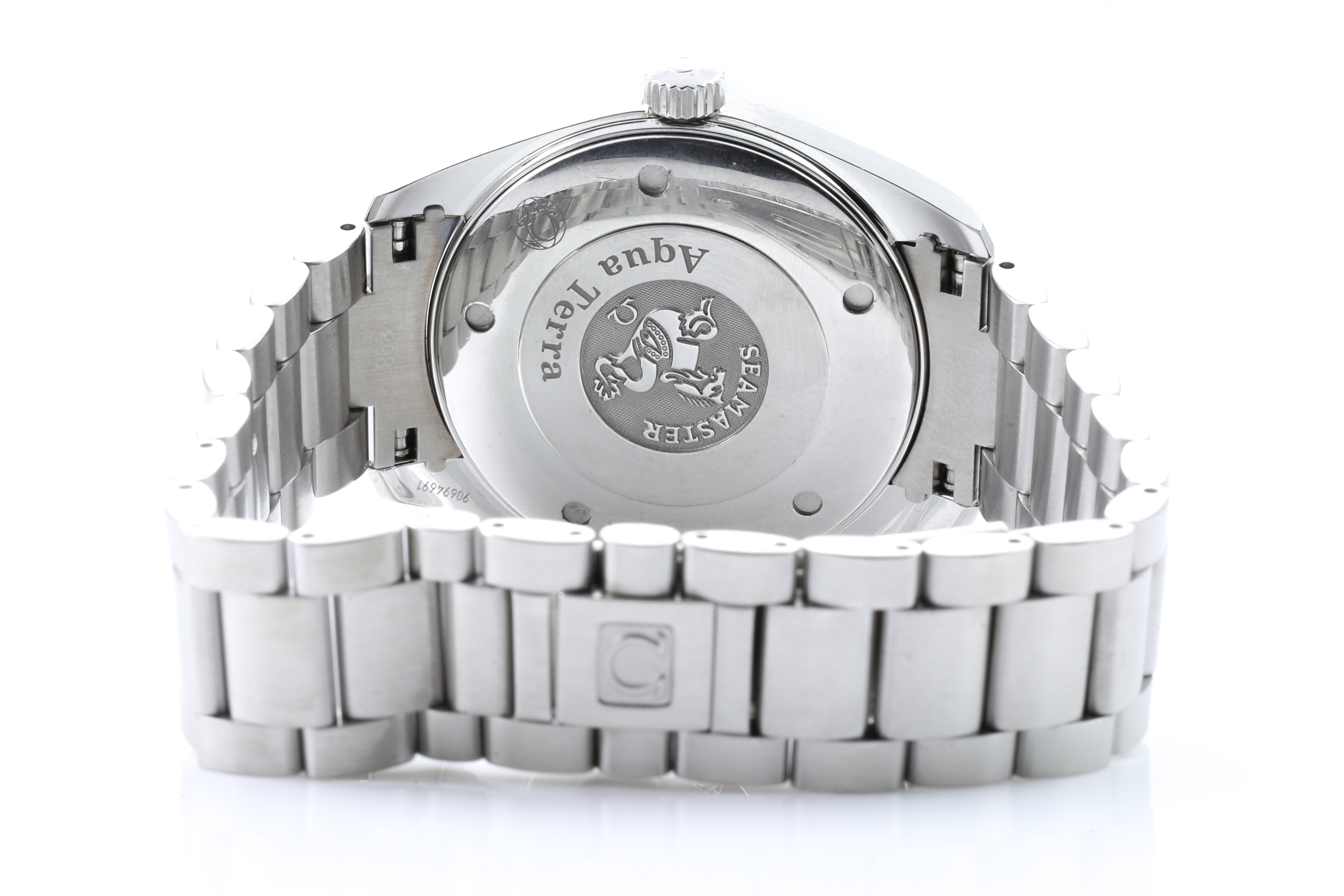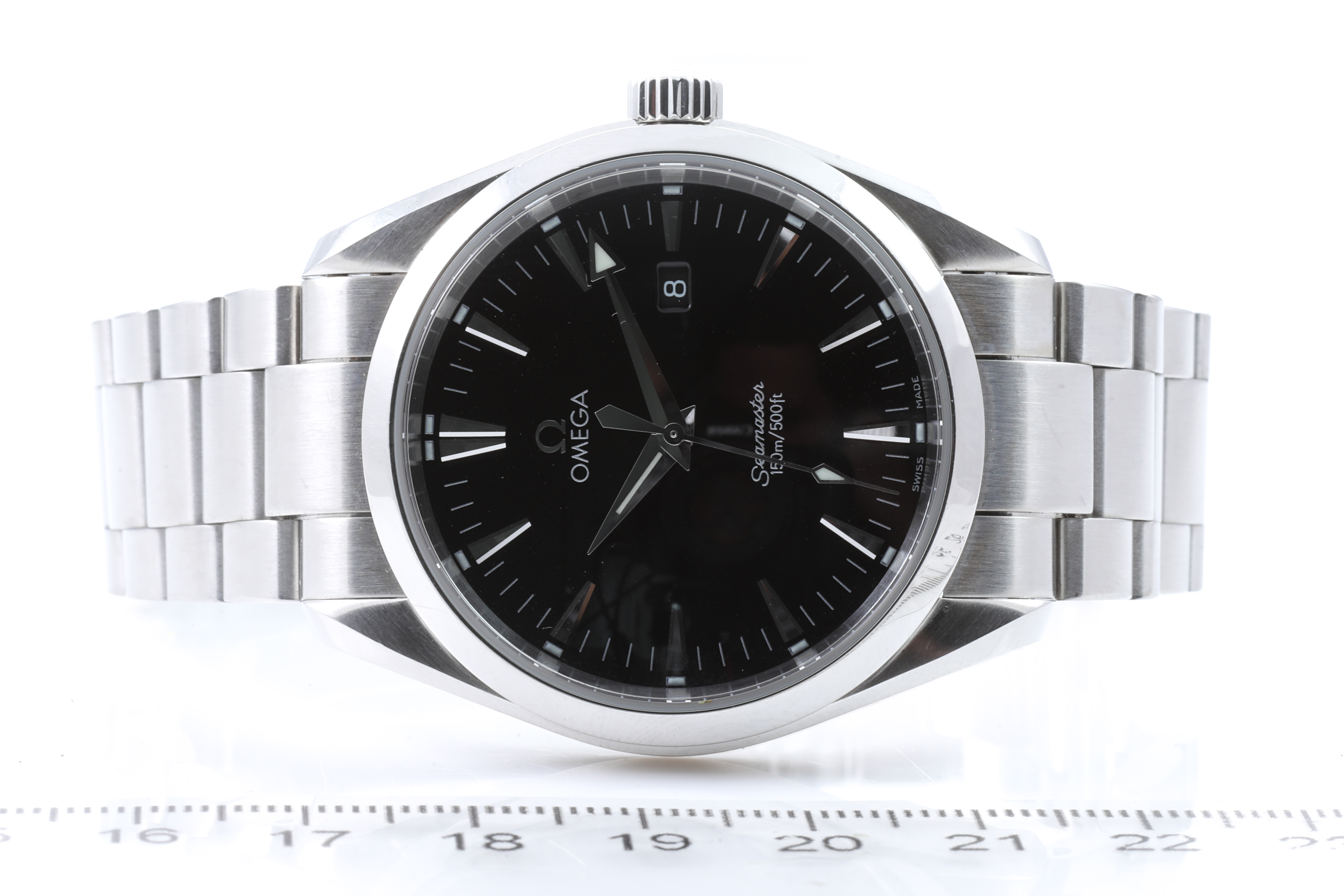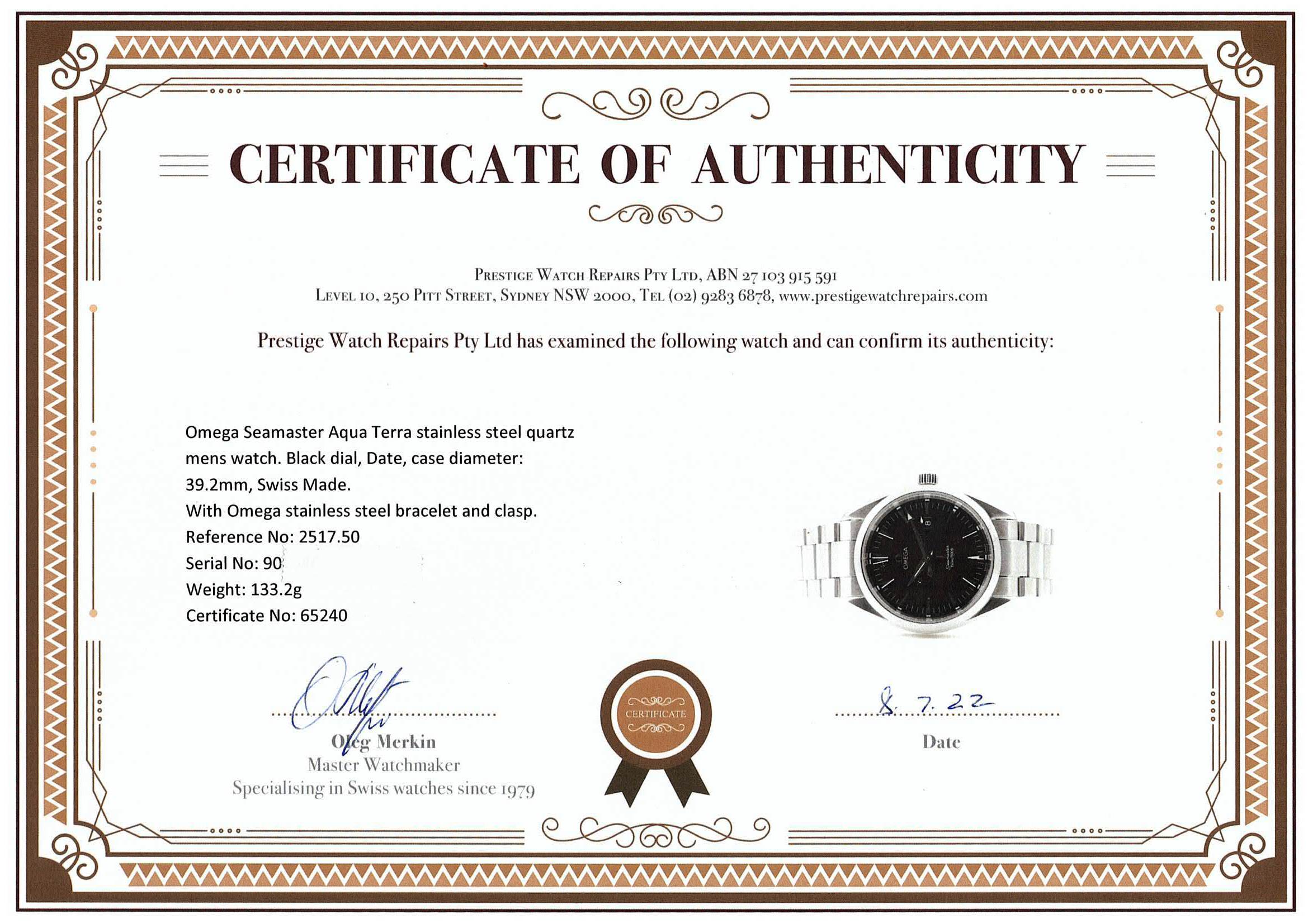 Omega Seamaster Aqua Terra stainless steel quartz mens watch. Black dial, Date, case diameter: 39.2mm, wrist size: 20cm, Swiss made. With Omega stainless steel bracelet and clasp. Ref# 2517.50, Circa: 2010. With Certificate of Authenticity, Omega International Warranty Card dated 24/09/2009, Pictograms Card and Omega box. 3 month FSA warranty. (Pre-owned)