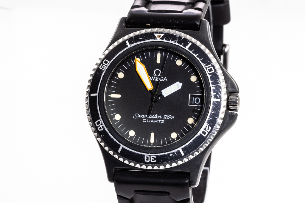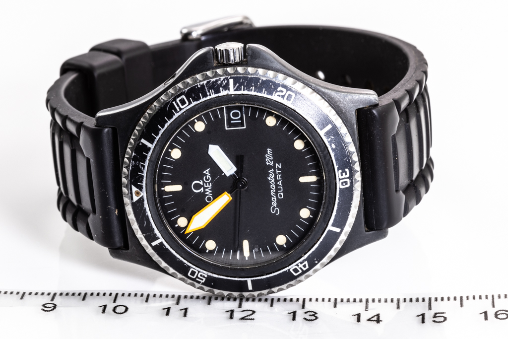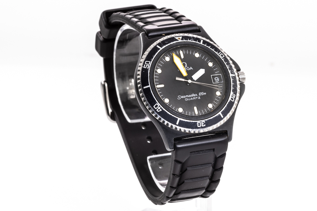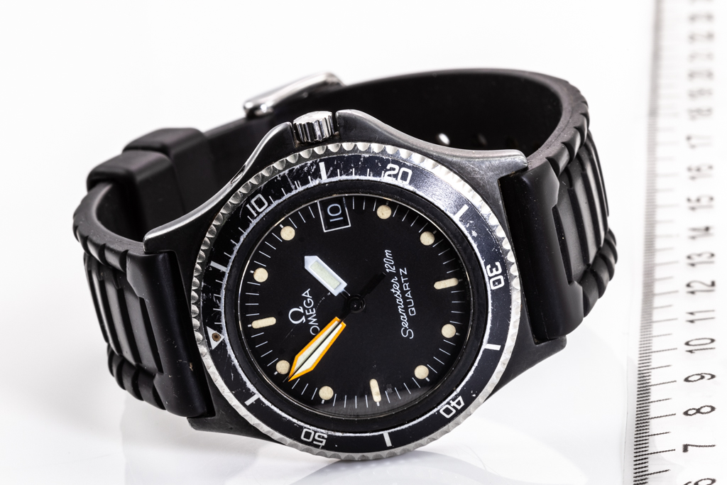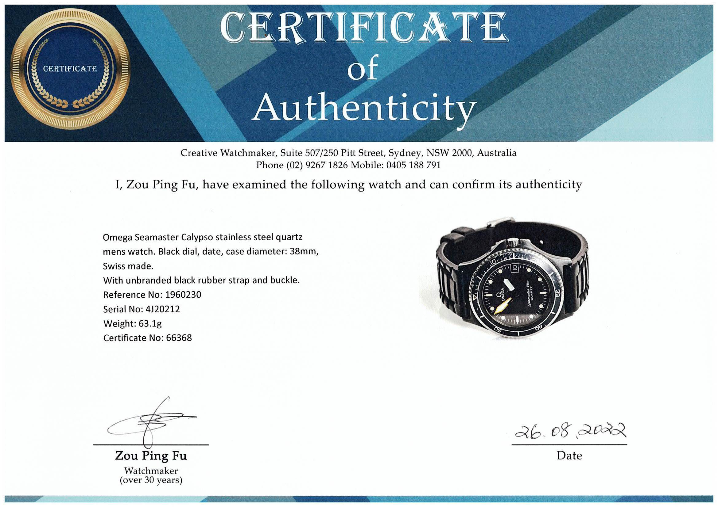 Omega Seamaster Calypso stainless steel quartz mens watch. Black dial, date, case diameter: 38mm, strap length: 21cm, Swiss made. Ref# 1960230. With unbranded black rubber strap and buckle. With Certificate of Authenticity. 3 month FSA warranty. (Pre-owned)