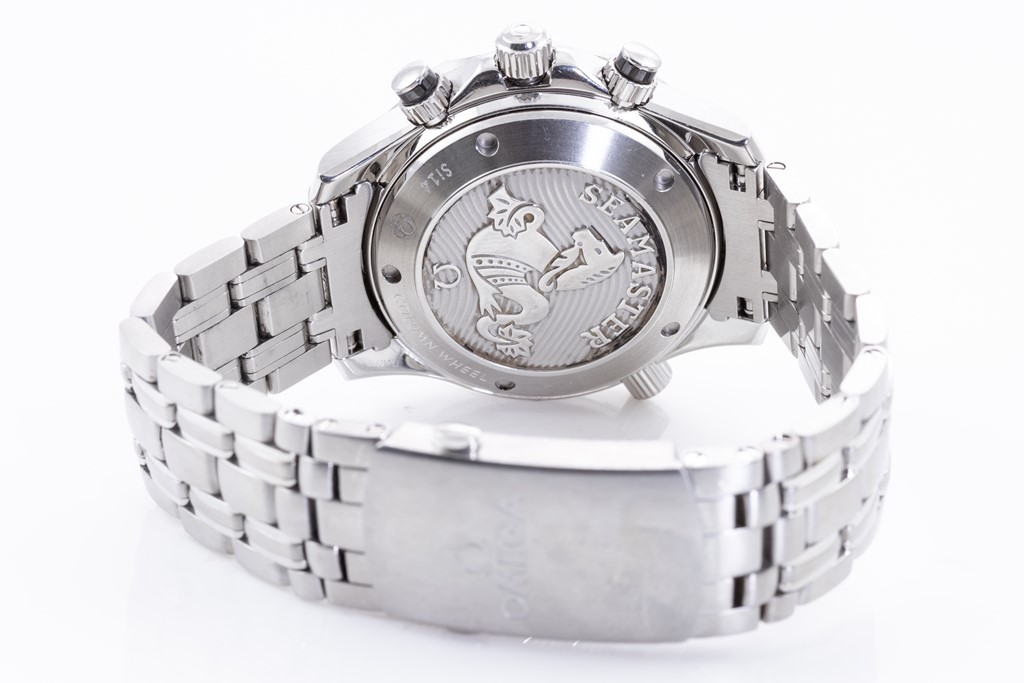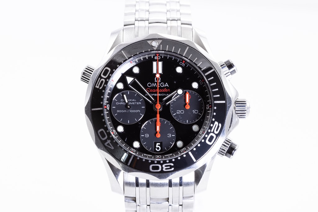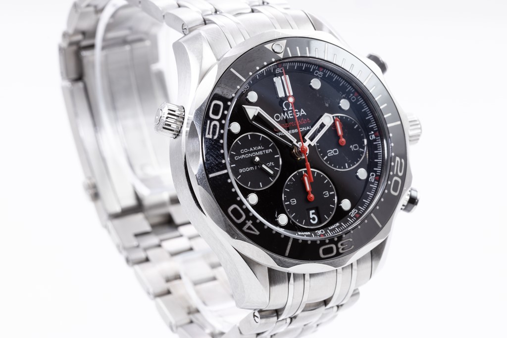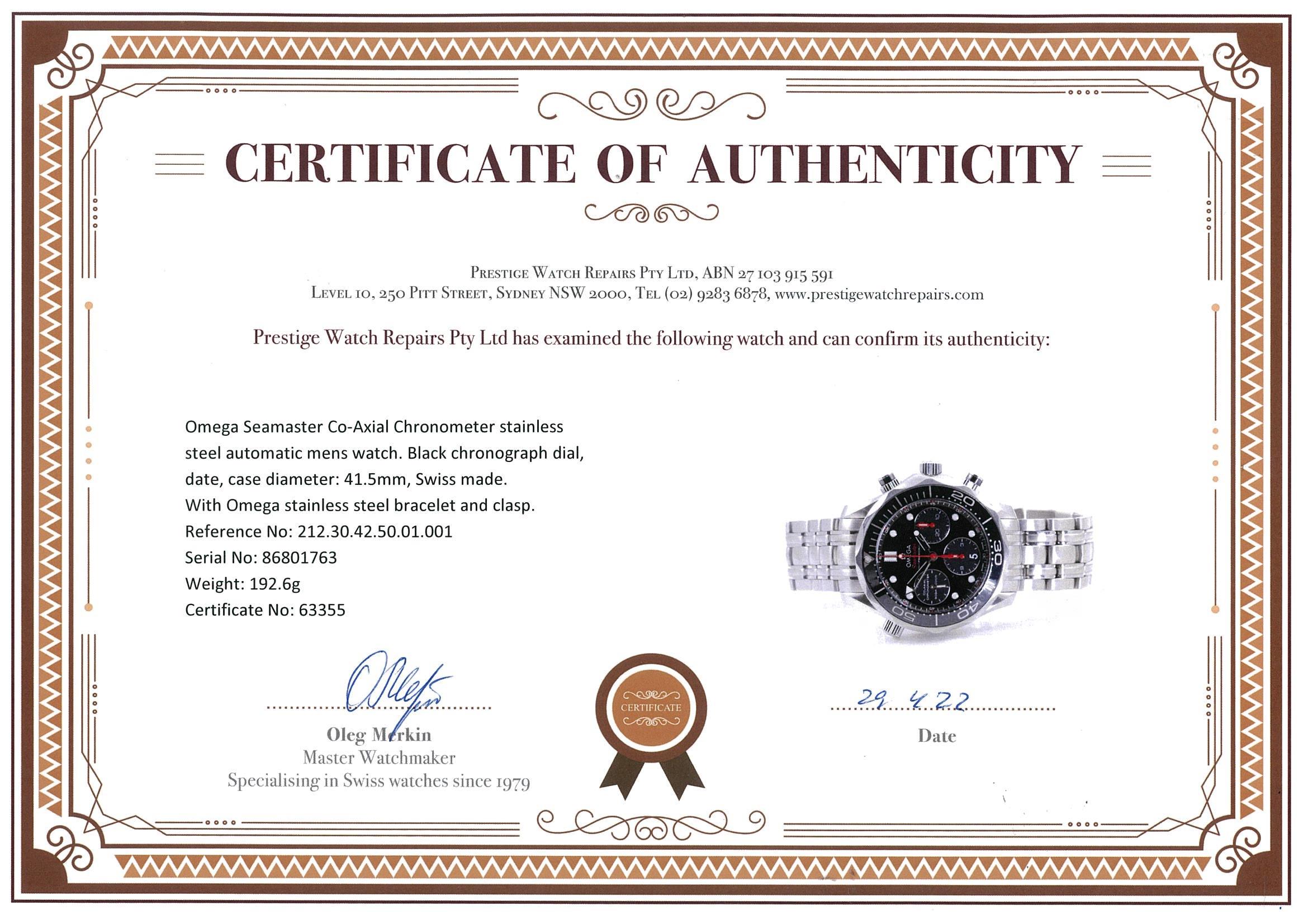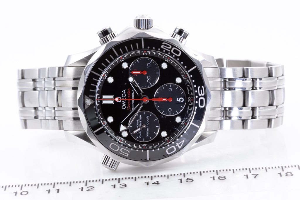 Omega Seamaster Co-Axial Diver 300M stainless steel automatic mens watch. Black chronograph dial, date, case diameter: 41.5mm, wrist size: 19.5cm, Swiss made. Ref# 212.30.42.50.01.001. Circa: 2008. With Omega stainless steel bracelet and clasp. With Certificate of Authenticity, Omega International Warranty card dated 08/2018, Pictograms Card and Omega box. 3 month FSA warranty. (Pre-owned)