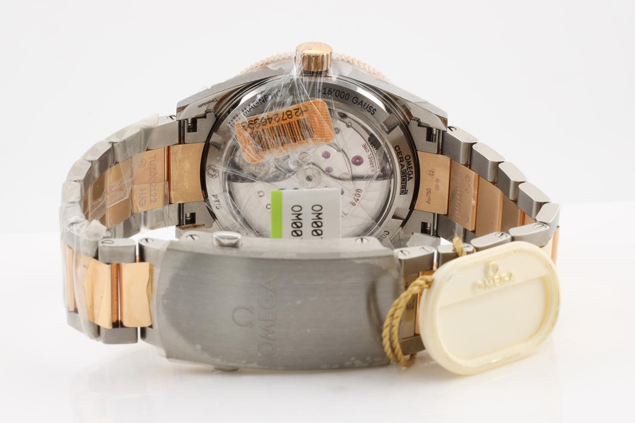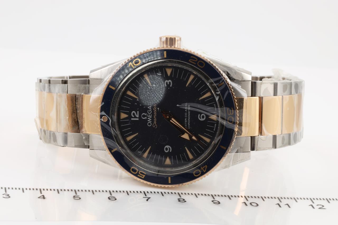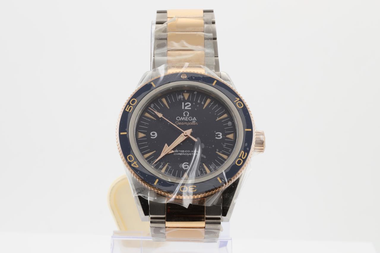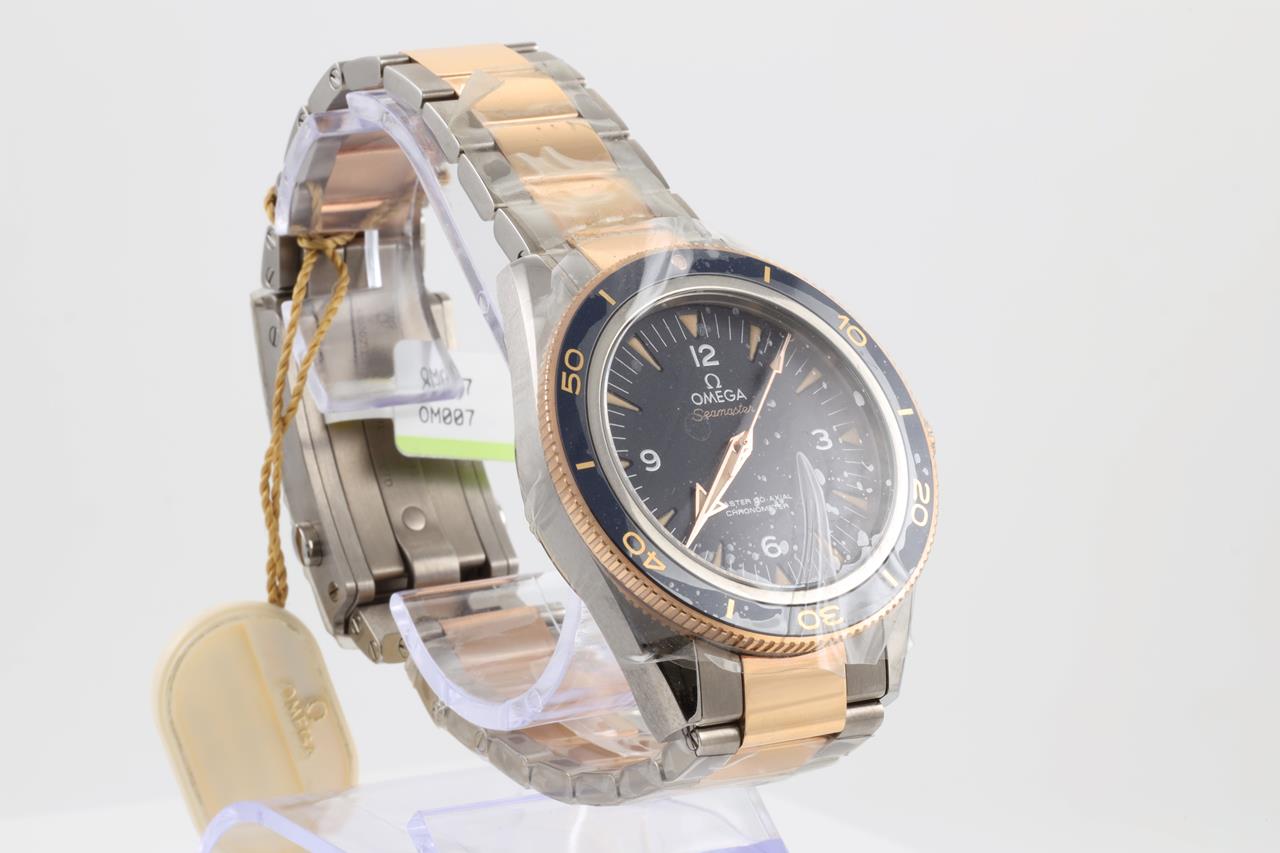 Omega Seamaster 300 Co-Axial 18ct rose gold and titanium automatic mens watch. Black dial, case diameter: 41mm, Swiss made. Ref #233.60.41.21.03.001. With Omega two-tone bracelet and clasp. With Omega operating instructions booklet inside Omega box. 3 month FSA warranty. (New, in original wrapping).