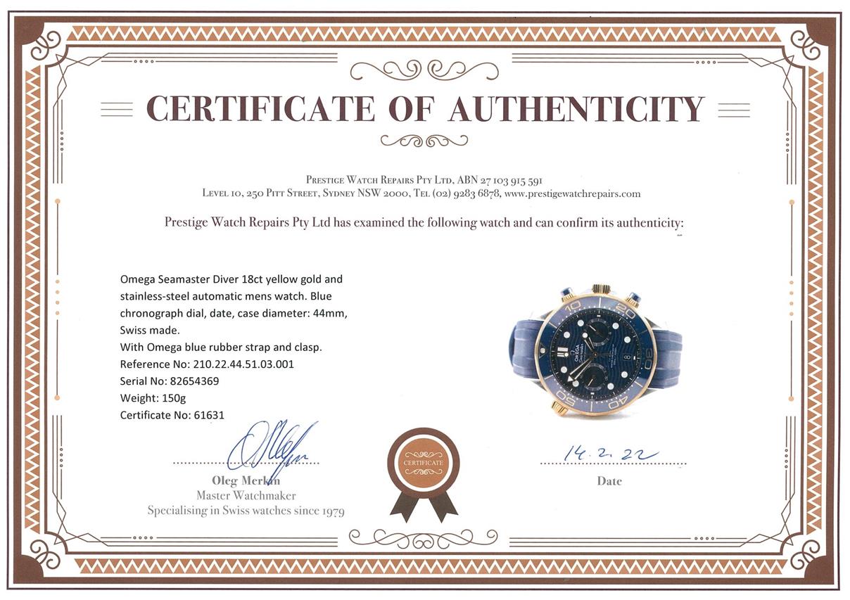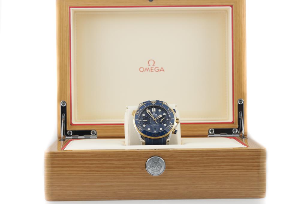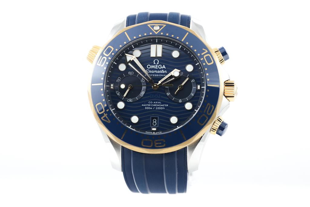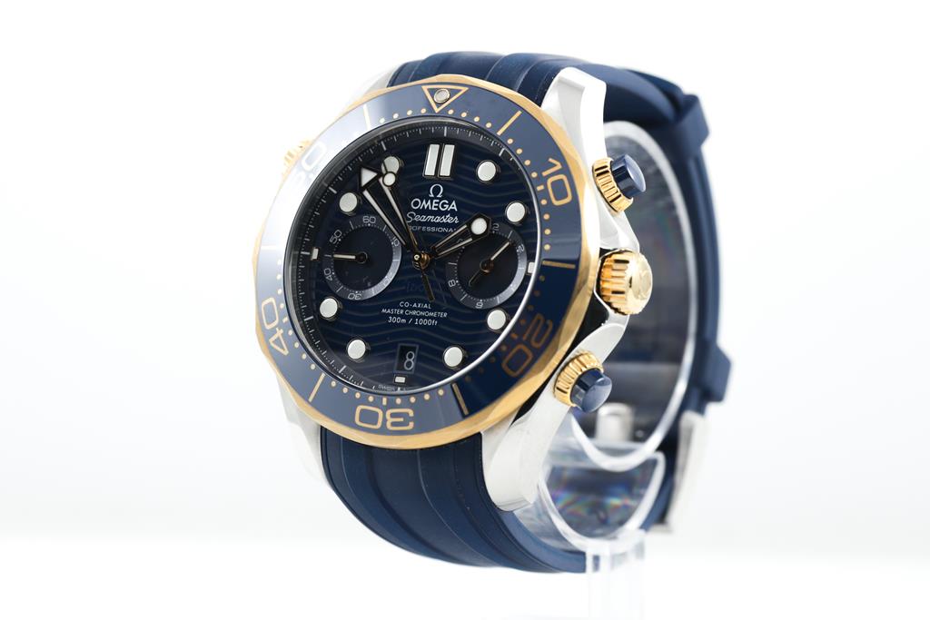 Omega Seamaster Diver 18ct yellow gold and stainless steel automatic mens watch. Blue chronograph dial, date, case diameter: 44mm, length: 23cm, Swiss made. Ref# 210.22.44.51.03.001. With Omega blue rubber strap and clasp. With Certificate of Authenticity, Omega International Warranty Card dated 14/9/2020, Pictograms Card, Master Chronometer card and Omega box. 3 month FSA warranty. (Pre-owned)