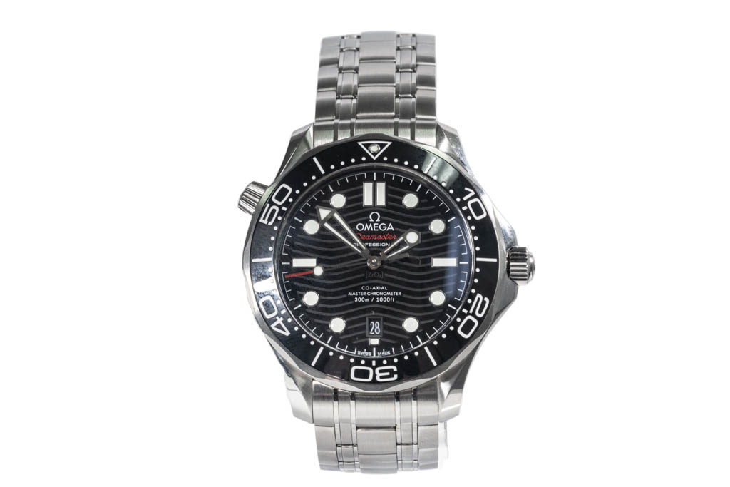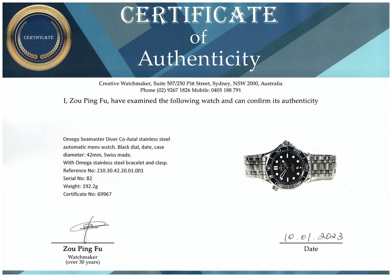 Omega Seamaster Diver Co-Axial stainless steel automatic men's watch. Black dial, date, case diameter: 42mm, wrist size: 21cm, Swiss made. Ref# 210.30.42.20.01.001. With Omega stainless steel bracelet and clasp. With Certificate of Authenticity, Omega International Warranty Card dated 29/09/2019, Omega Master Chronometer Certificate Card, omega Pictograms Card and Omega box. 3 month FSA warranty (Pre-Owned)