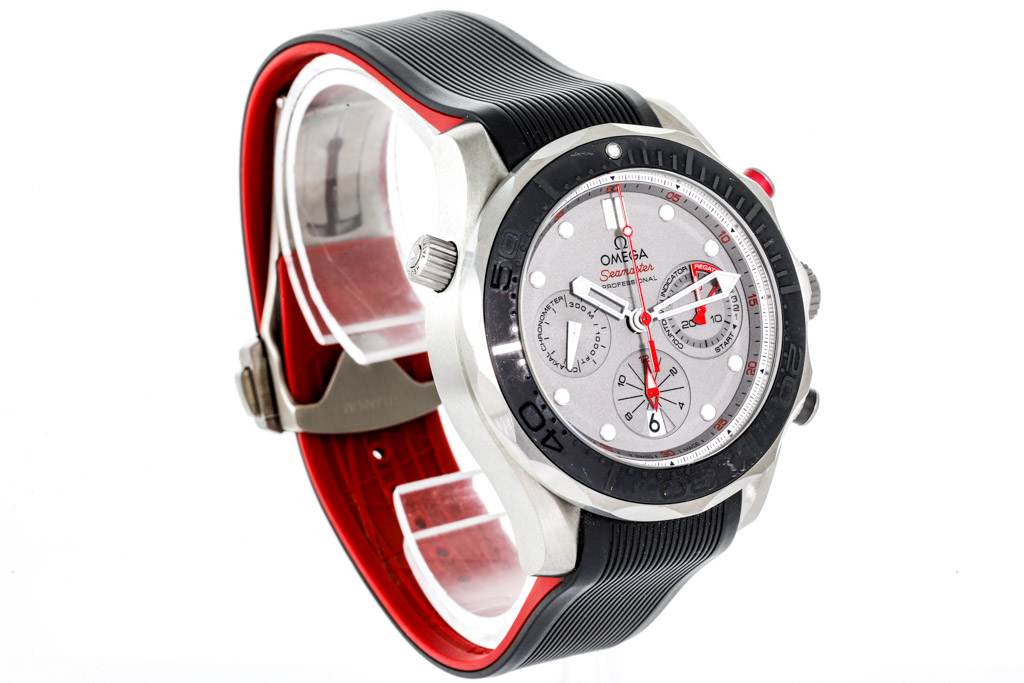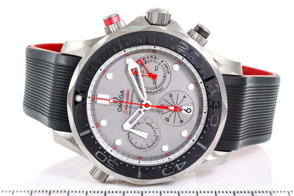 Omega Seamaster Diver Co-axial titanium automatic mens watch. Grey chronograph dial, date, case diameter: 44mm, adjustable max wrist size: 20.5cm, Swiss made. Ref# 212.92.44.50.99.001. With Omega Black/red rubber strap and clasp. With Certificate of Authenticity, Omega International Warranty card dated 27/06/2018, Omega Pictograms card and Omega box. 3 month FSA warranty (Pre-owned)