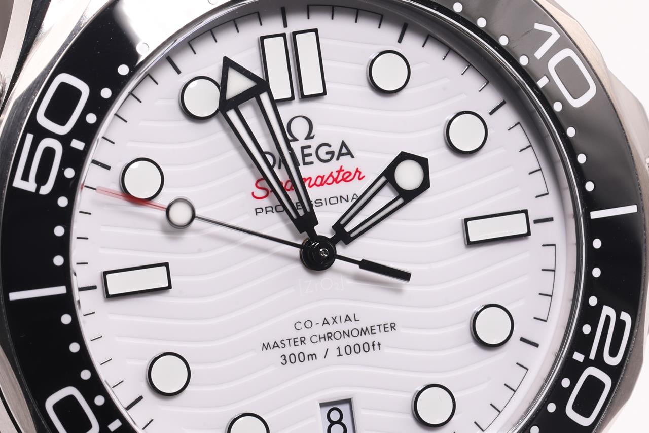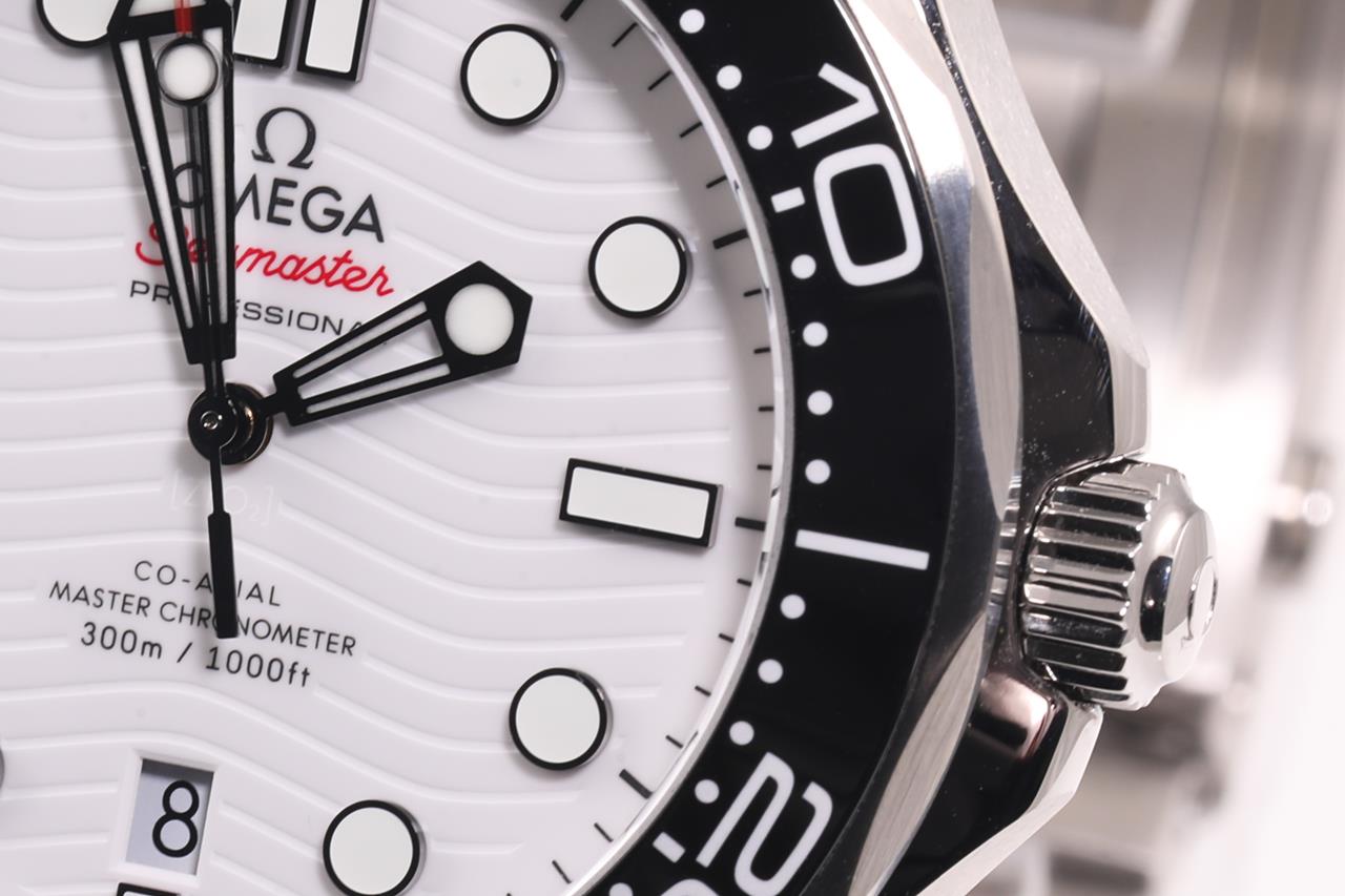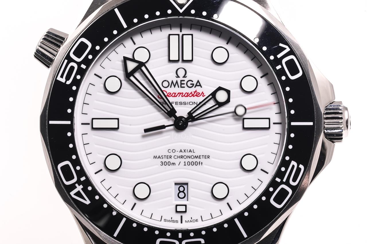 Omega Seamaster Diver stainless steel automatic mens watch. White dial, date, case diameter: 42mm, wrist size: 21cm, Swiss made. Ref# 210.30.42.20.04.001. With Omega stainless steel bracelet and clasp. With Certificate of authenticity, Omega International Warranty Card dated 20/12/2021, Master Chronometer Card, Pictograms Card and Omega box. 3 month FSA warranty. (Pre-owned)