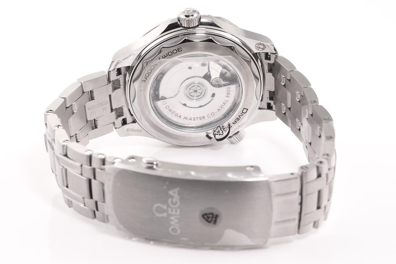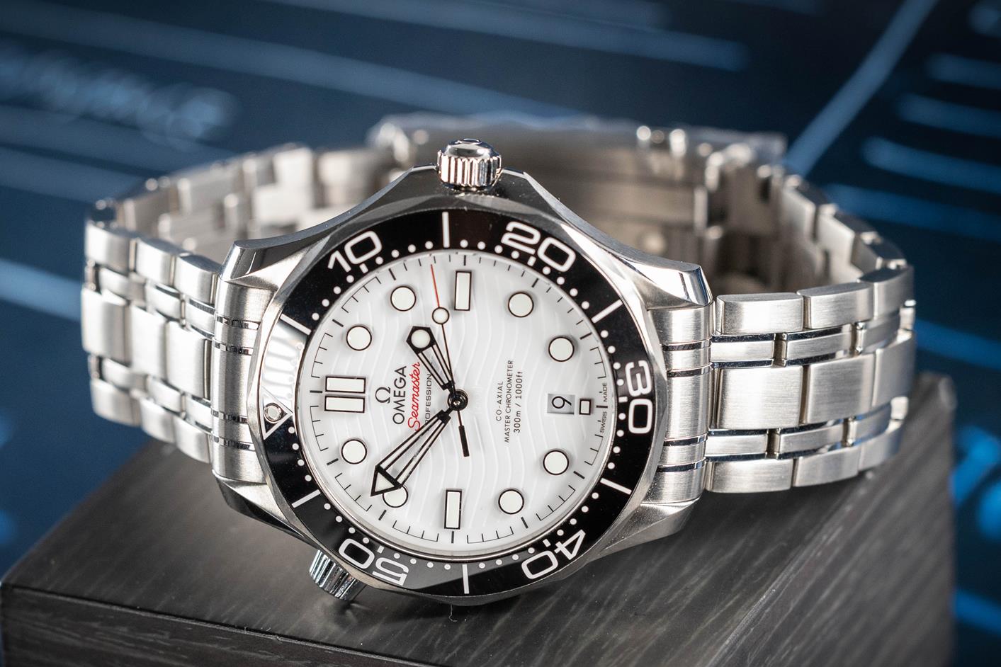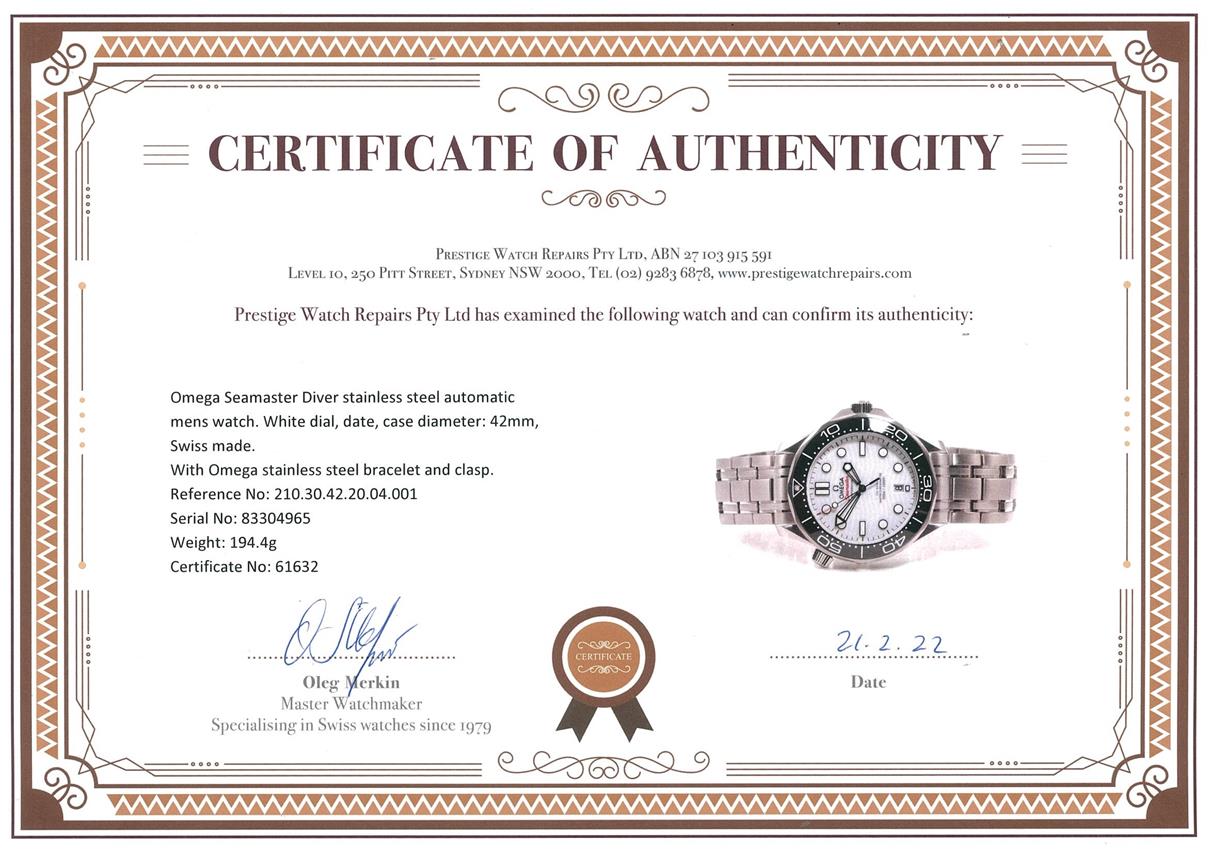 Omega Seamaster Diver stainless steel automatic mens watch. White dial, date, case diameter: 42mm, wrist size: 21cm, Swiss made. Ref# 210.30.42.20.04.001. With Omega stainless steel bracelet and clasp. With Certificate of authenticity, Omega International Warranty Card dated 20/12/2021, Master Chronometer Card, Pictograms Card and Omega box. 3 month FSA warranty. (Pre-owned)