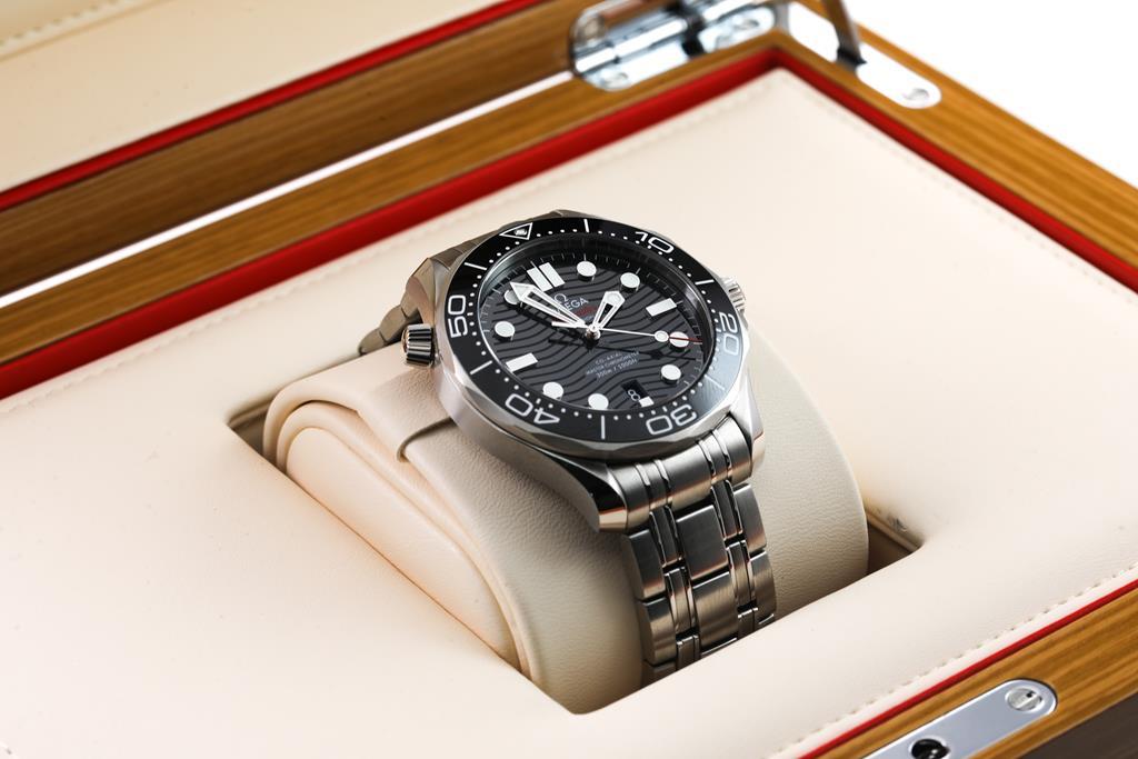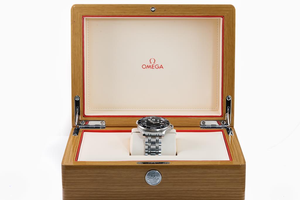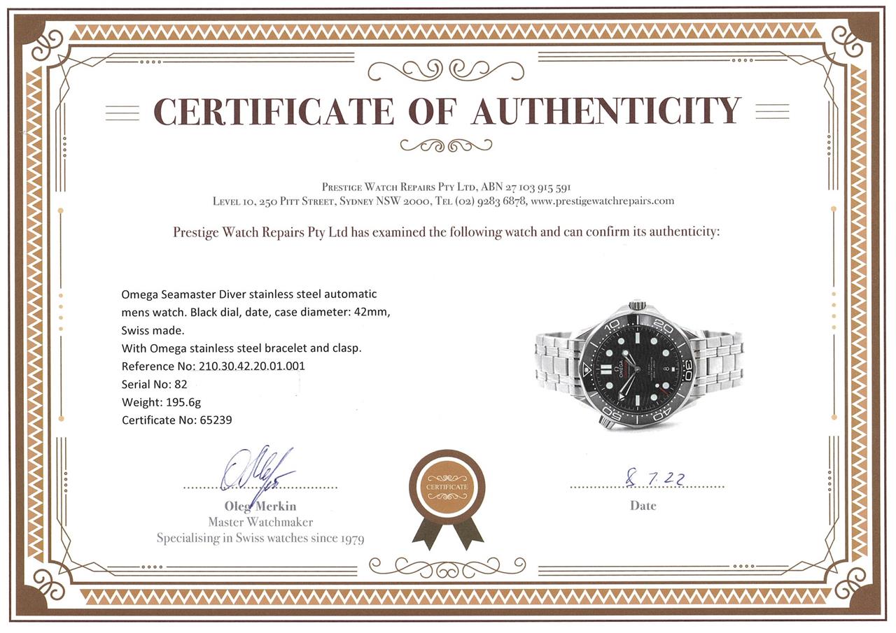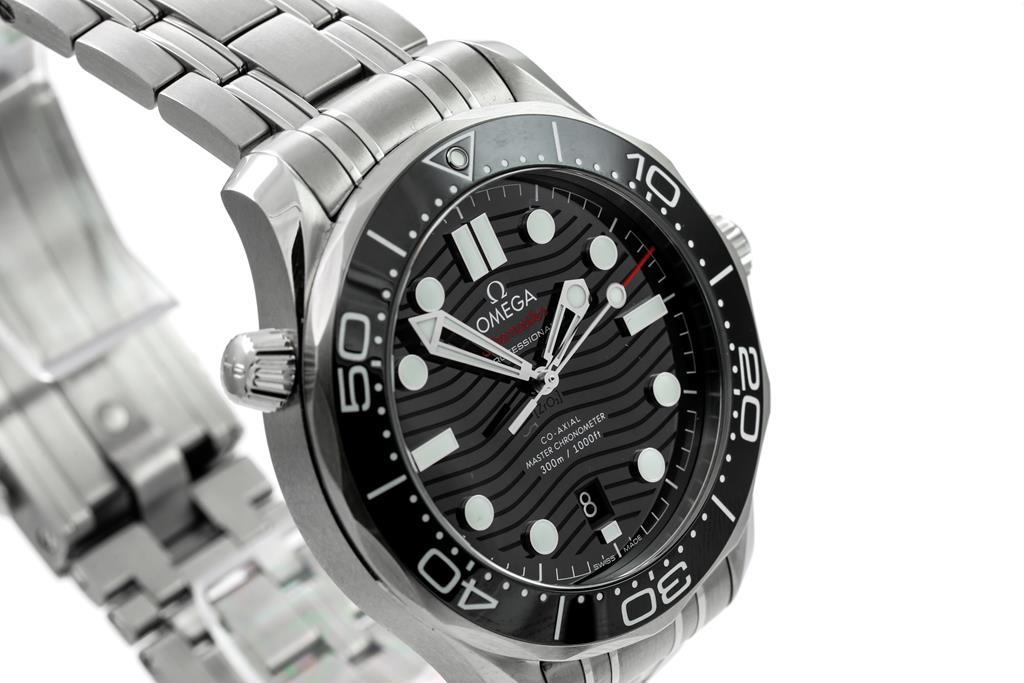 Omega Seamaster Diver stainless steel automatic mens watch. Black dial, date, case diameter: 42mm, wrist size: 20cm, Swiss made. Ref# 210.30.42.20.01.001. With Omega stainless steel bracelet and clasp. With Certificate of Authenticity and Omega box. 3 month FSA warranty. (Pre-owned)
