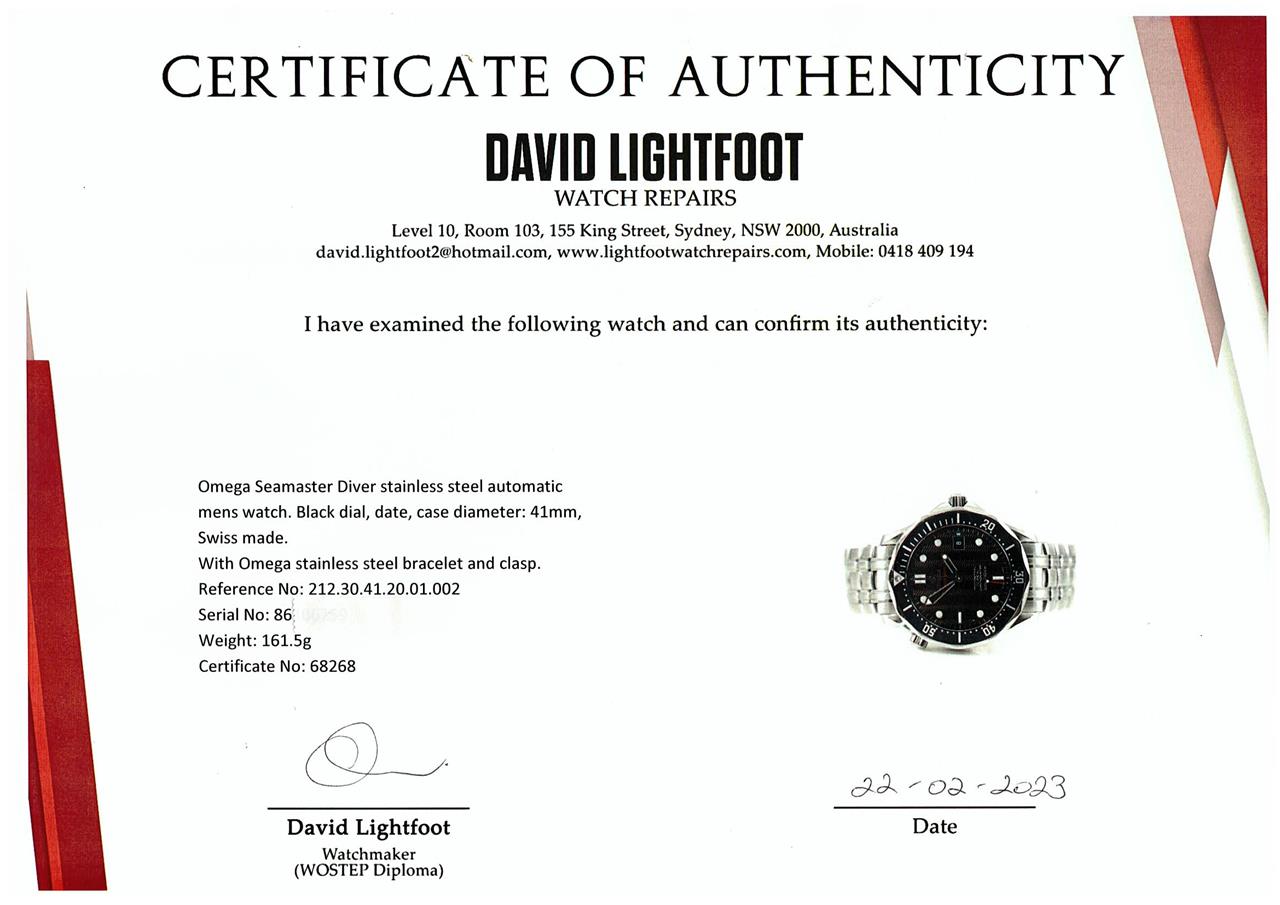 Omega Seamaster Diver stainless steel automatic men's watch. Black dial, date, case diameter: 41mm wrist size: 17cm, Swiss made. Ref# 212.30.41.20.01.002. With Omega stainless steel bracelet and clasp. With Certificate of Authenticity. 12 month David Lightfoot watchmaker warranty from the date of full service.. (Pre-owned)