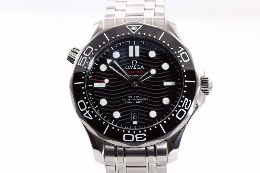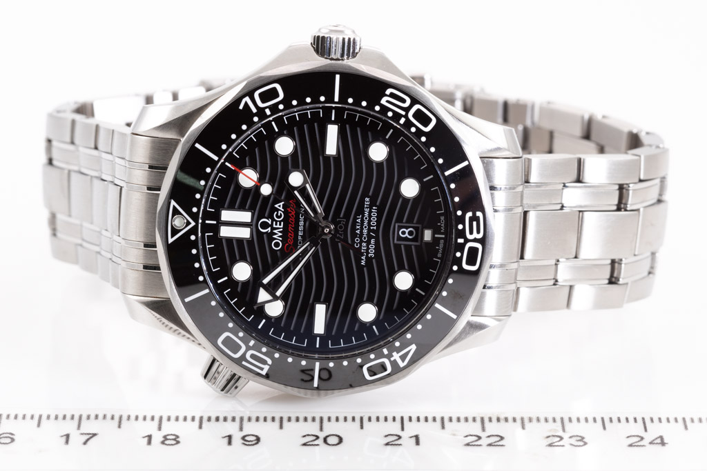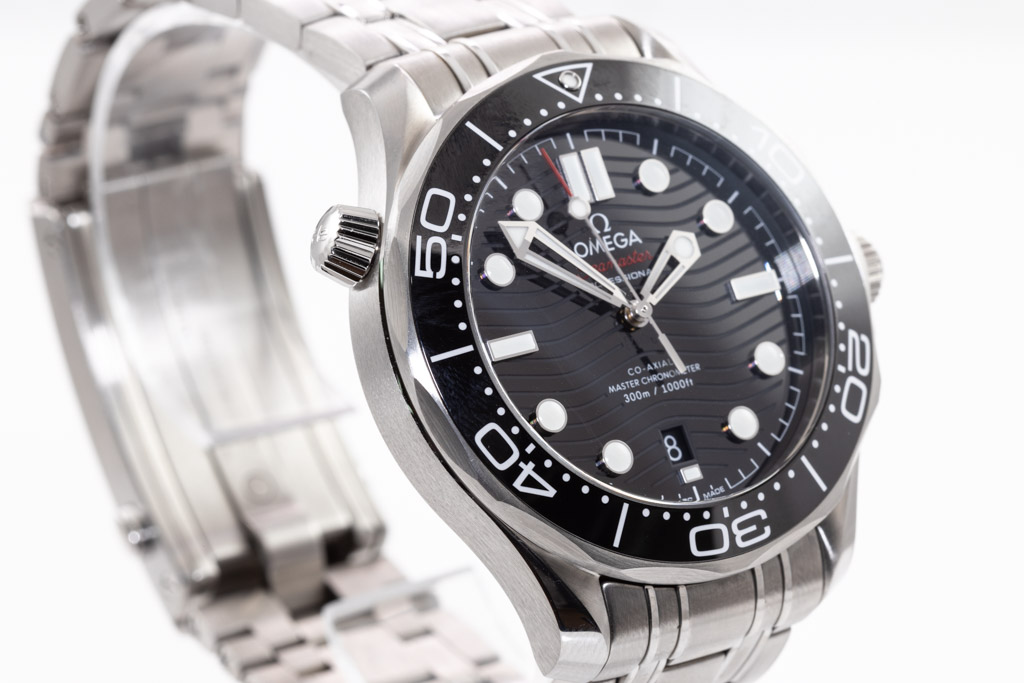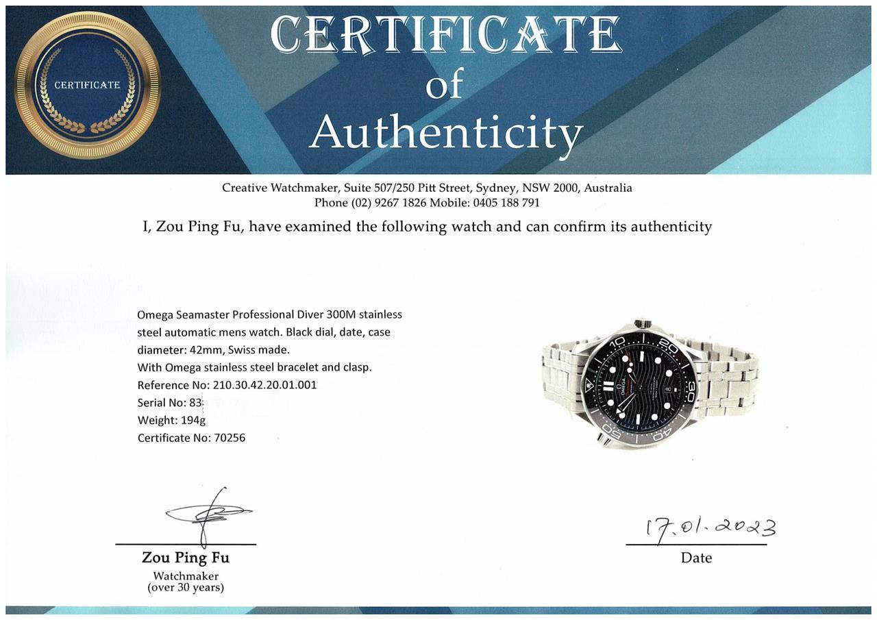 Omega Seamaster Professional Diver 300M stainless steel automatic men's watch. Black dial, date, case diameter: 42mm, wrist size: 20cm, Swiss made. Ref# 210.30.42.20.01.001. With Omega stainless steel bracelet and clasp. With Certificate of Authenticity, Omega International Warranty Card dated 01/10/2020, Master Chronometer Card, Pictograms Card and Omega box. Balance of 5 year Omega manufacturer warranty applies. (Pre-owned)