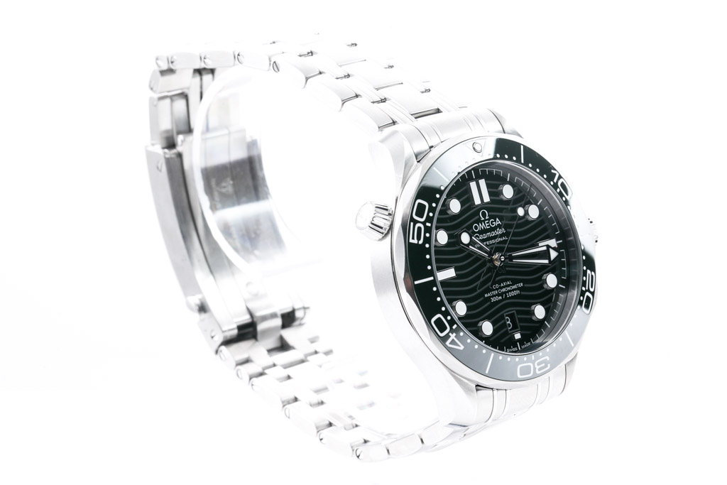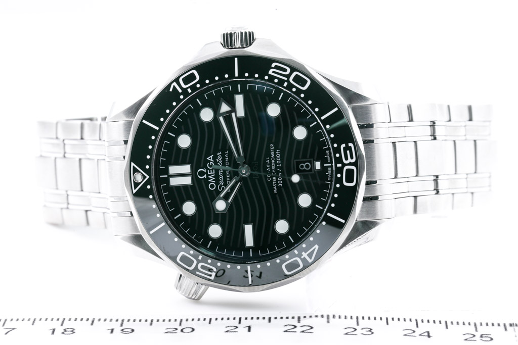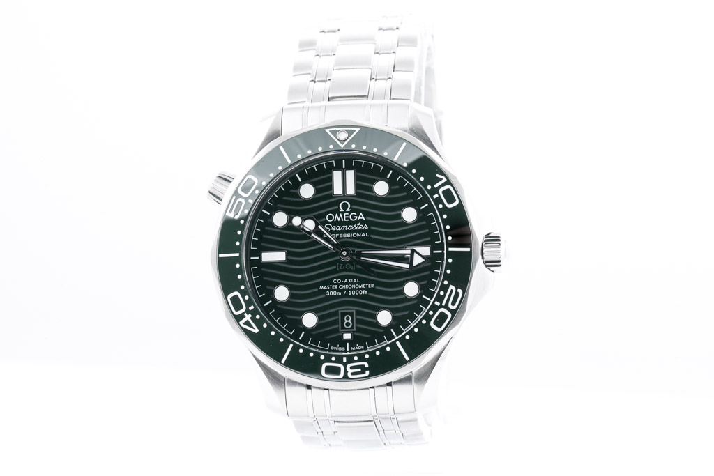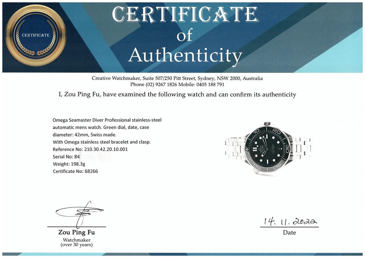 Omega Seamaster Diver Professional stainless steel automatic mens watch. Green dial, date, case diameter: 42mm, wrist size: 21cm, Swiss made. Ref# 210.30.42.20.10.001. With Omega stainless steel bracelet and clasp. With Certificate of Authenticity, Omega International Warranty Card dated 26/05/2022, Master Chronometer Card, Pictograms Card and Omega box. 3 month FSA warranty. (Pre-owned)