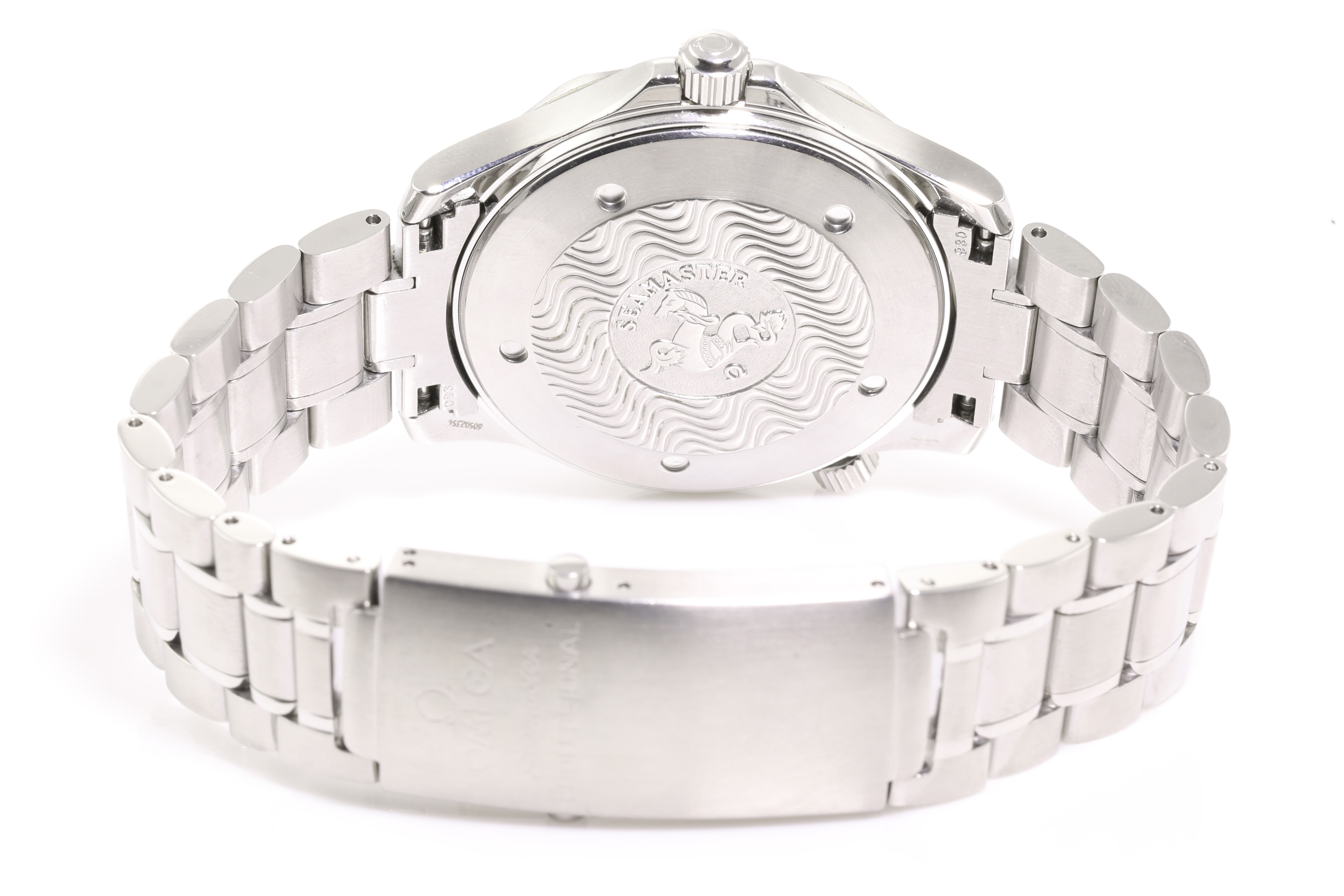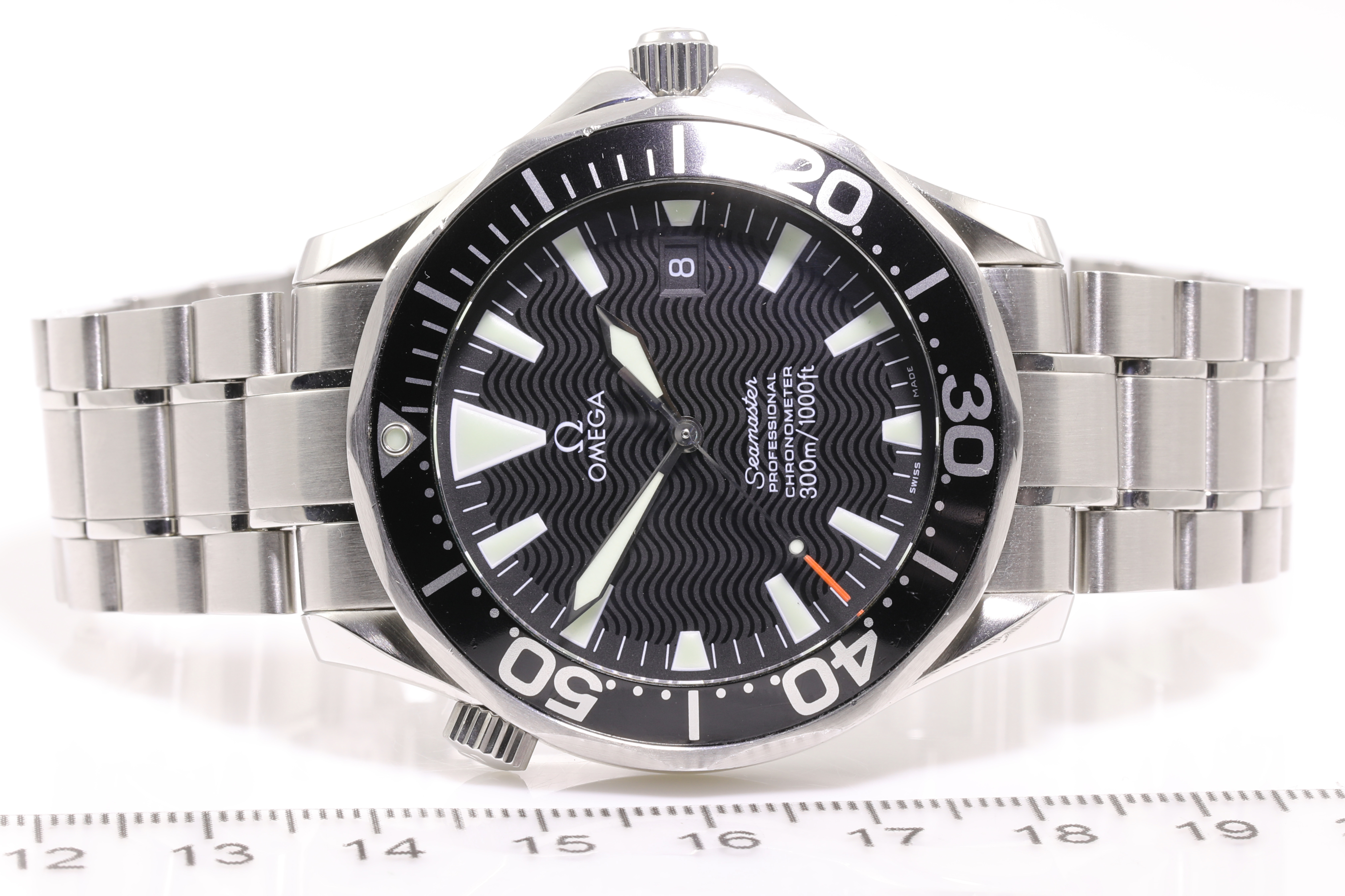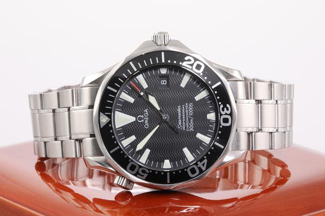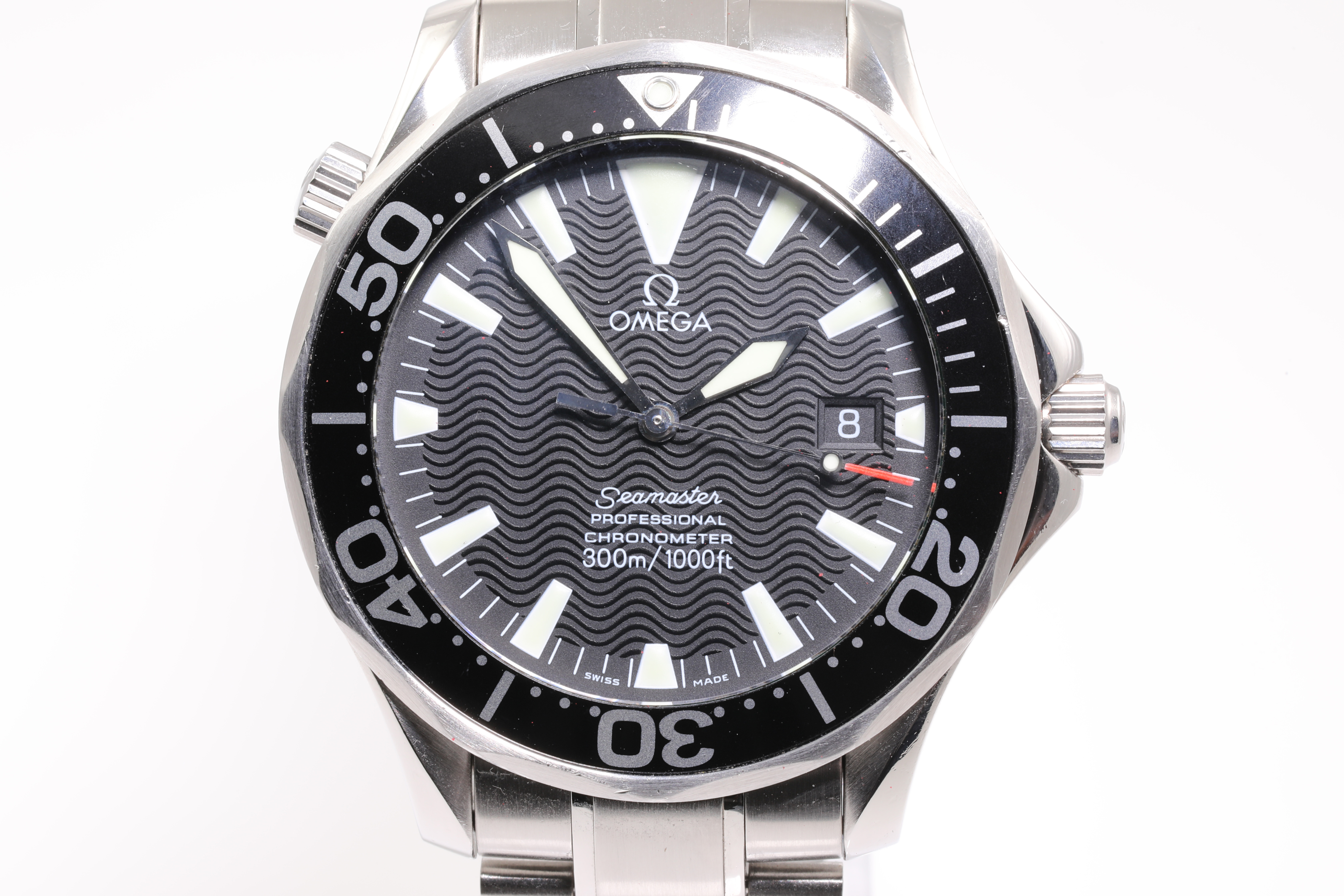 Omega Seamaster stainless steel automatic mens watch. Black dial, date, case diameter: 41mm, wrist size: 19cm, Swiss made. Ref# 2254.50. With Omega stainless steel bracelet and clasp. With certificate of authenticity, Omega International warranty card and Omega box. 3 month FSA warranty. (Pre-owned)