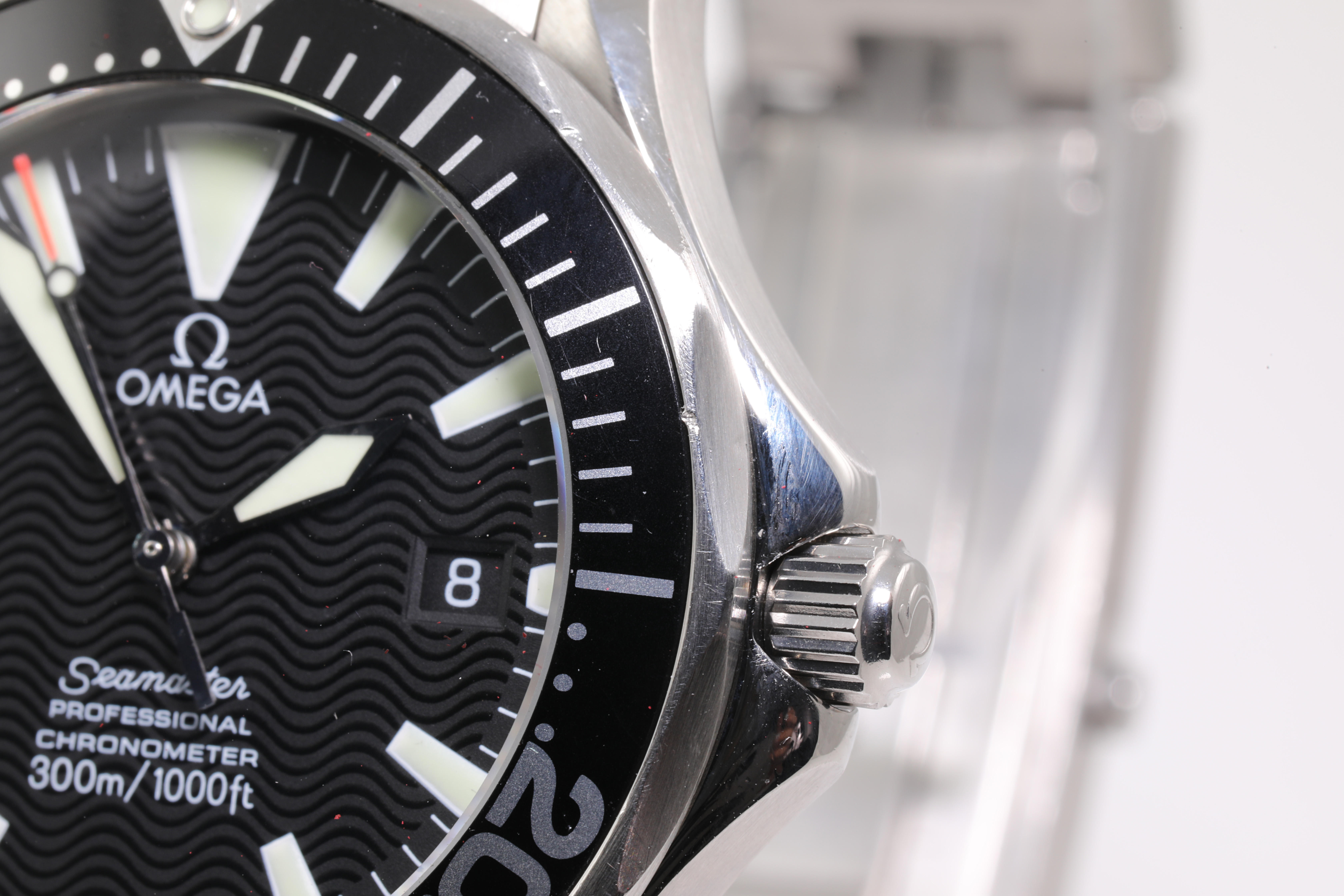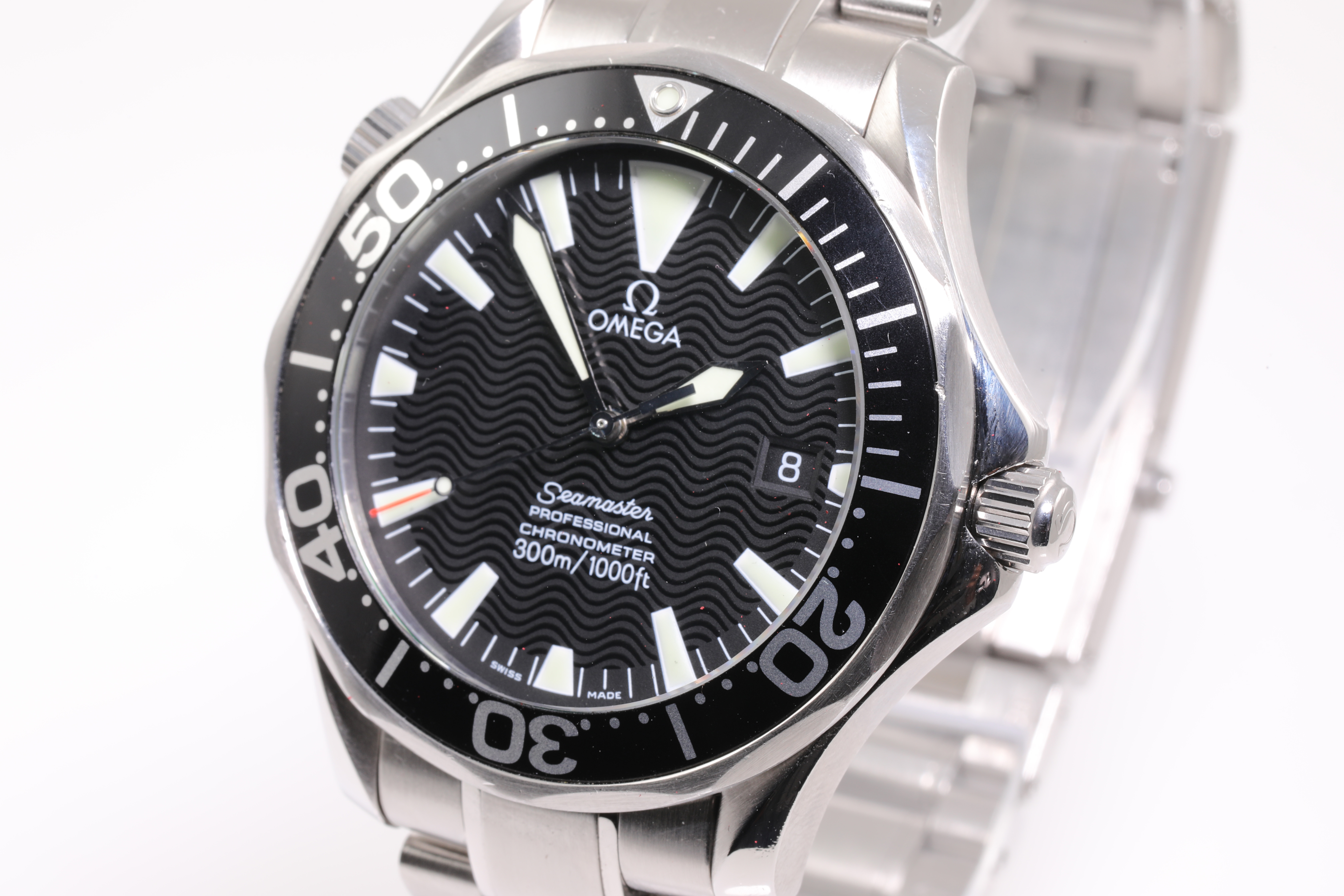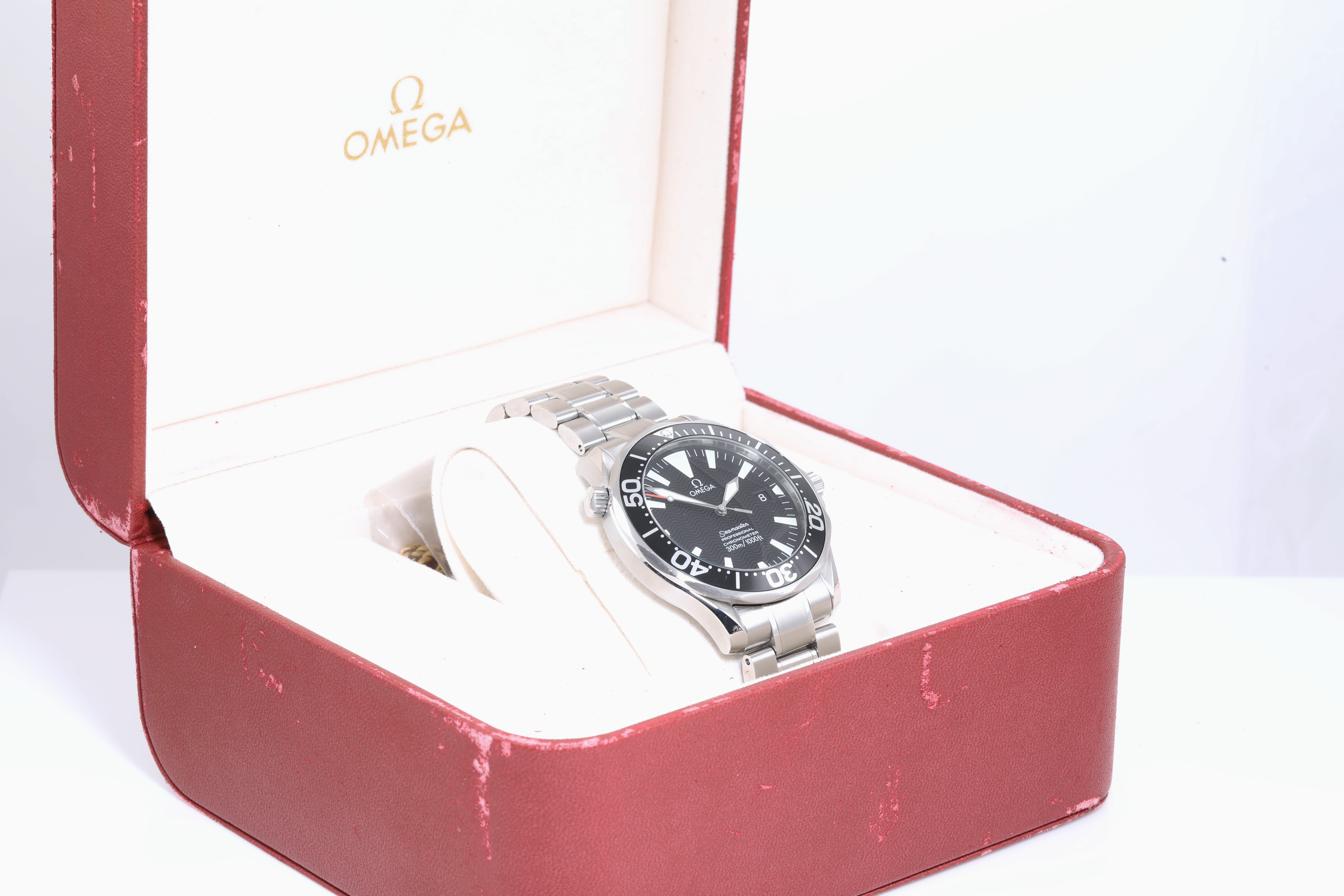 Omega Seamaster stainless steel automatic mens watch. Black dial, date, case diameter: 41mm, wrist size: 19cm, Swiss made. Ref# 2254.50. With Omega stainless steel bracelet and clasp. With certificate of authenticity, Omega International warranty card and Omega box. 3 month FSA warranty. (Pre-owned)