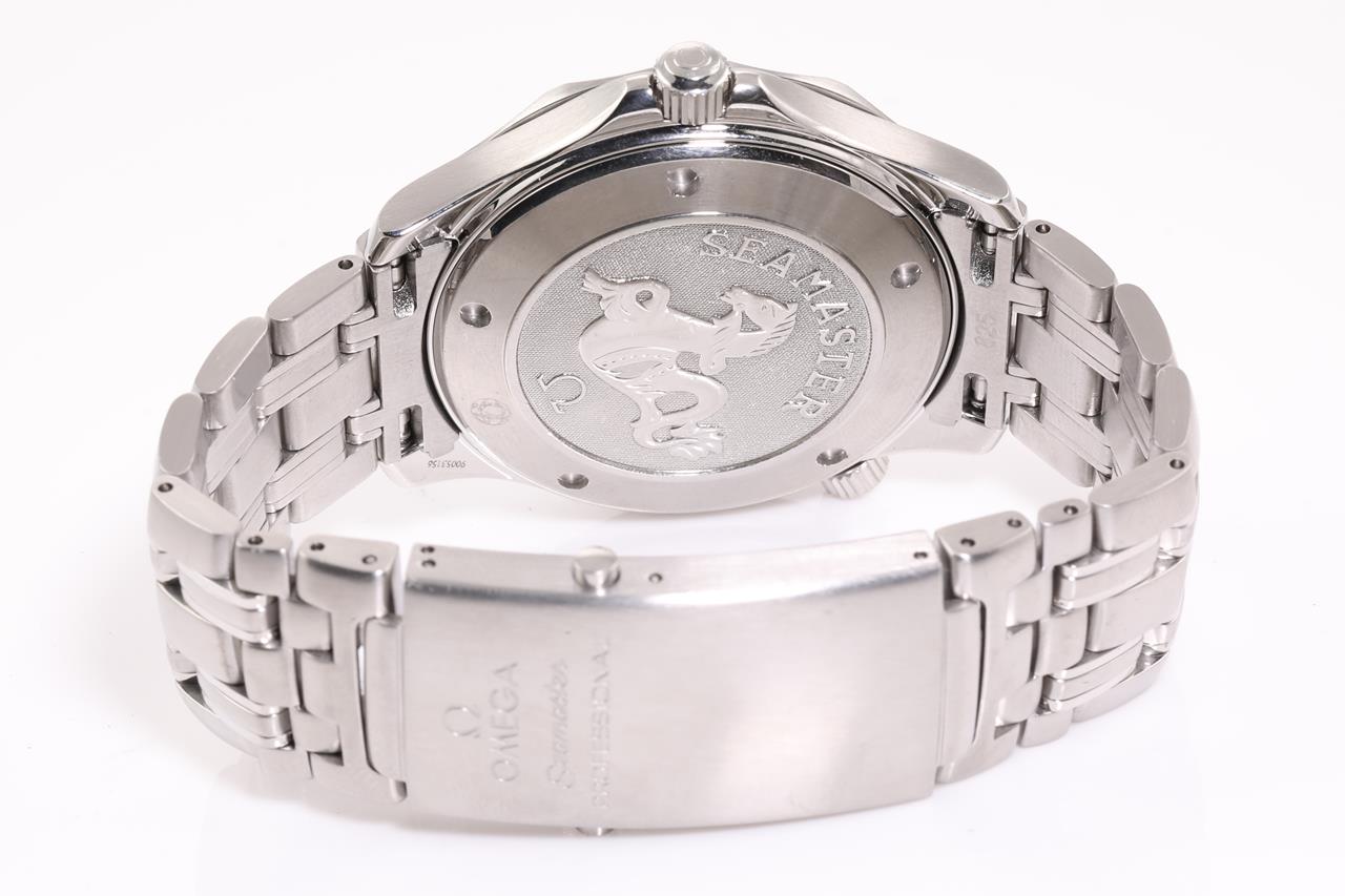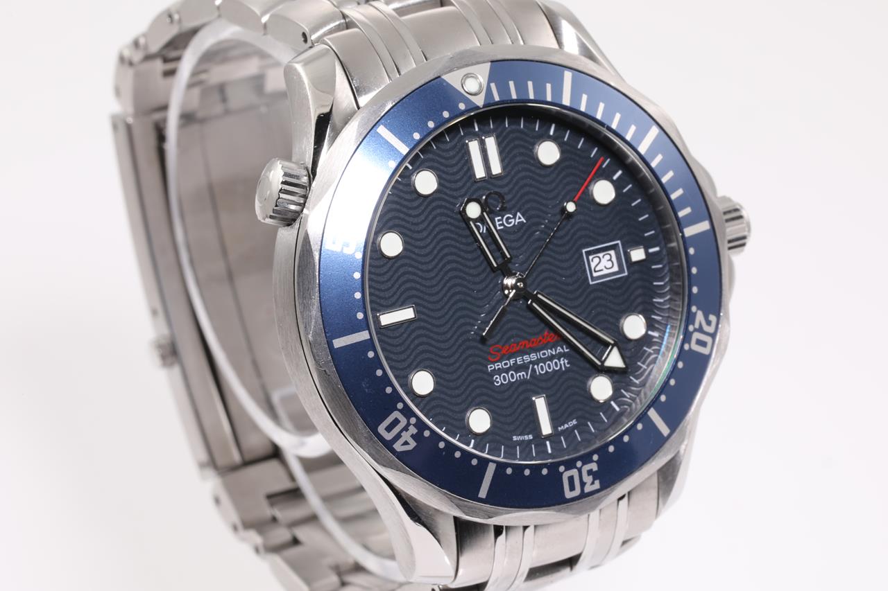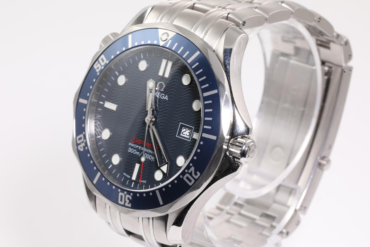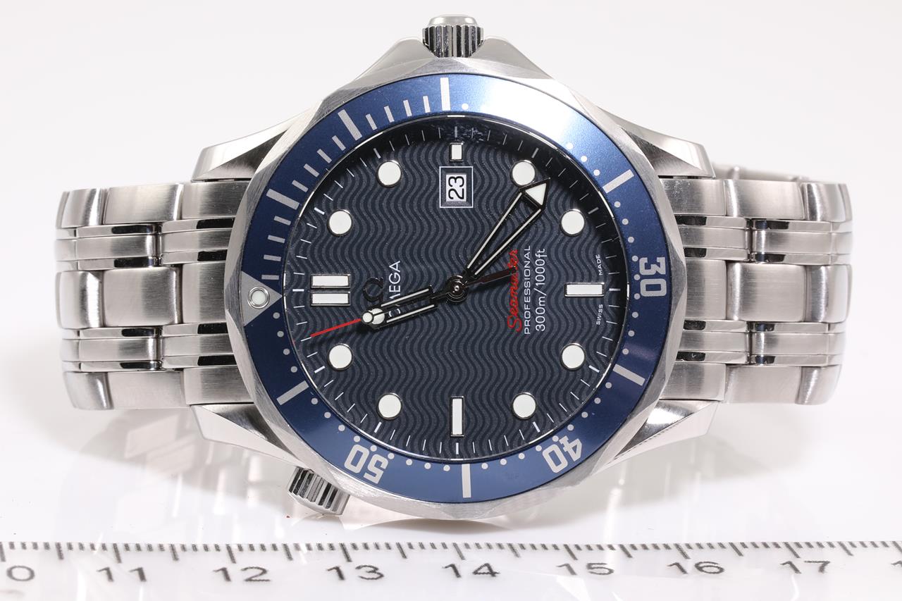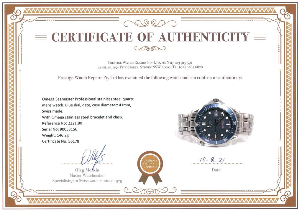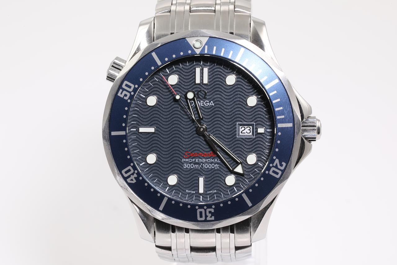 Omega Seamaster Professional stainless steel quartz mens watch. Blue dial, date, case diameter: 41mm, wrist size: 16cm, Swiss made. Ref# 2221.80. With Omega stainless steel bracelet and clasp. With Certificate of authenticity. 3 month FSA warranty. (Pre-owned)