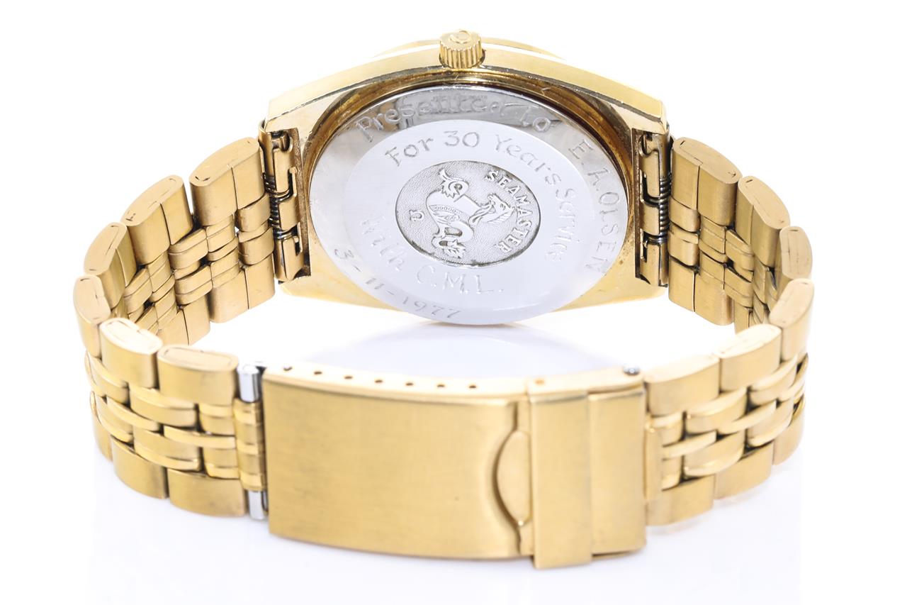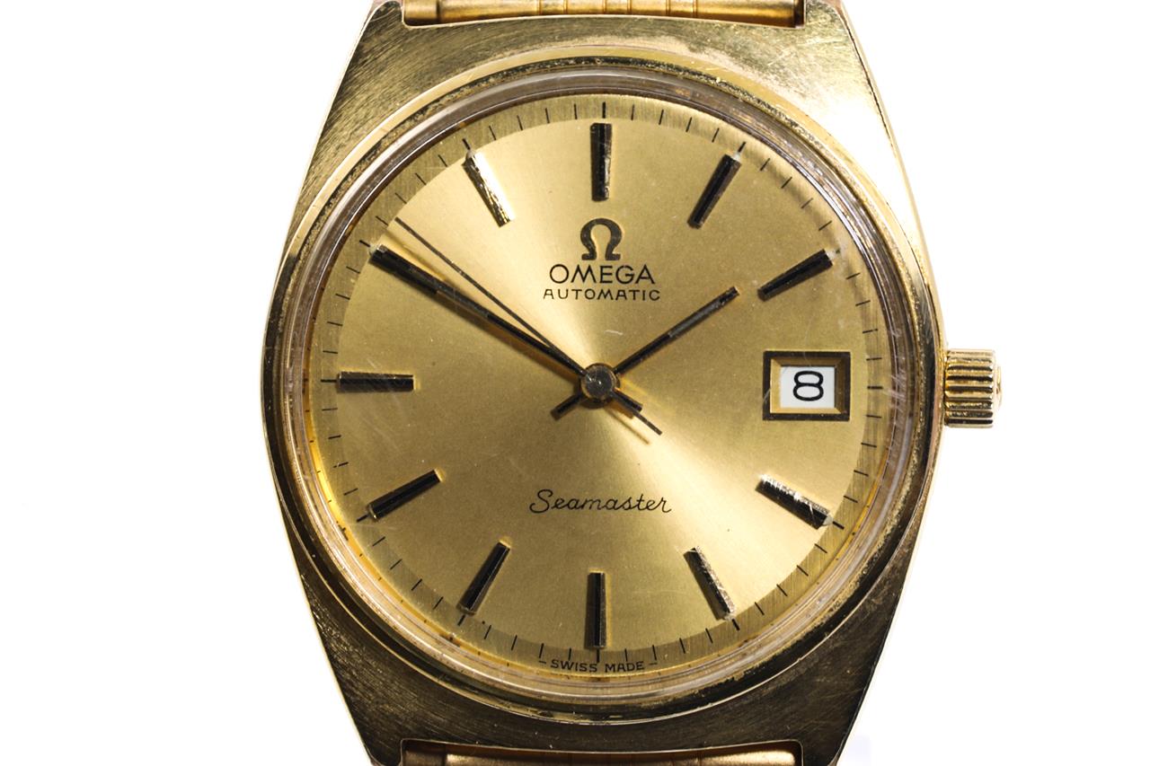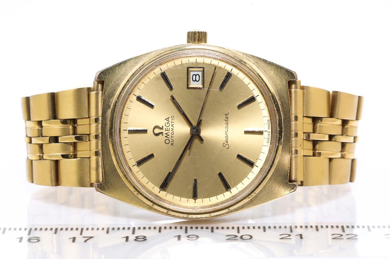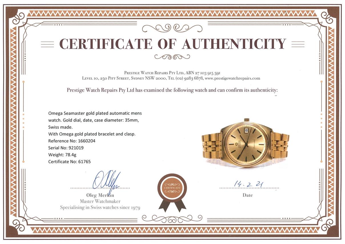 Omega Seamaster gold plated automatic mens watch. Gold dial, date, case diameter: 35mm, wrist size: 16cm, Swiss made. Ref# 1660204. With Omega gold plated bracelet and clasp. With Certificate of Authenticity. 6 month Prestige Watchmaker Warranty from the date of full service. (Pre-owned)