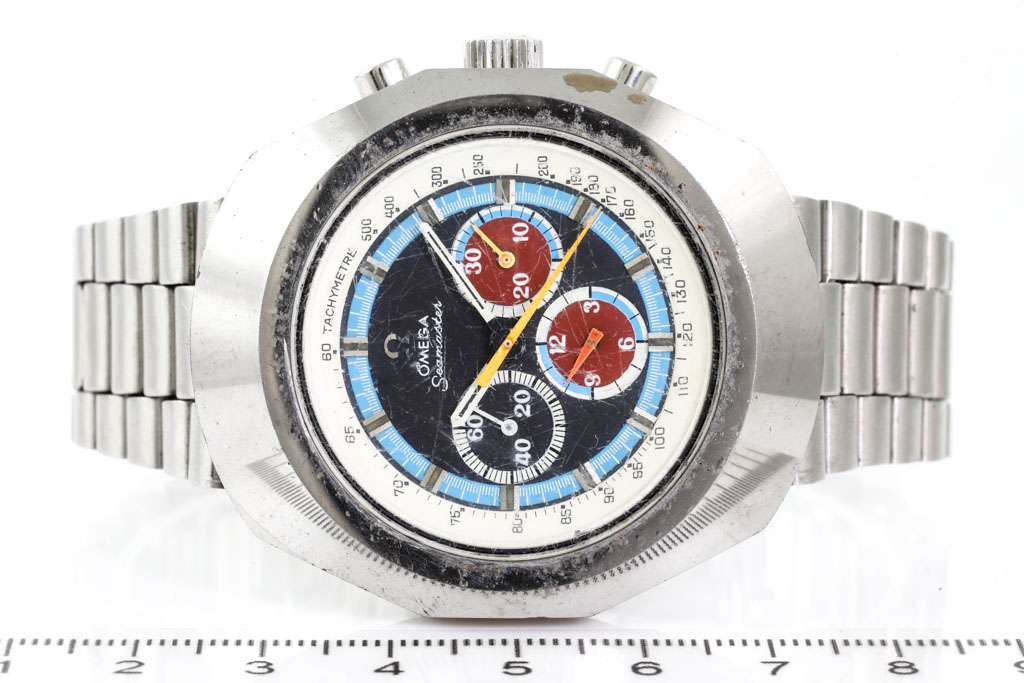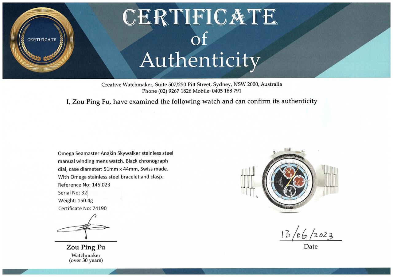 Omega Seamaster Anakin Skywalker stainless steel manual winding mens watch. Black chronograph dial, case diameter: 51mm x 44mm, wrist size: 20cm, Swiss made. Ref# 145.023. With Omega stainless steel bracelet and clasp. With Certificate of Authenticity. 3 month FSA warranty (Pre-owned)